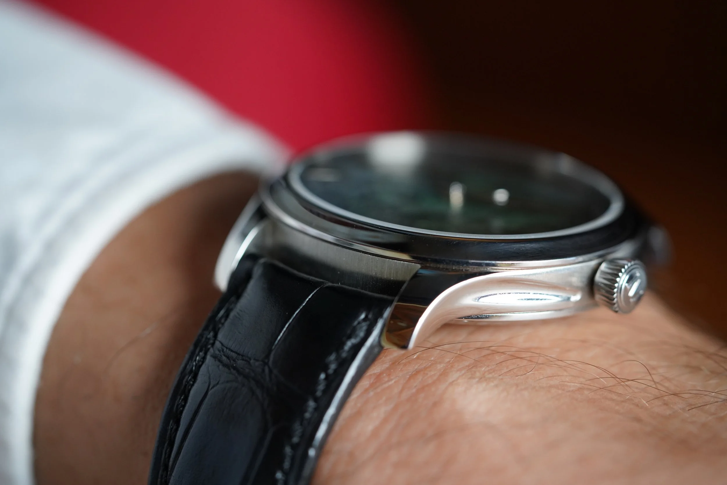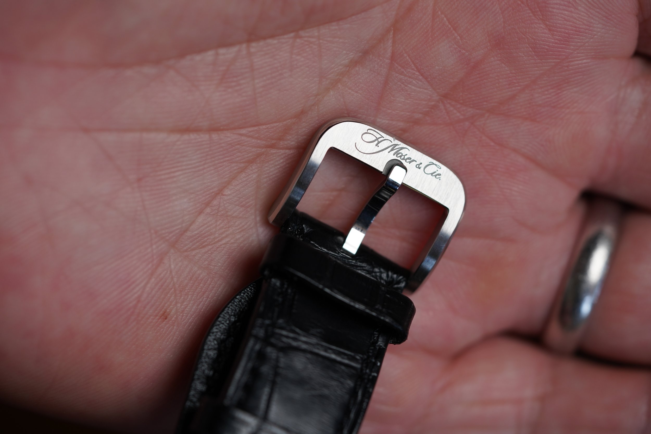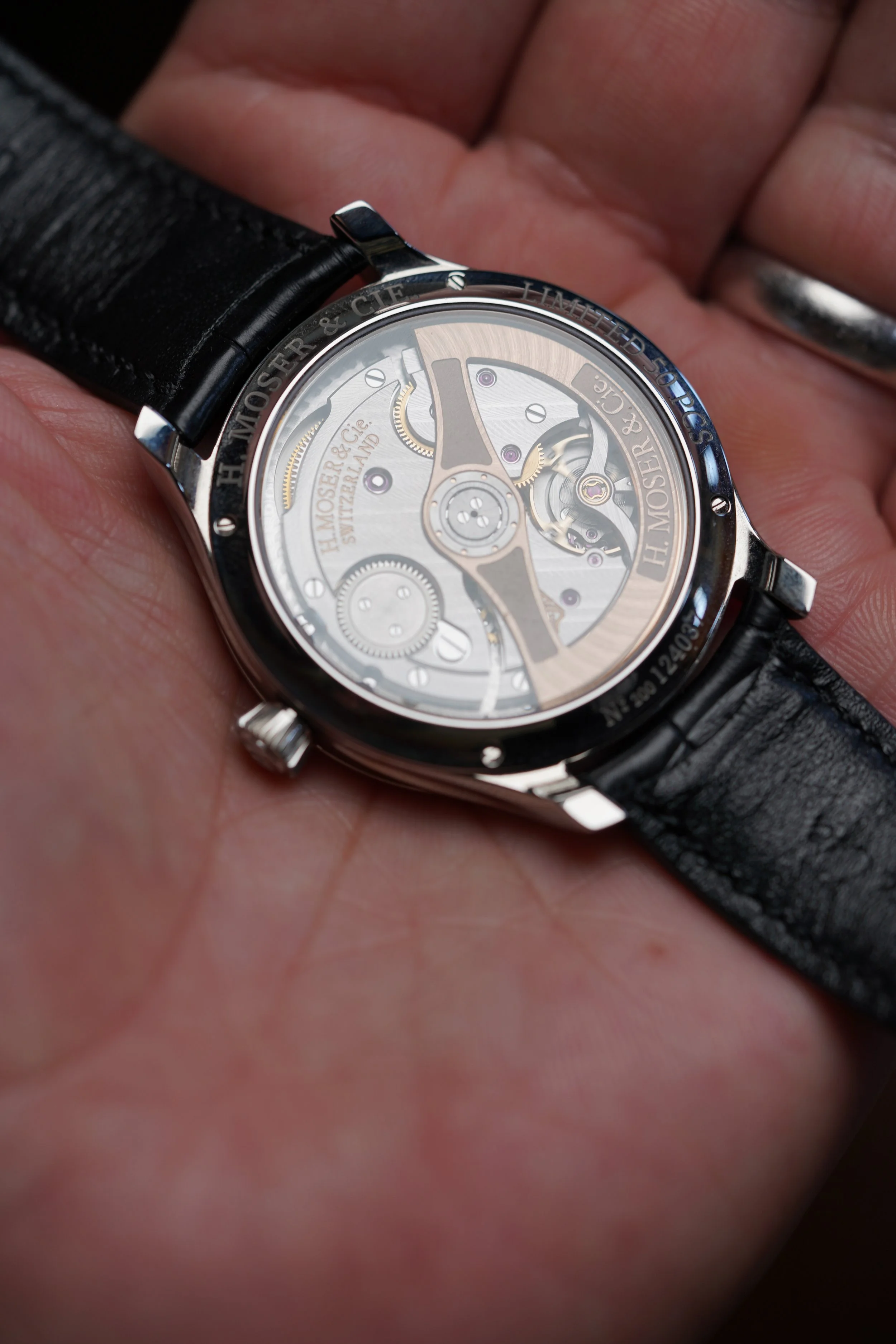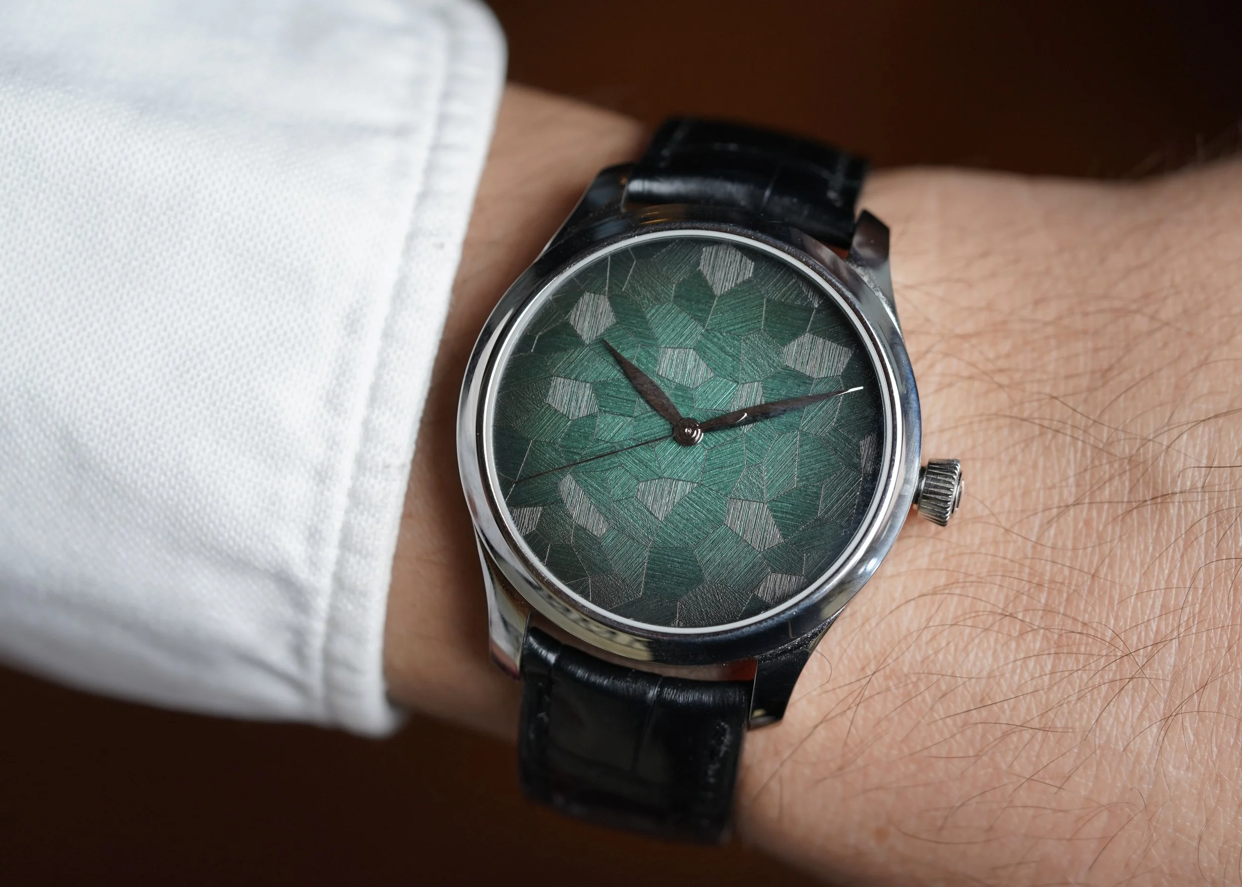 This Moser Endeavor is a 40mm steel watch with a Green Fumé mosaic dial, a process achieved by brushing individually fragmented dial elements. The watch also features a sapphire exhibition case-back. Displaying the HMC200 movement. It is paired with an alligator leather strap and gold Moser buckle. Both of which are likely original to the watch. The case is in exceptional condition and appears to be unpolished. The watch dates to 2022