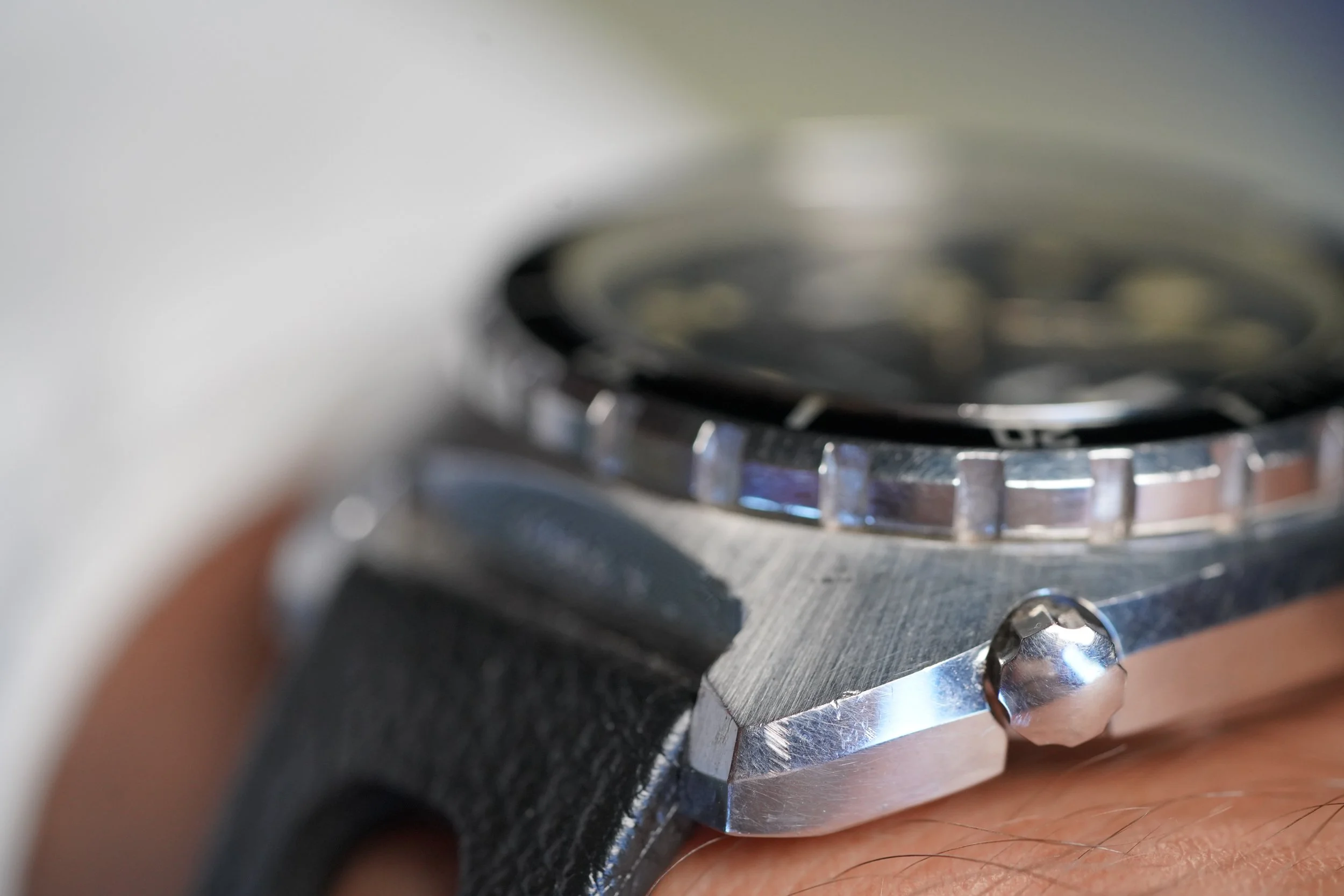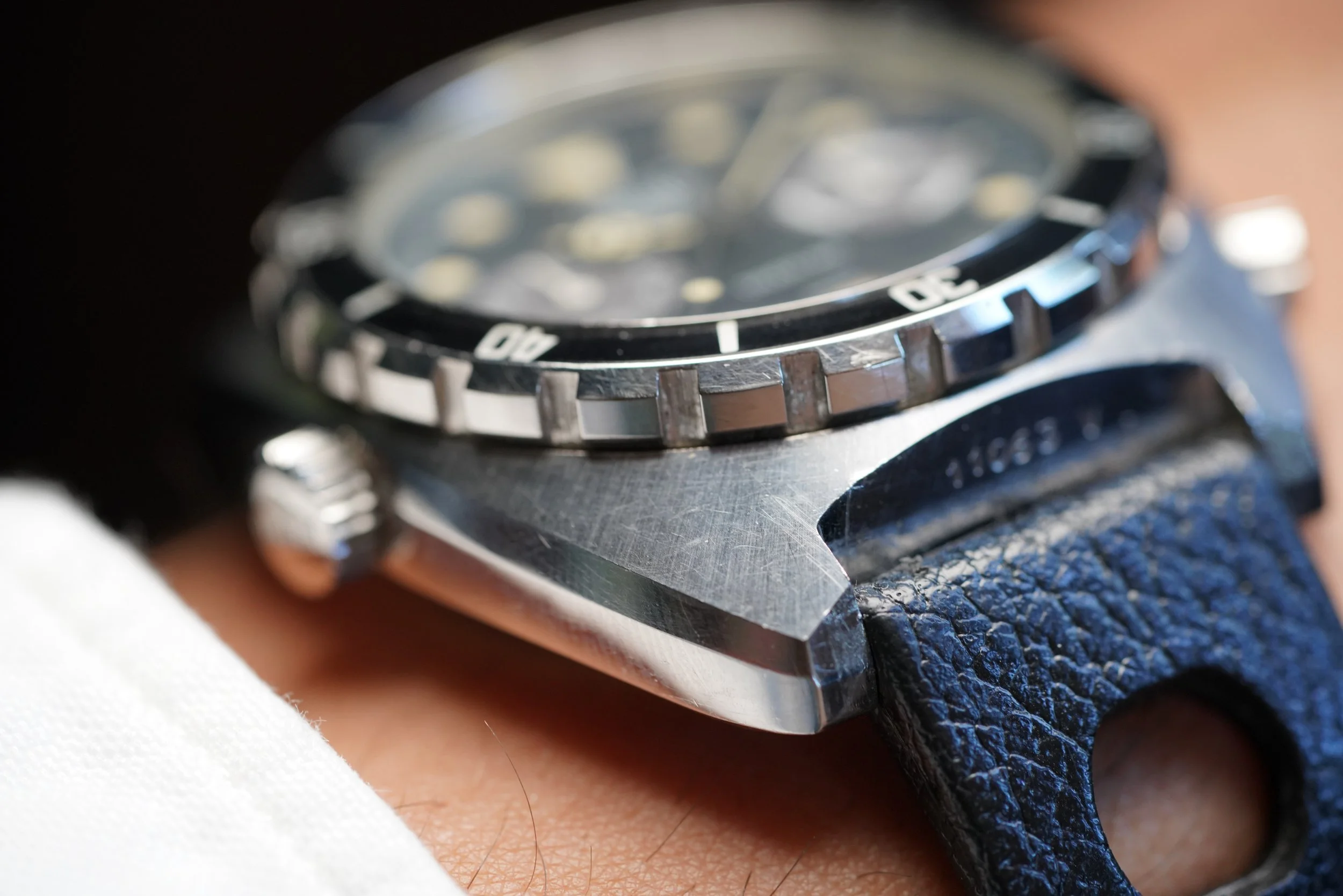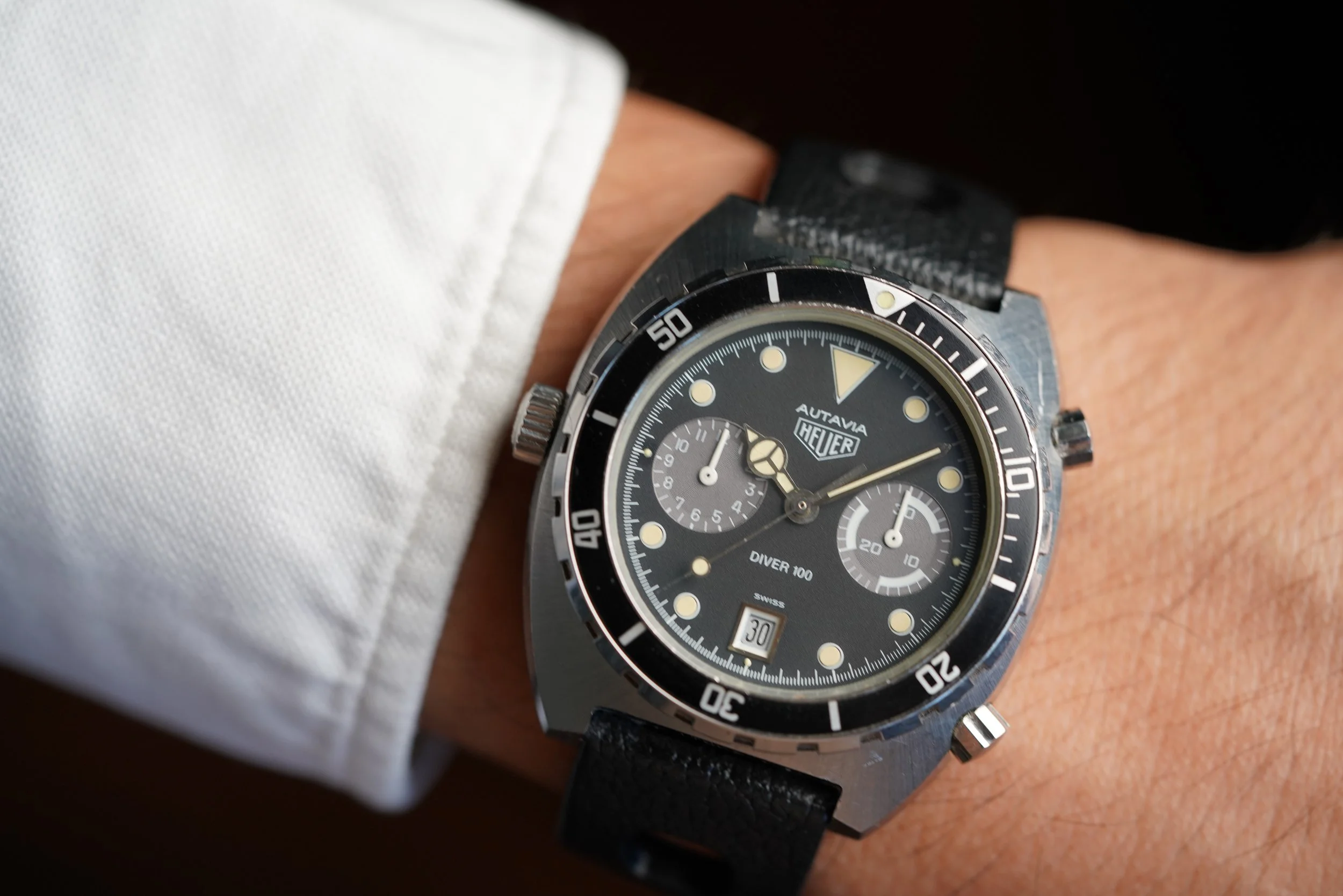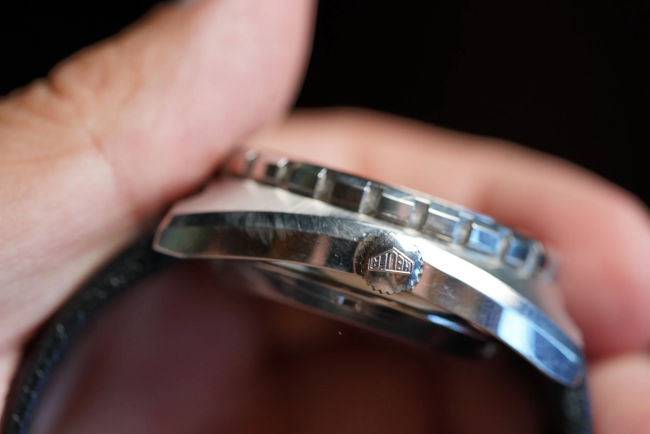 The Heuer Autavia 11063P Diver 100 is one of the very cool diving chronographs from Heuer. The case appears to be unpolished. It measures 42mm in diameter. It is powered by the Buren calibre 12.