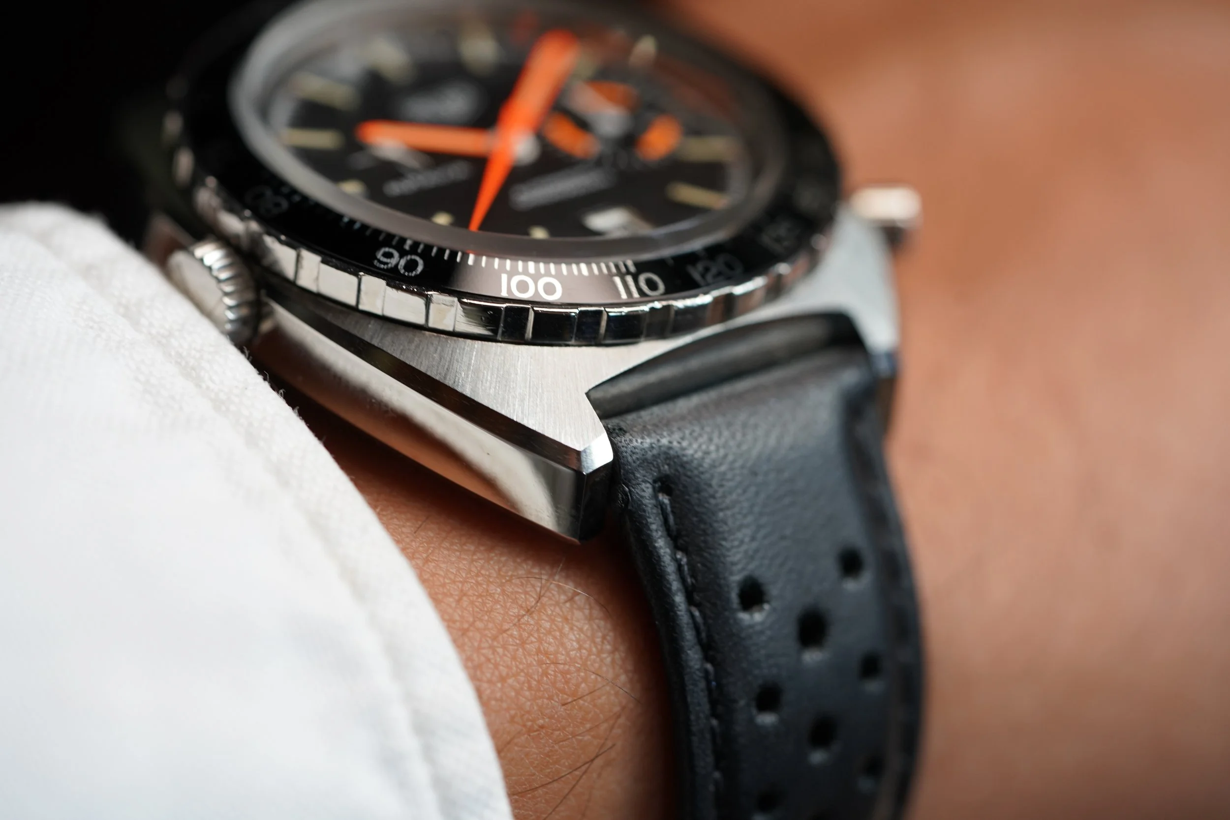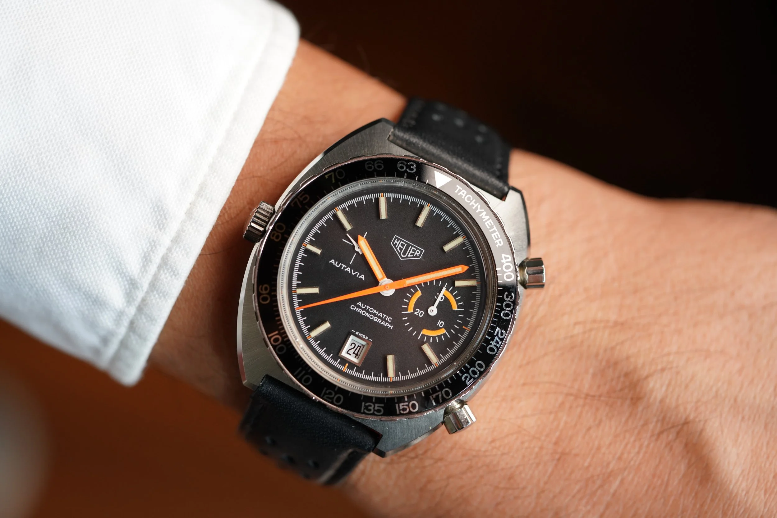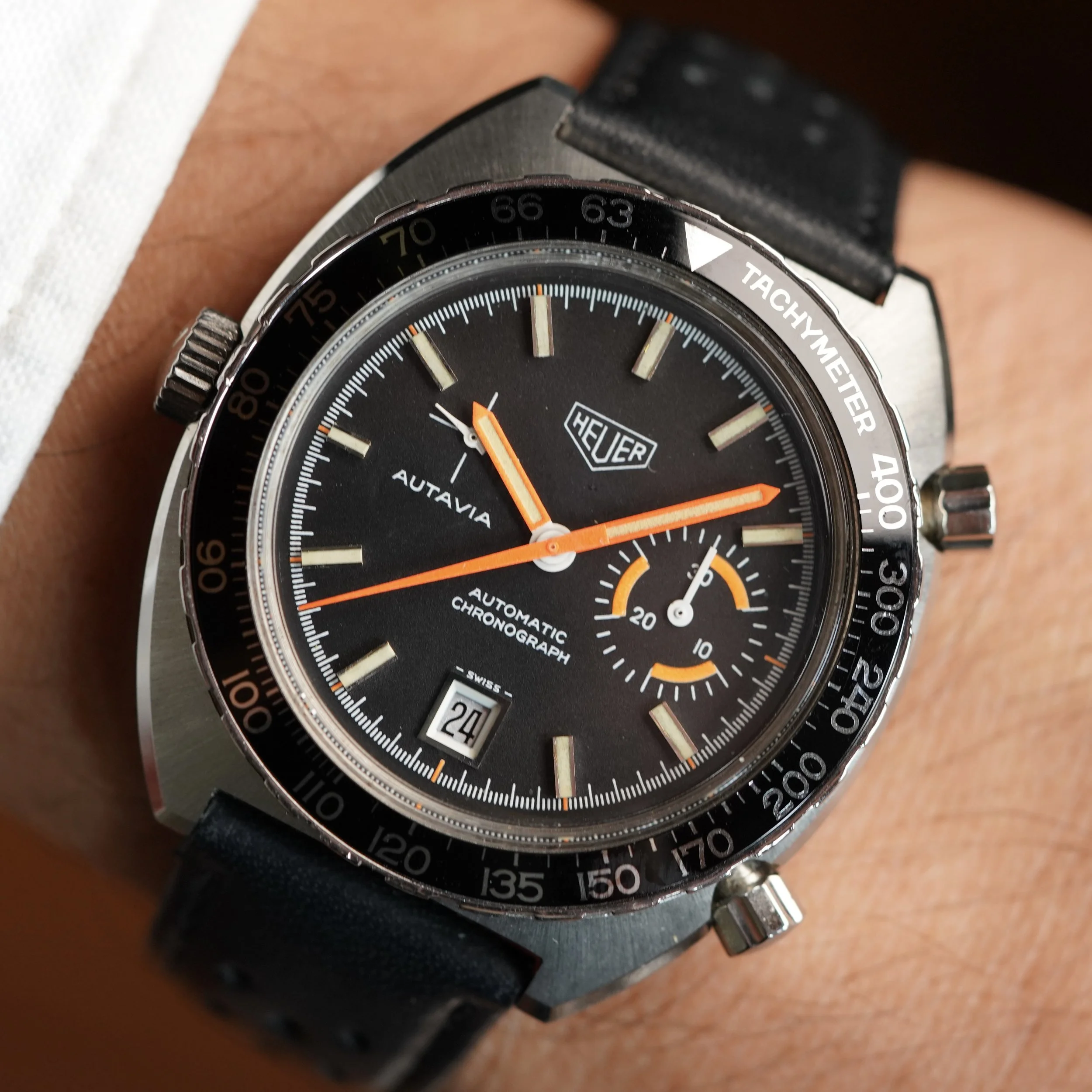 This Heuer Autavia reference 1563T is an incredibly cool sports chronograph. It features the same case as the reference 1163V. Looking at the dial, you will notice the smaller subsidiary seconds at 10 o’clock, and the 30 minute register at 3 o’clock giving it a very cool asymmetrical dial. With orange accents, it is just a great look. The watch is powered by the calibre 15. The case appears to be unpolished.