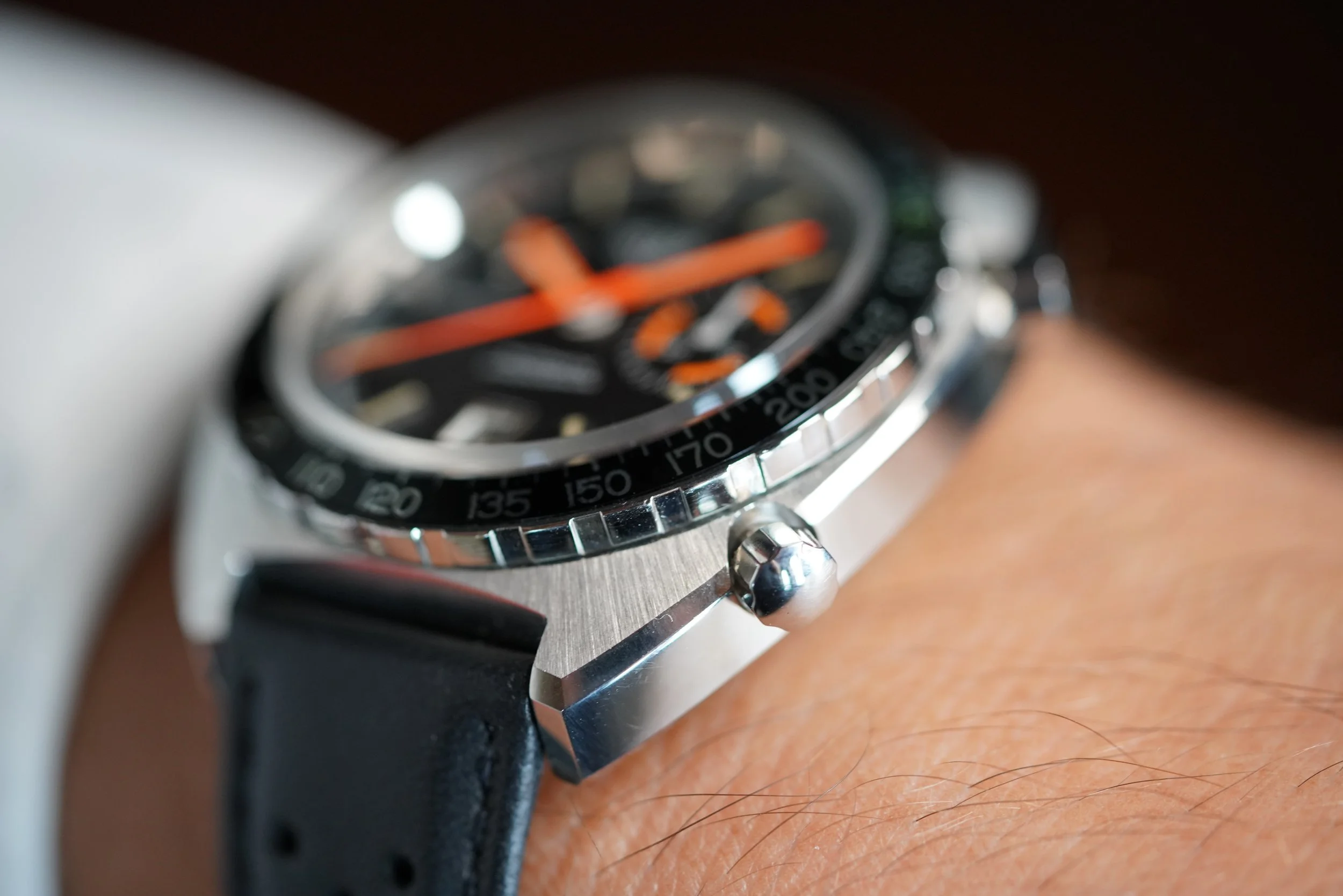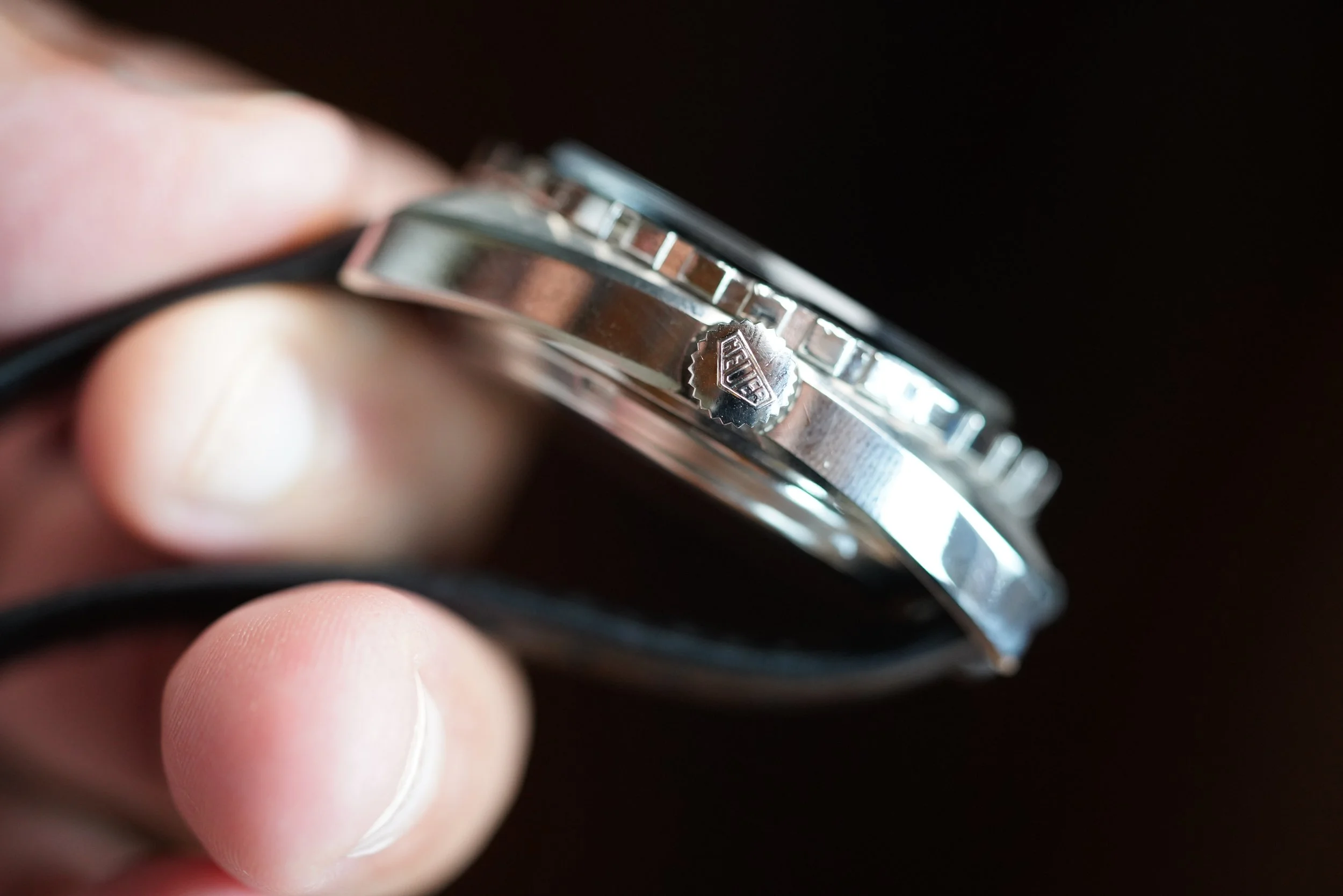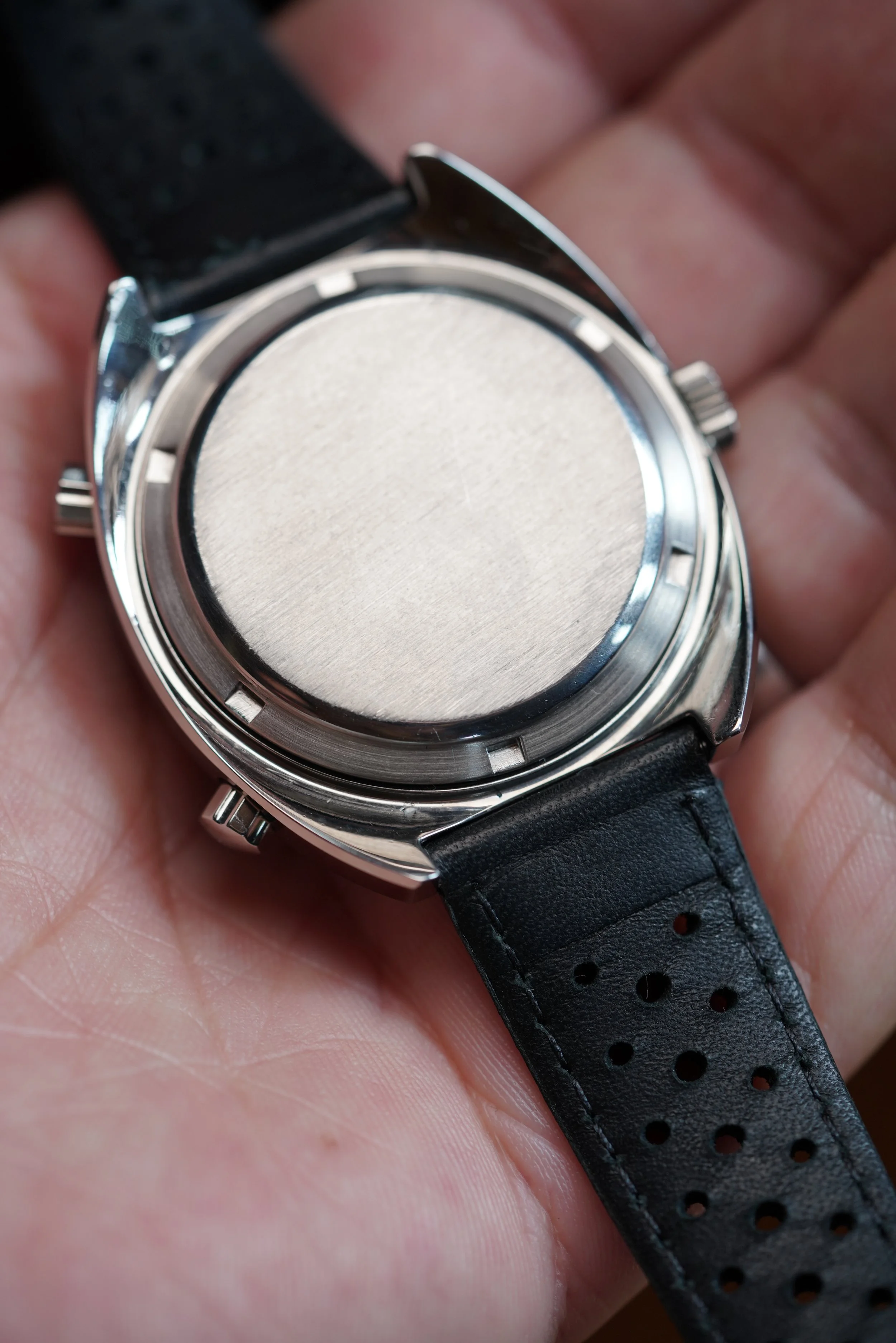 This Heuer Autavia reference 1563T is an incredibly cool sports chronograph. It features the same case as the reference 1163V. Looking at the dial, you will notice the smaller subsidiary seconds at 10 o’clock, and the 30 minute register at 3 o’clock giving it a very cool asymmetrical dial. With orange accents, it is just a great look. The watch is powered by the calibre 15. The case appears to be unpolished.
