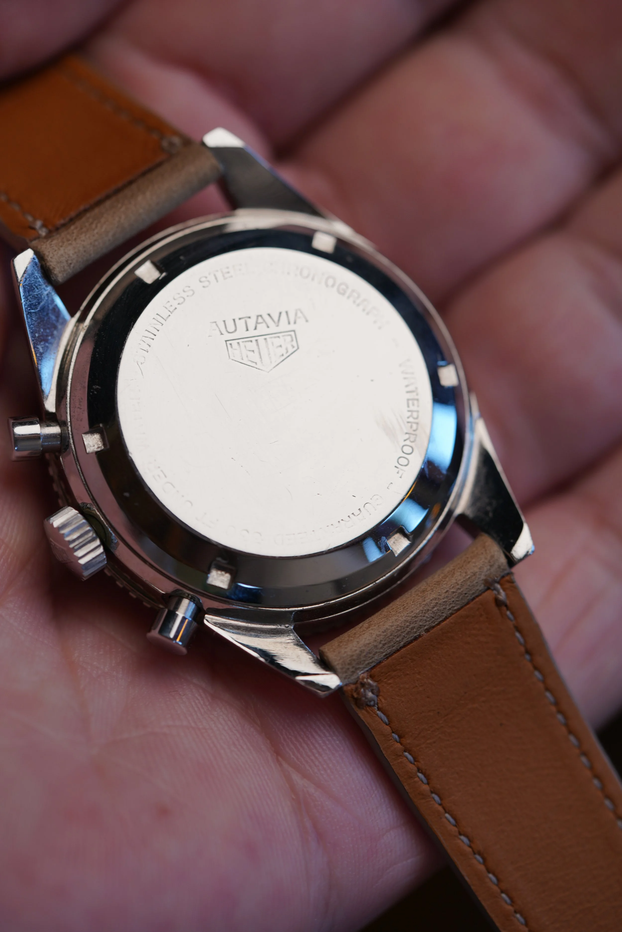 Along with many of its contemporaries of the era, it is powered by the Valjoux 72. This example is the first generation case of the Autavia with larger subdials. The dimensions are 38mm (48mm lug-to-lug). The cases are made Huguenin Freres. The case has been lightly polished.