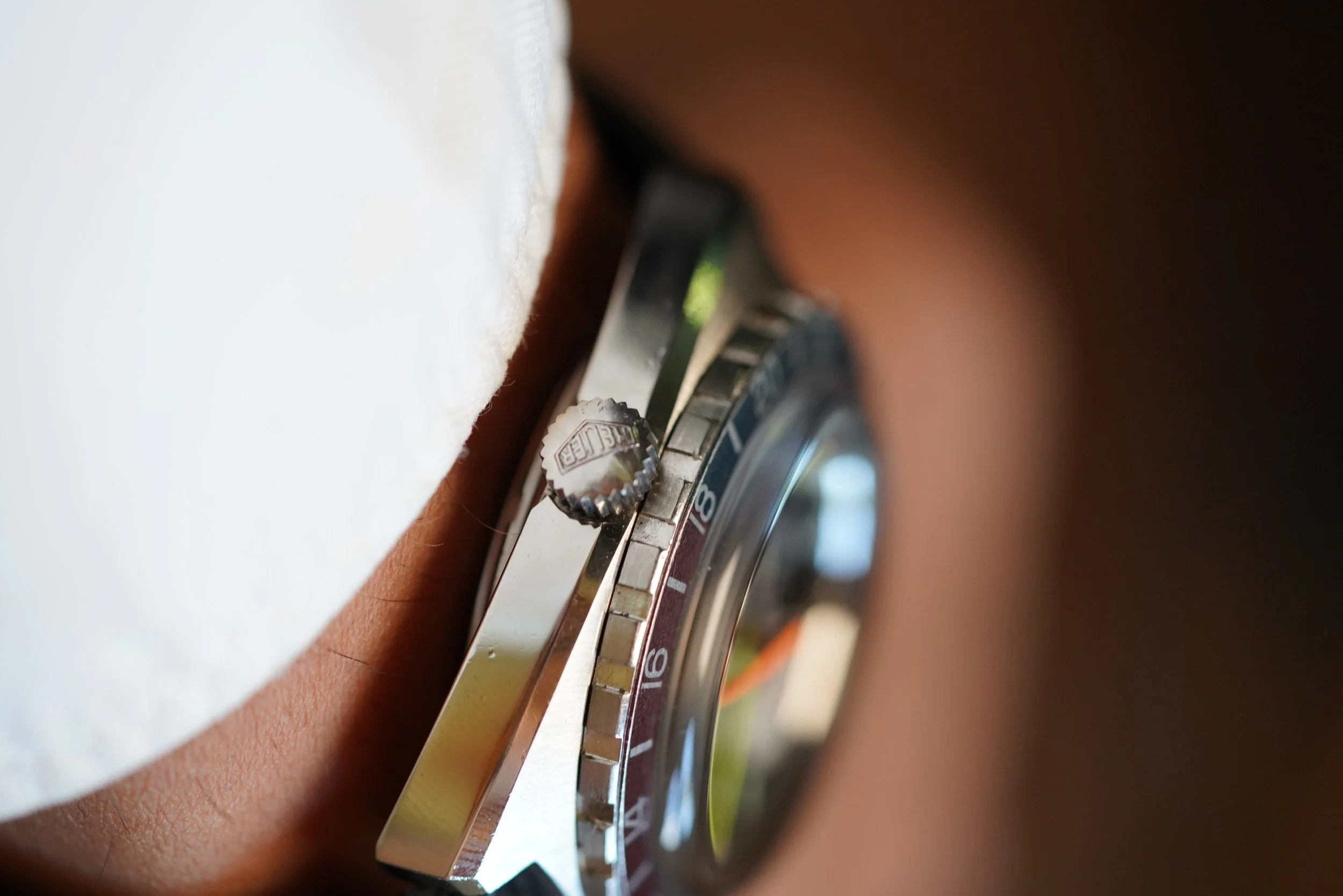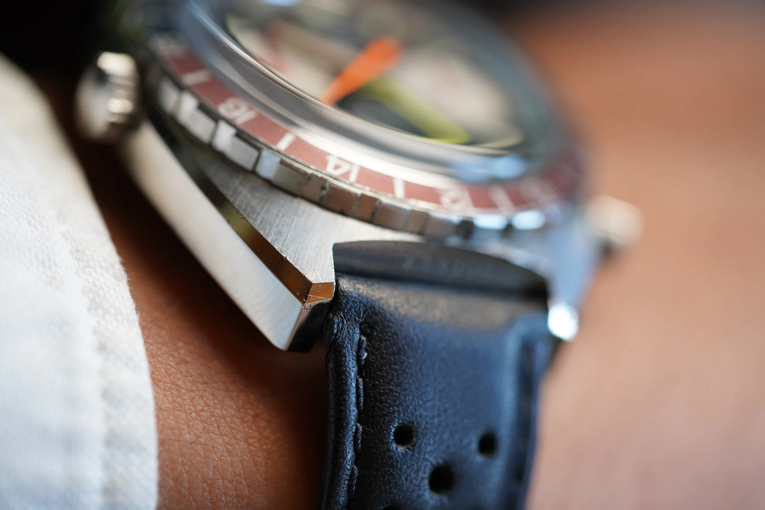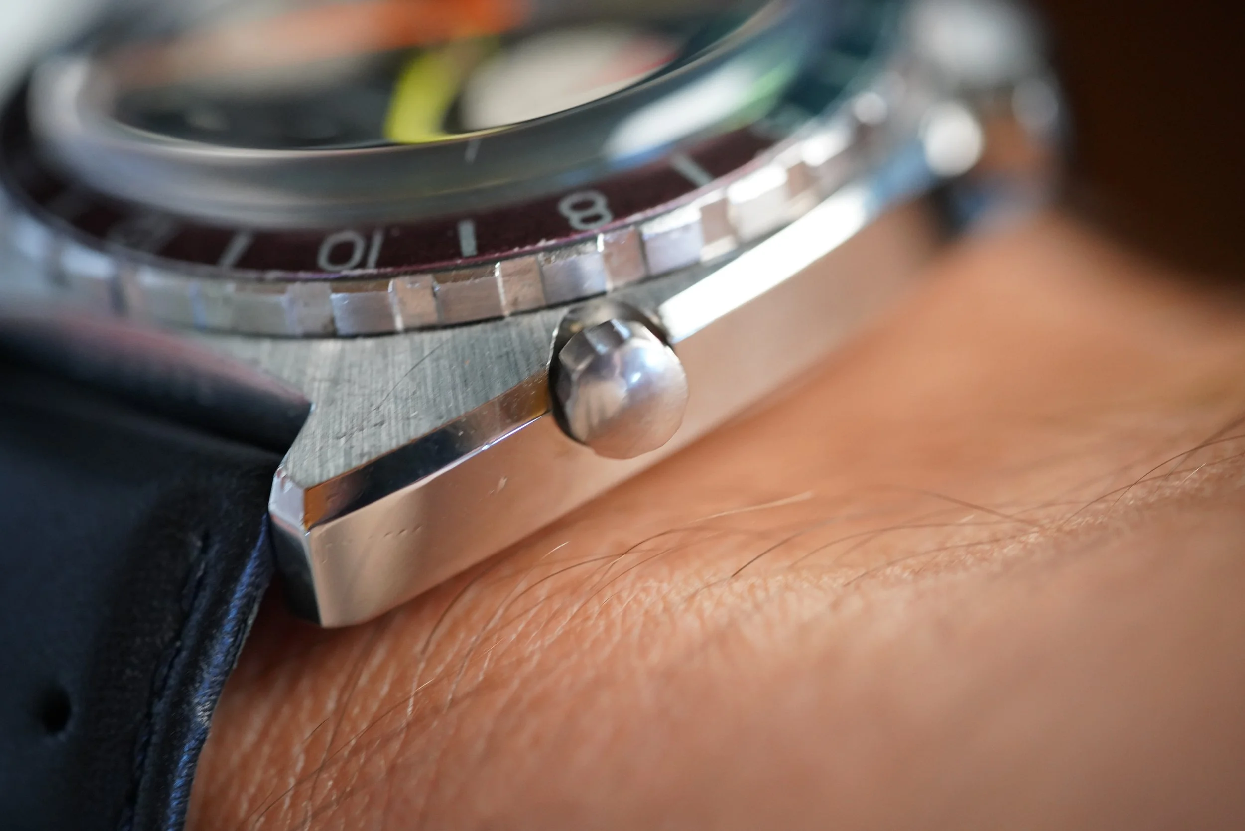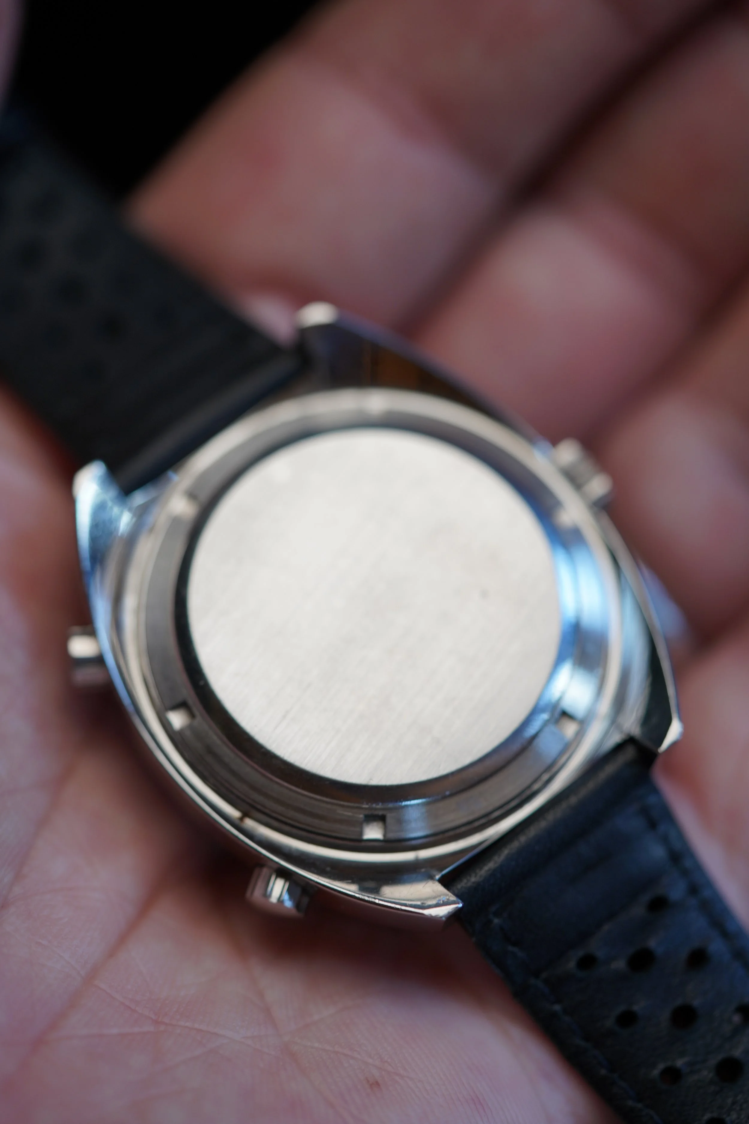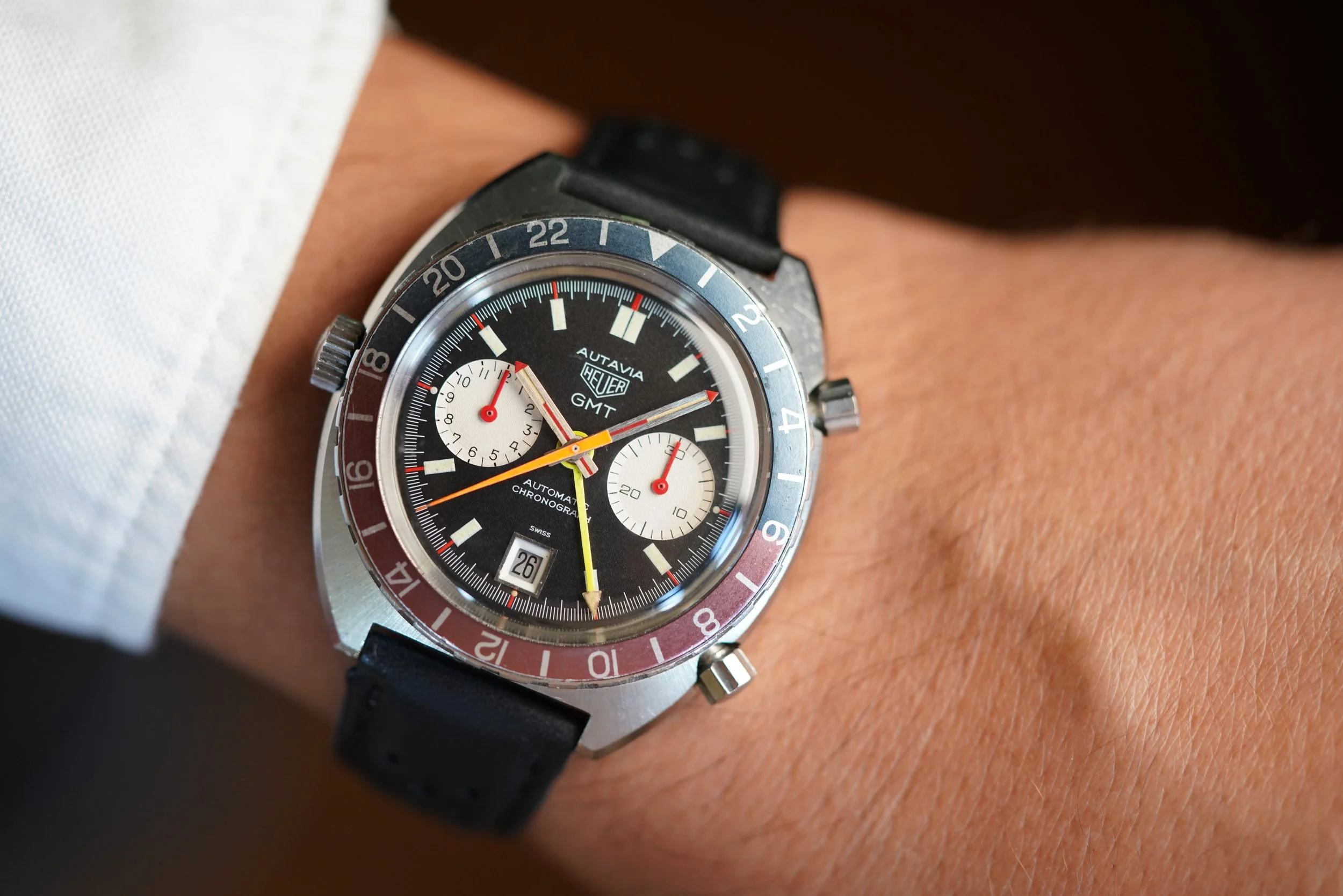 In my opinion, the Heuer Autavias are some of the best buys in vintage watches. They feature very large cases, which are very enjoyable on the wrist. This reference features a stainless steel case which measures 43mm in diameter (approximately 47mm lug-to-lug). It has been polished. The dial is in great condition, and the bezel insert displays an attractive faded patina. The watch is paired with a black rally strap.