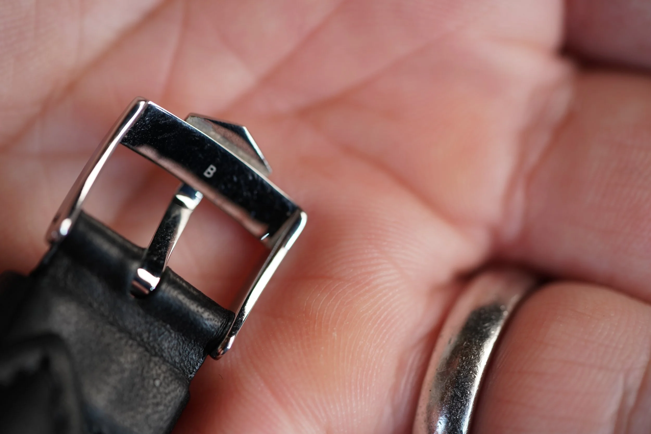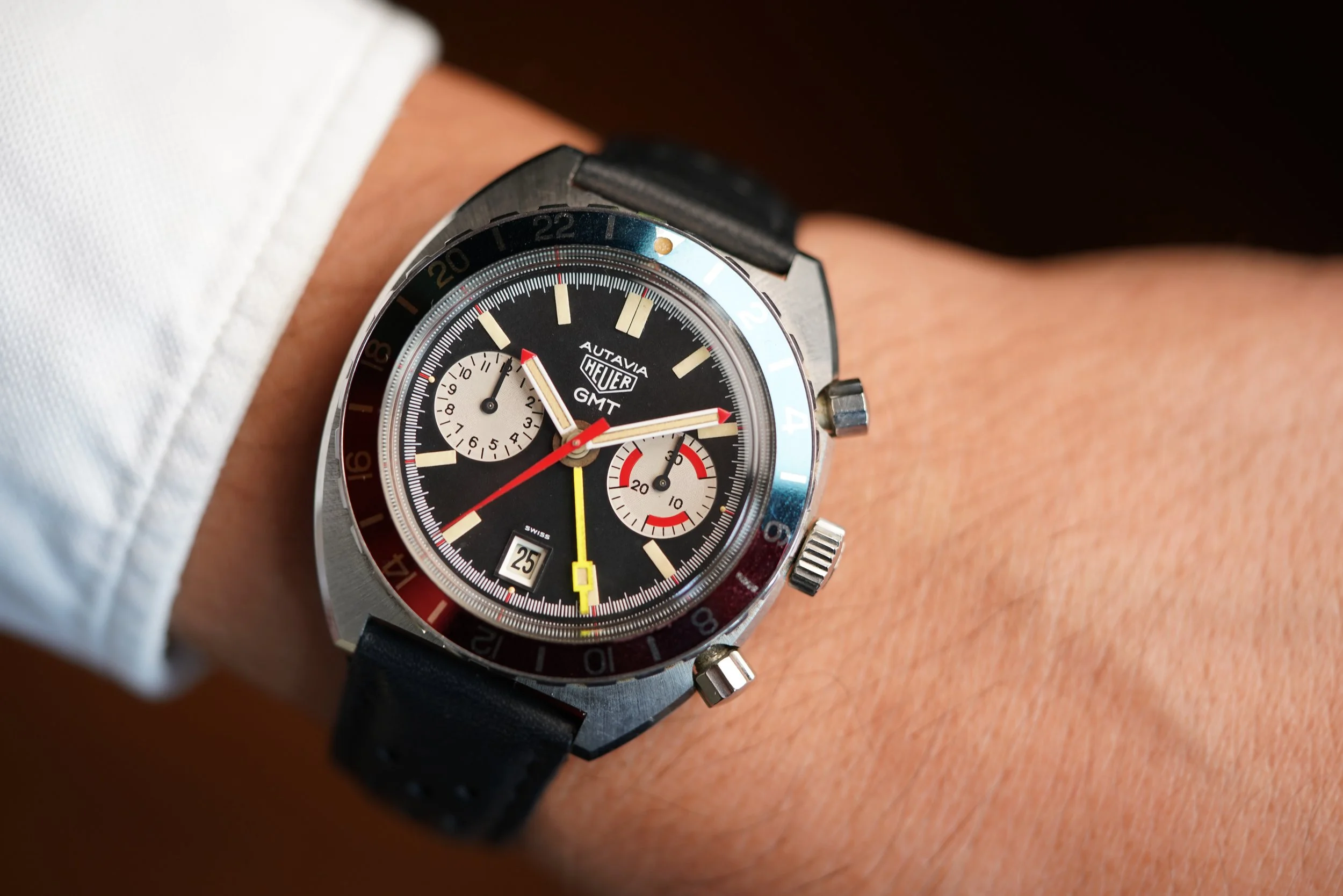In our opinion, the Heuer Autavias are some of the best buys in vintage watches. They feature very large cases, which are very enjoyable on the wrist. This reference features a stainless steel case which measures 42mm in diameter (approximately 47.5mm lug-to-lug). The bezel insert displays a strong blue and red color. The GMT hand is in a contrasting yellow color. The watch is paired with a black rally strap. It appears to have been polished.