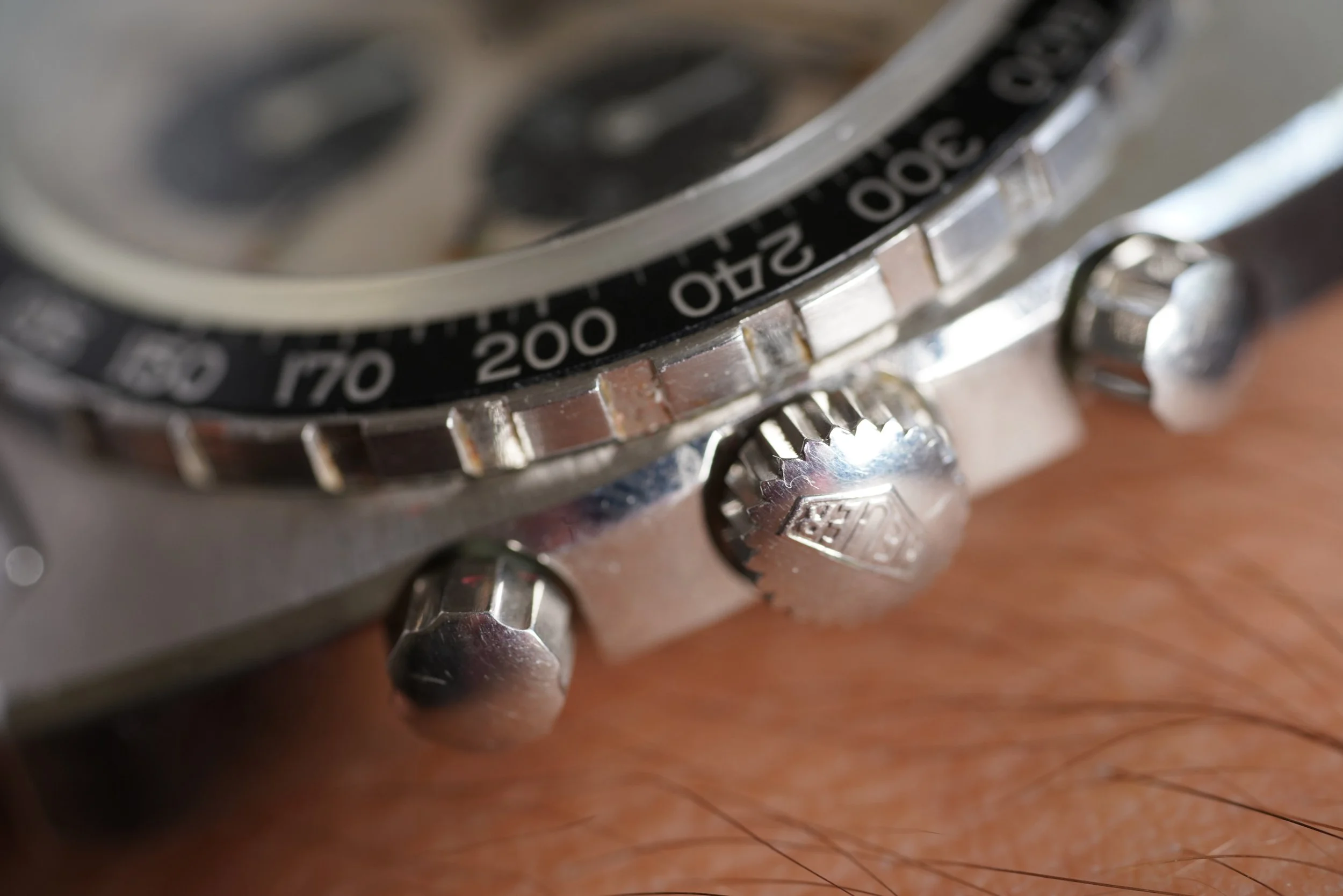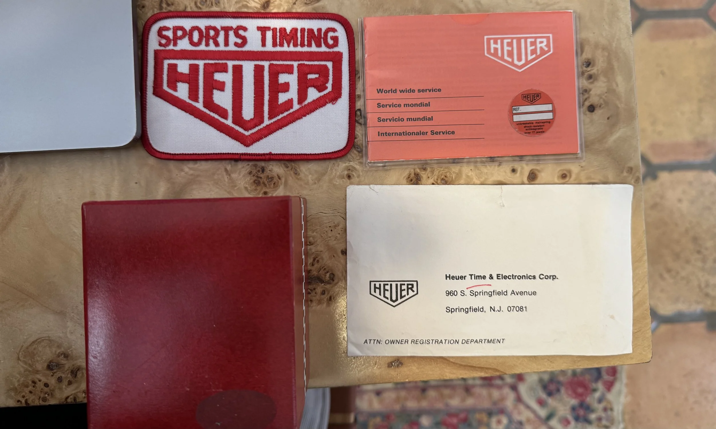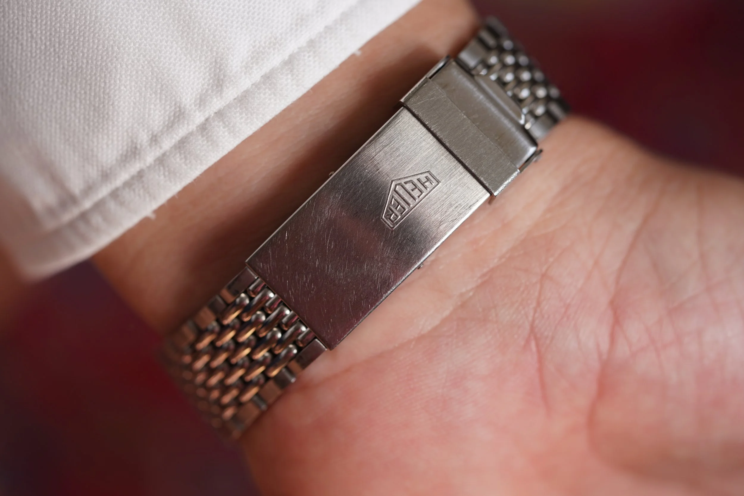 This watch comes with box and papers (which are not filled out and very typical with vintage Heuer). We do not know the service history, but it is running well. It is paired on a Heuer bracelet by Gay Freres with HLF end links.