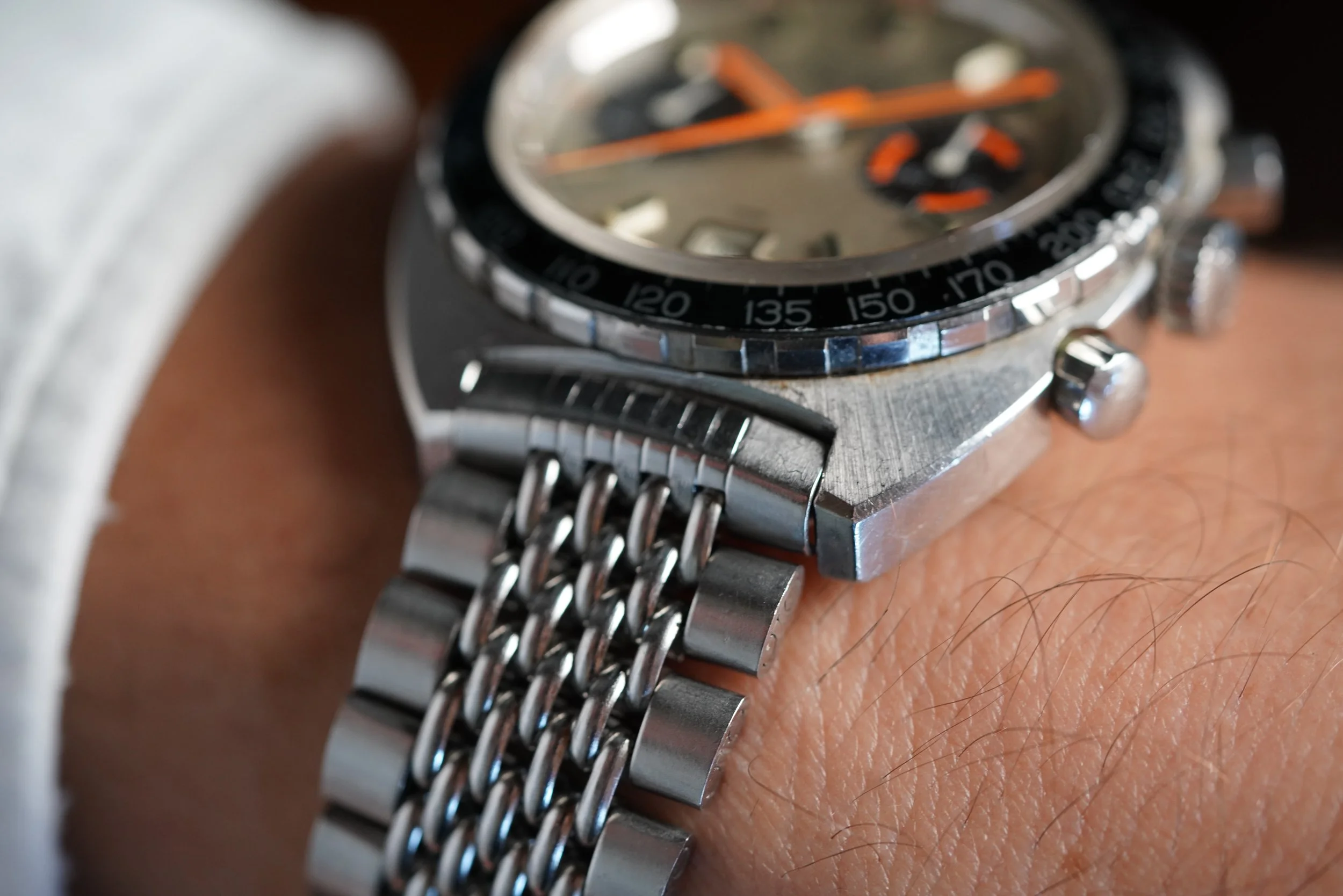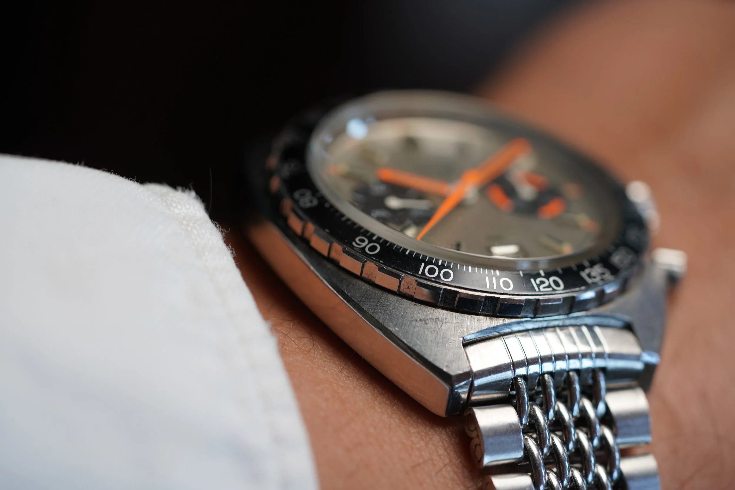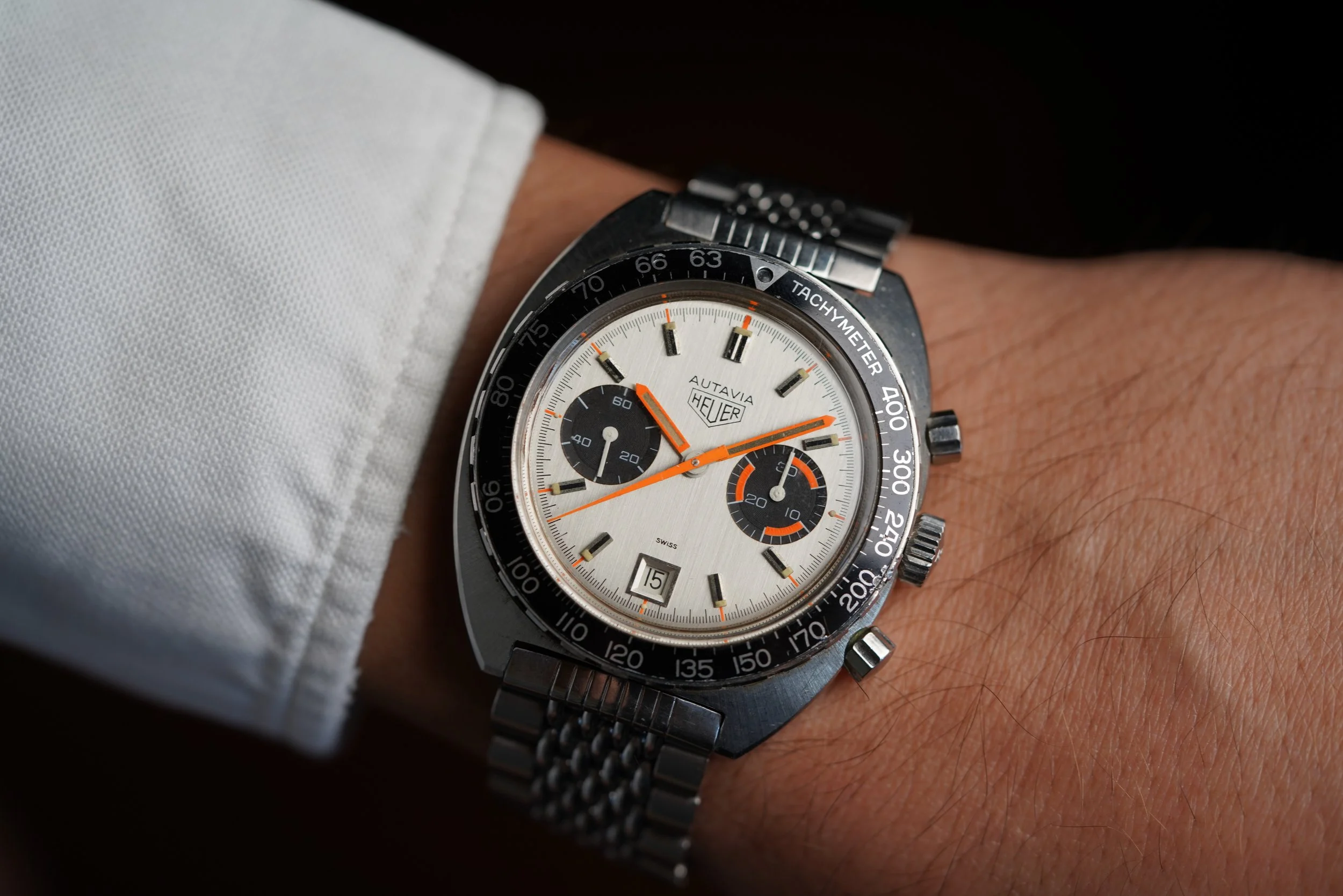 This Heuer Autavia reference 73463 is a great sports watch with orange accents. This grey and orange dial variant is less common and quite a fun look. The case has been lightly polished. It measures 42mm in diameter. It features the manual-wind Valjoux 7734 movement. It is paired on a Japanese made bracelet with Heuer clasp logo. It dates to the early 1970s.