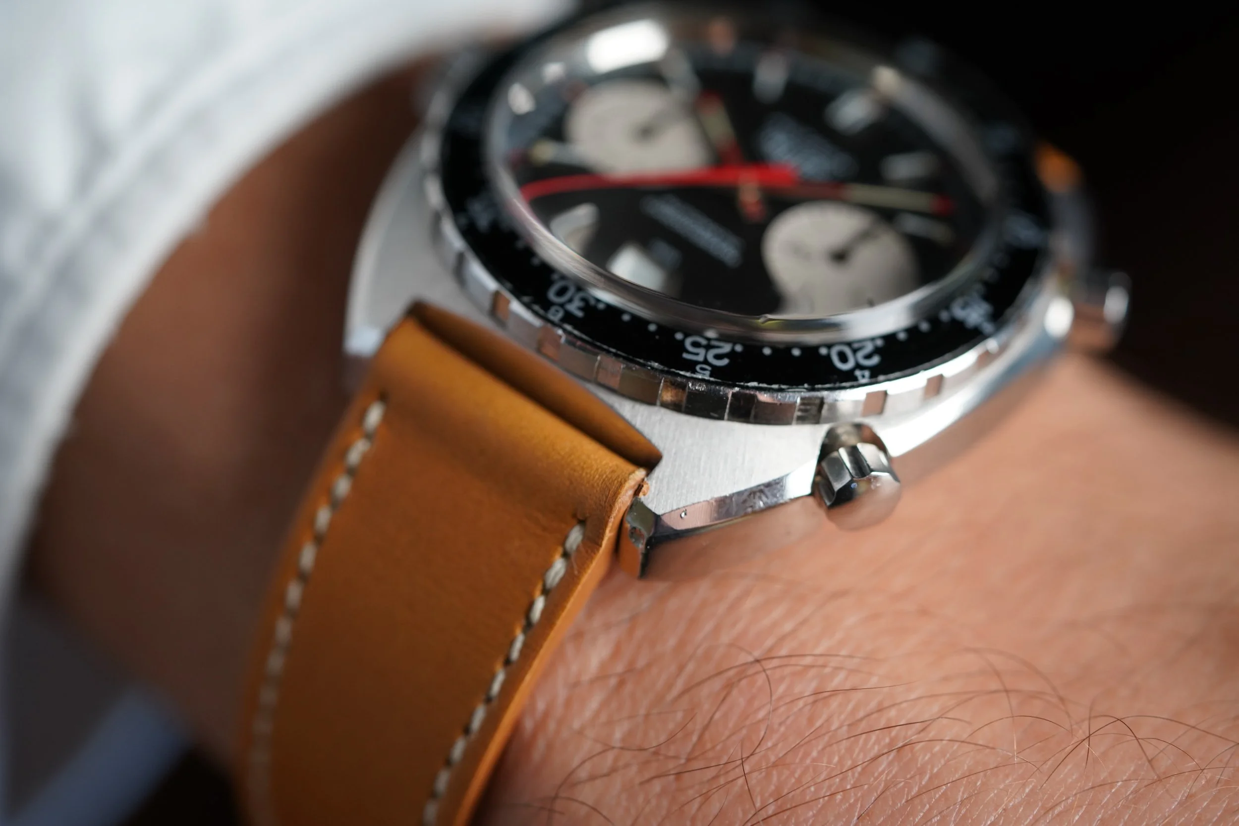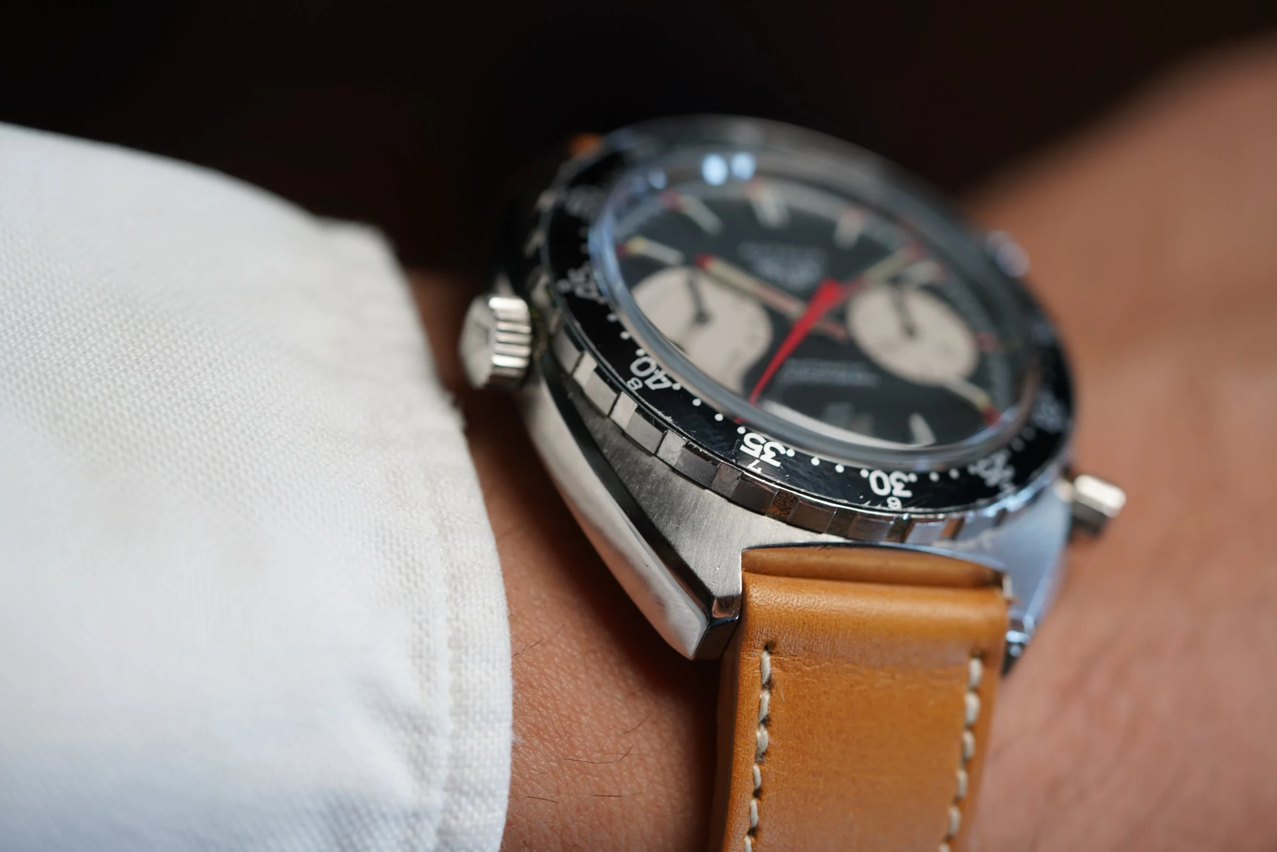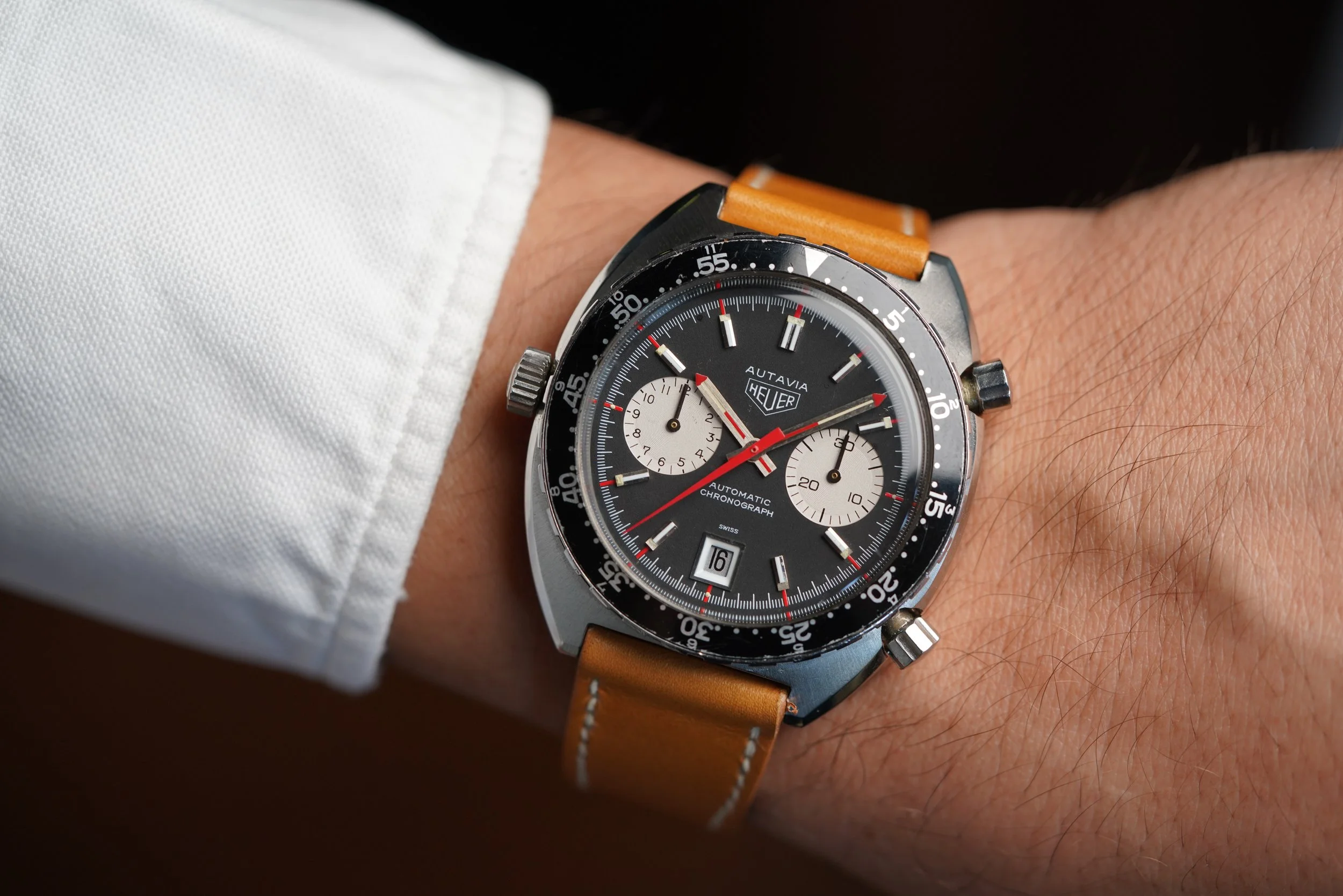 This Heuer Viceroy Autavia Reference 1163 is a very cool sports watch with the HM bezel. This is the non-Viceroy style - which features the tachymeter bezel. The case has been polished. The lume is very attractive. The watch is a robust automatic chronograph and a great value in vintage Heuer. It 204,XXX serial.