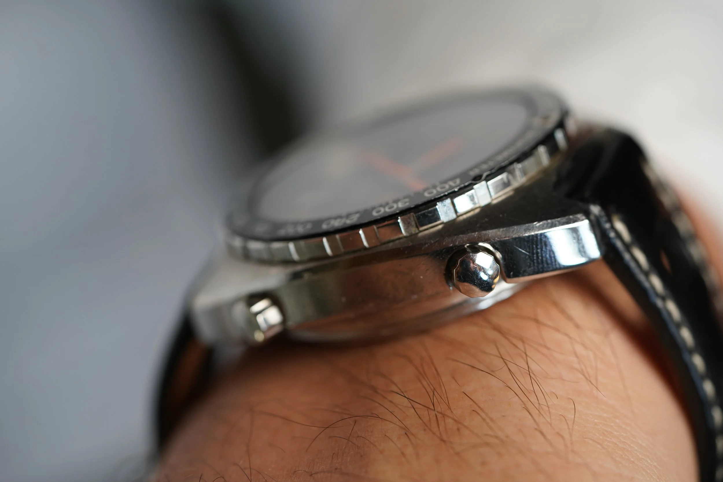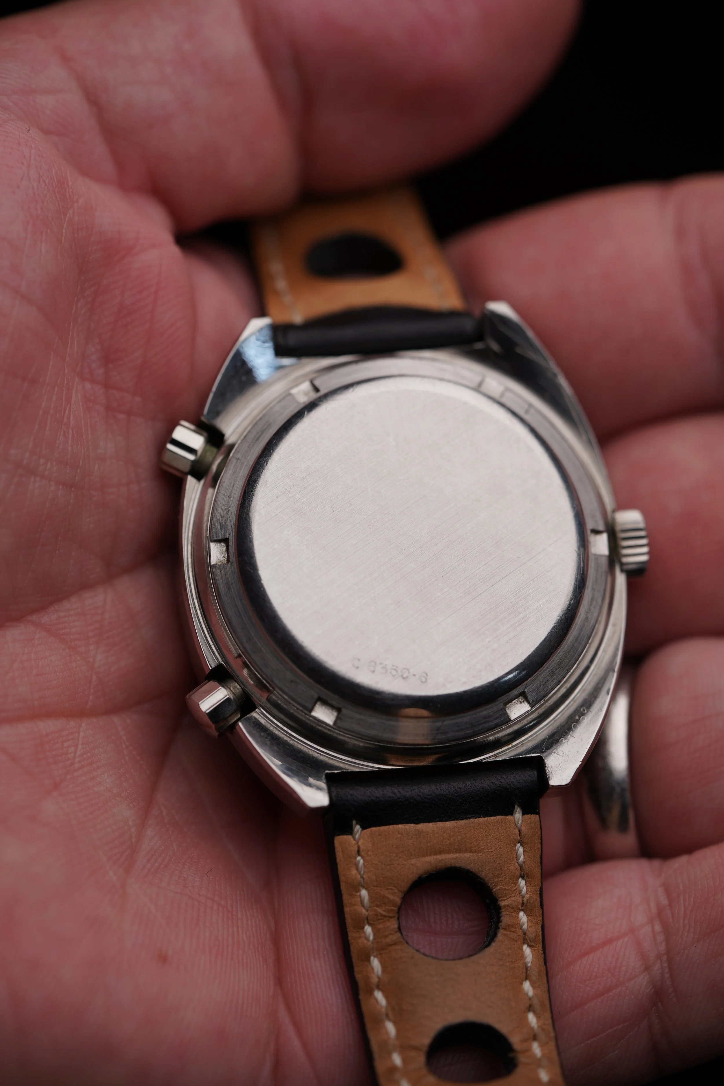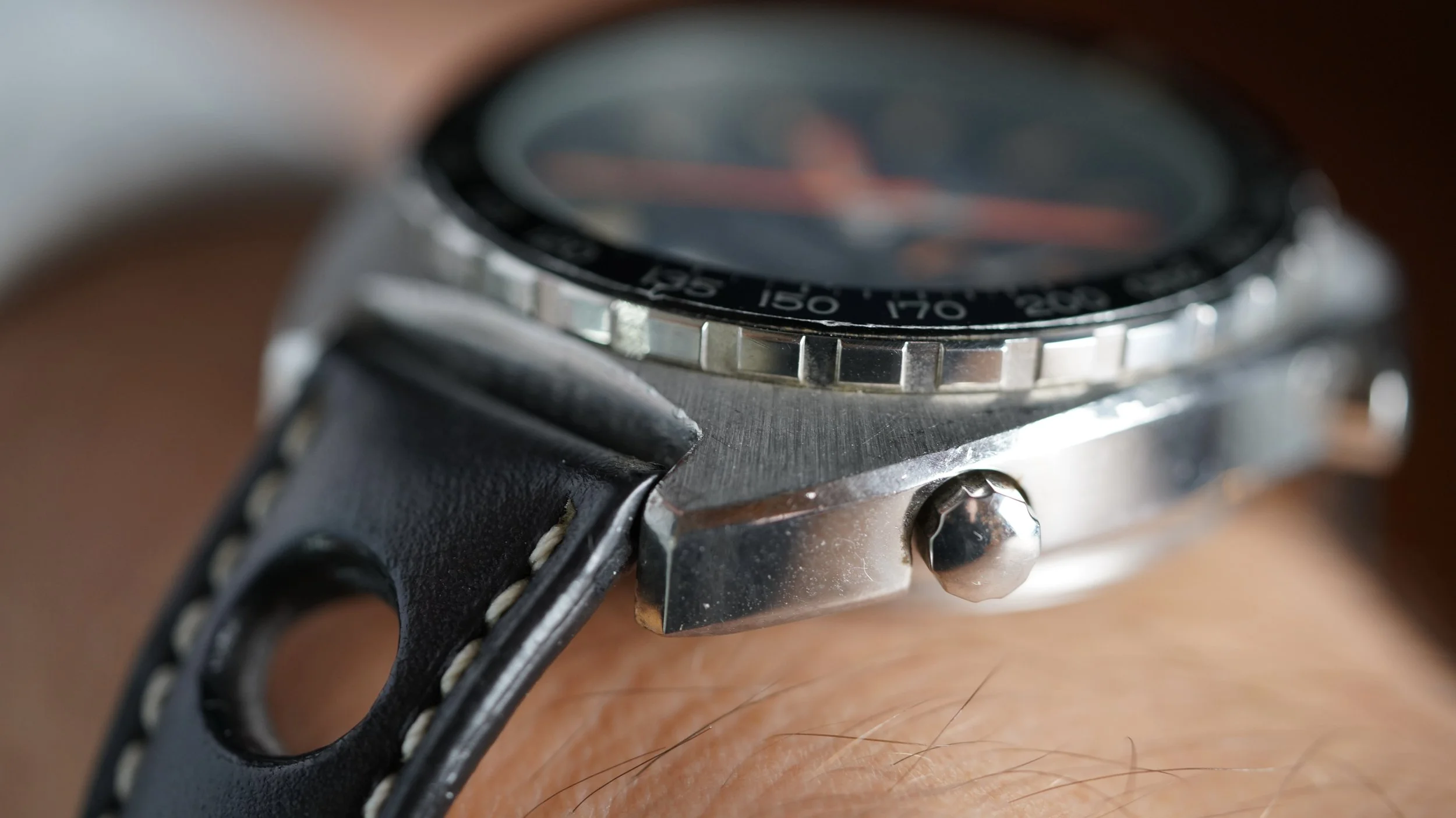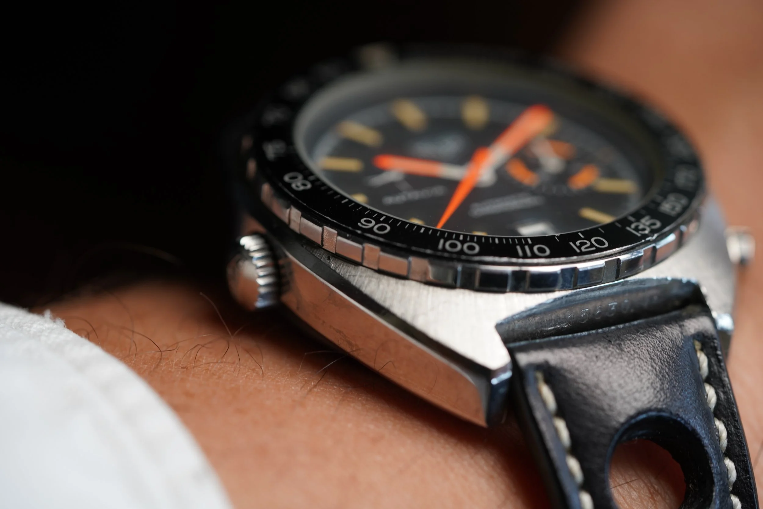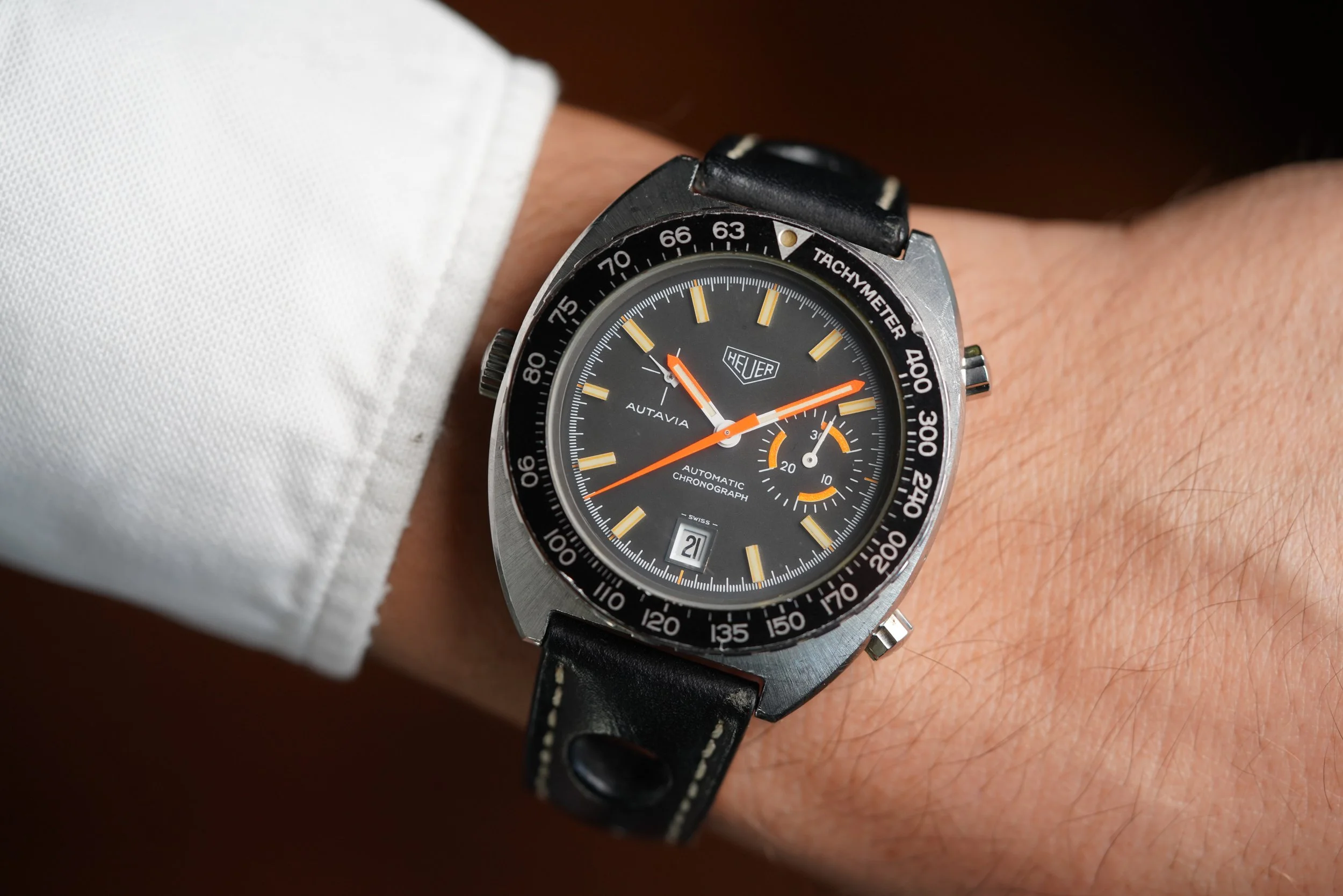 In my opinion, Heuer Autavias are some of the best buys in vintage watches. The example, a reference 15630 features a stainless case that measures approximately 42mm in diameter and 47mm lug-to-lug. The watch features a black dial with contrasting orange hands and subdial as well as a date window at 6 o’clock. The case has been polished.