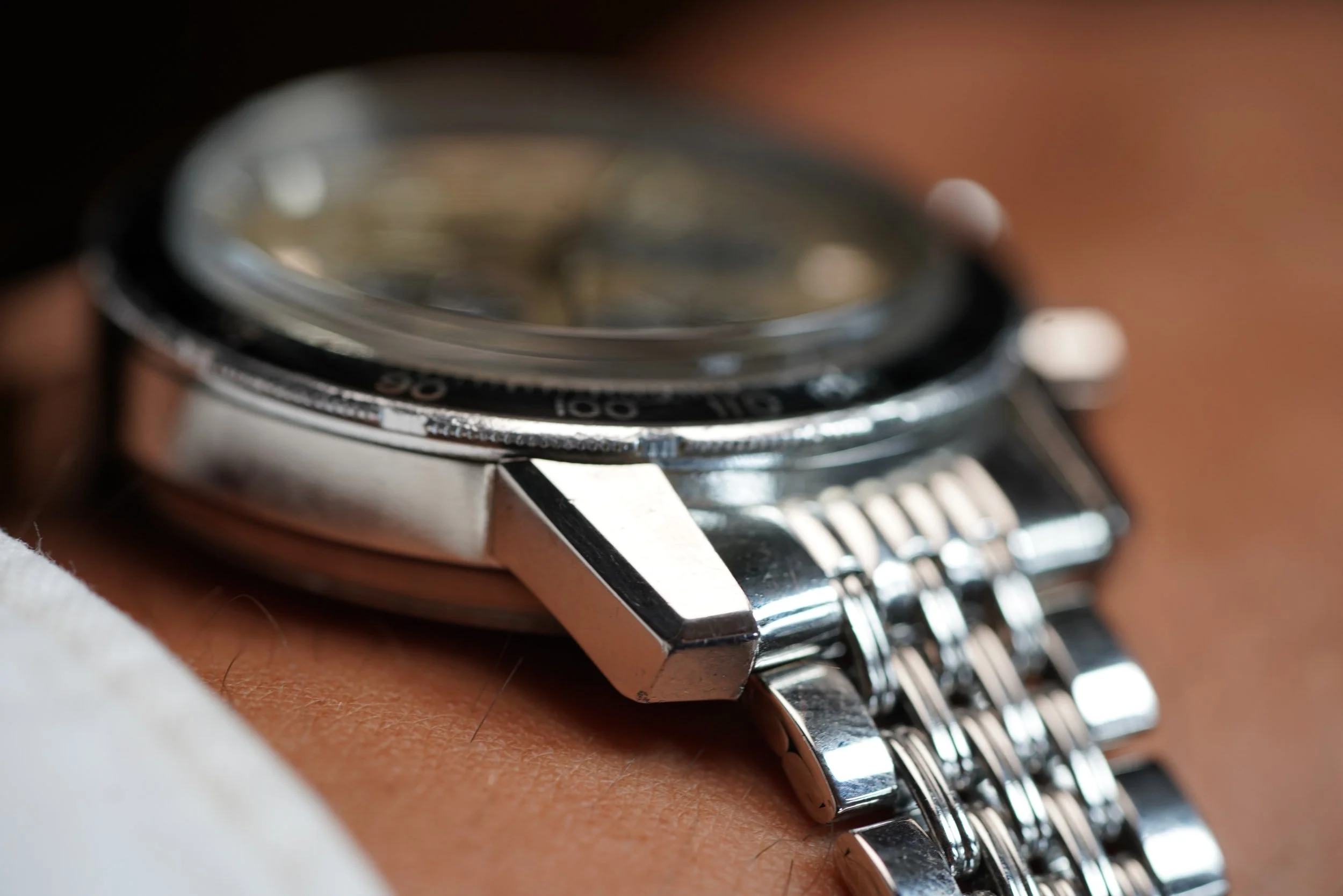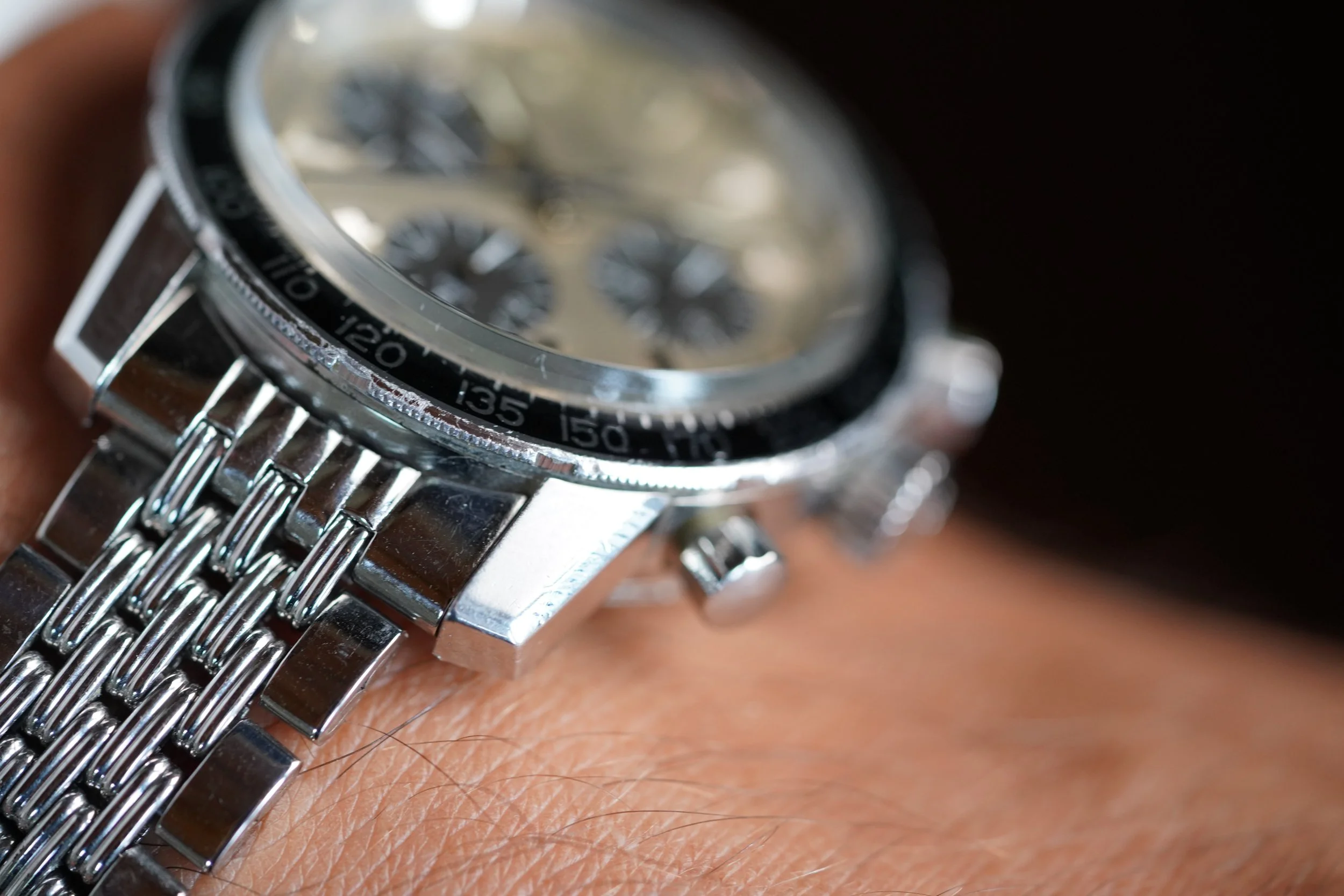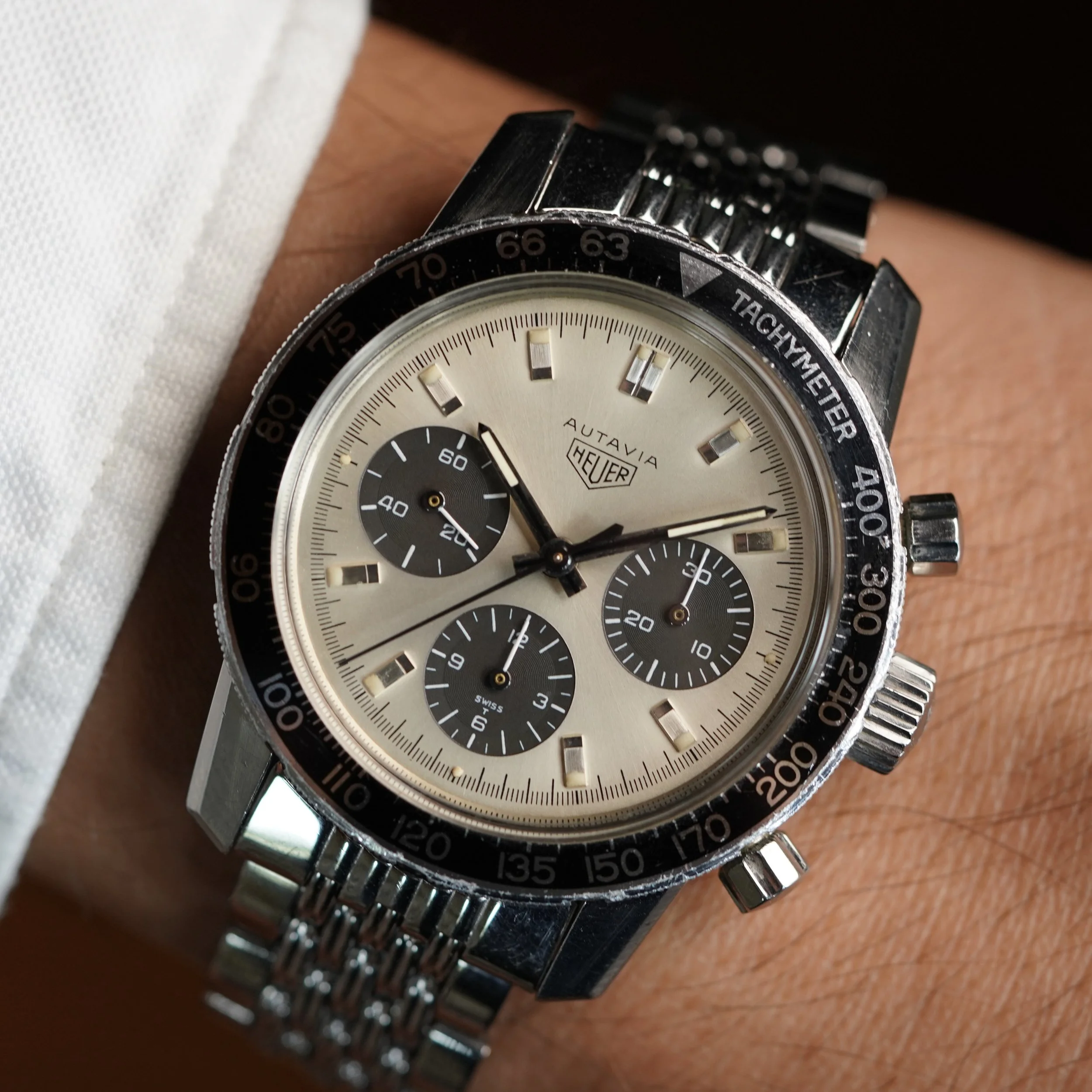 This Heuer Autavia reference 2446C SN is an incredible example and in fantastic condition. The case has been lightly polished. It dates to circa 1968-1969. It is paired on a Gay Freres bracelet for Heuer dating to 1971. We understand the dial was previously put in the watch - although it is a very rare dial variant and collectors love it.