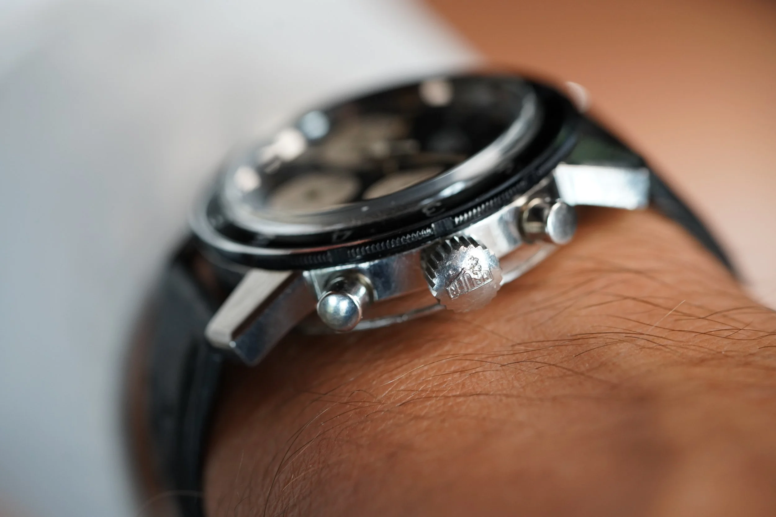 This Heuer Autavia reference 2446C is very cool example. The case appears to be unpolished. It dates to circa 1968-1969. We understand the bezel insert was replaced with a NOS example. The case measures approximately 40.5mm. It is powered by the Valjoux 72.