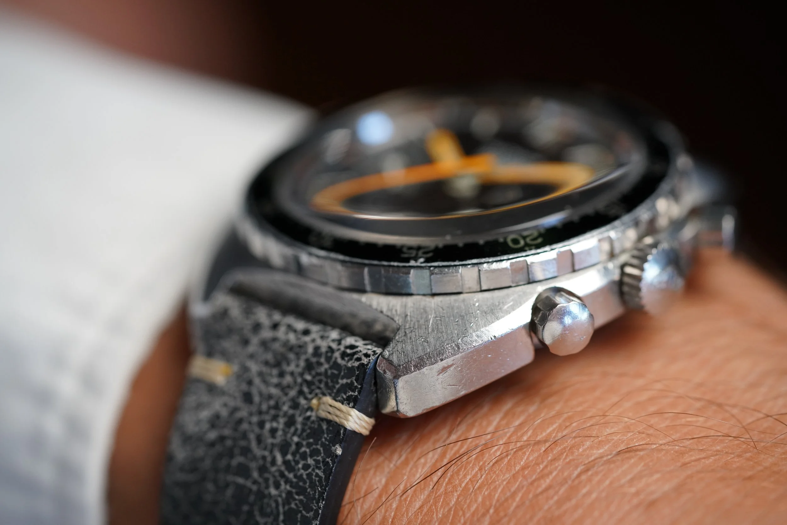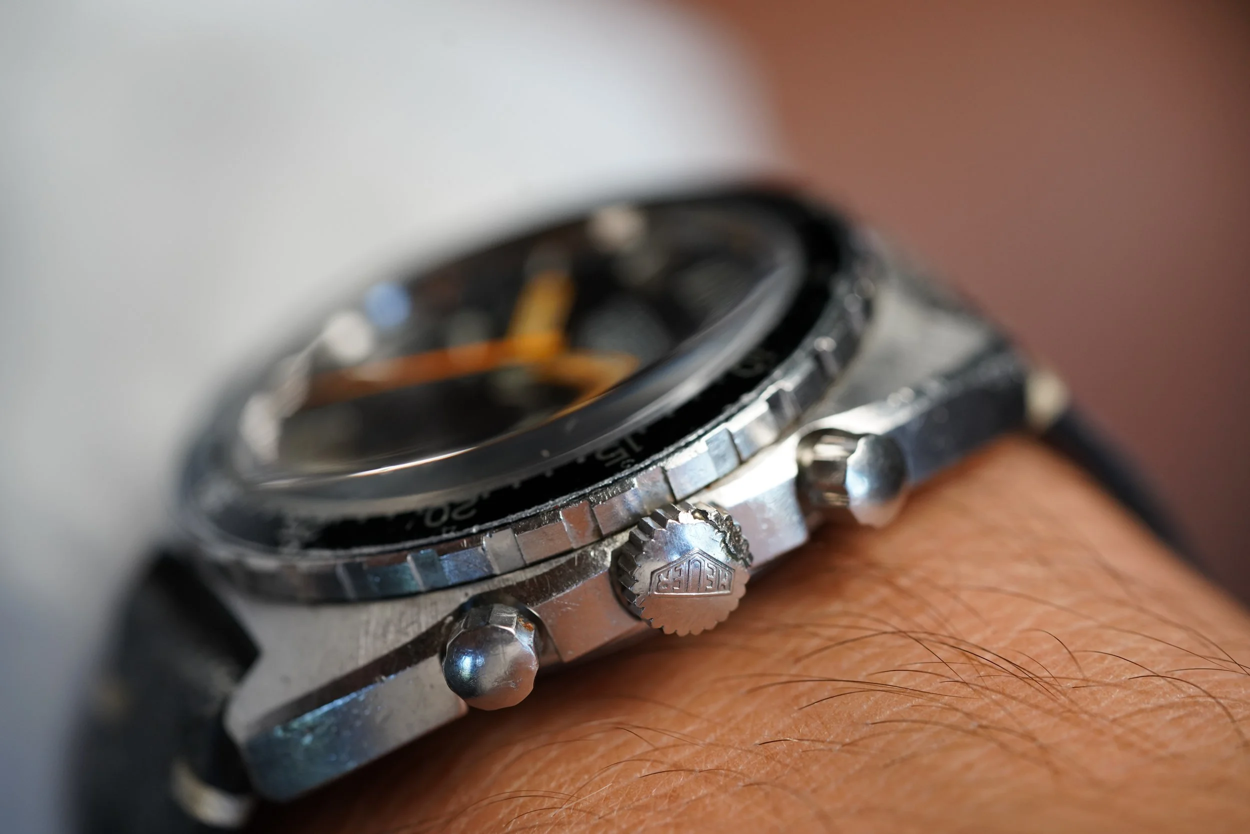 This Heuer Autavia reference 73363 is a super cool example with orange accents and hands. The watch is powered by the calibre 7733. It is paired on an anonymous strap and buckle. It is an IDF issued Heuer.