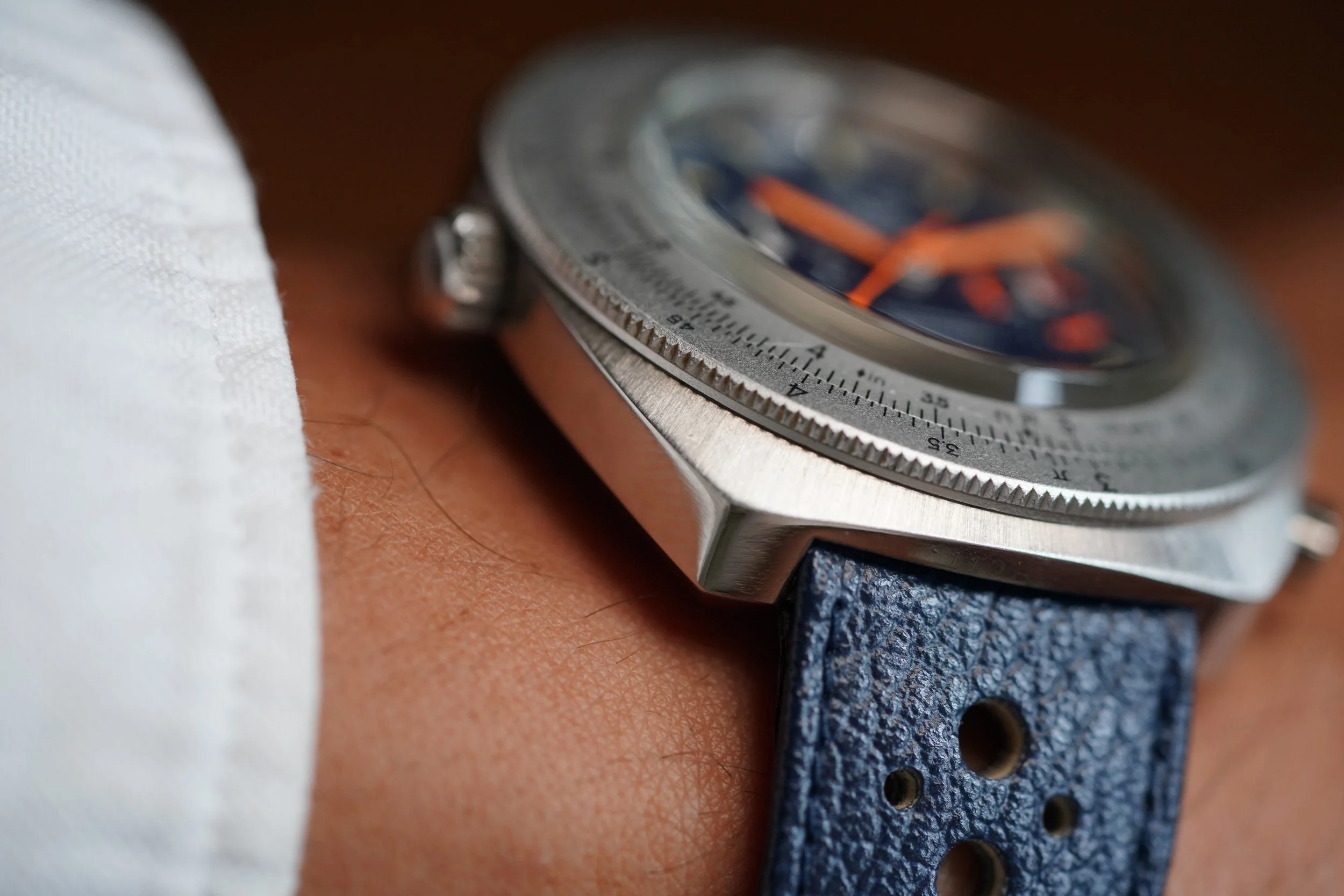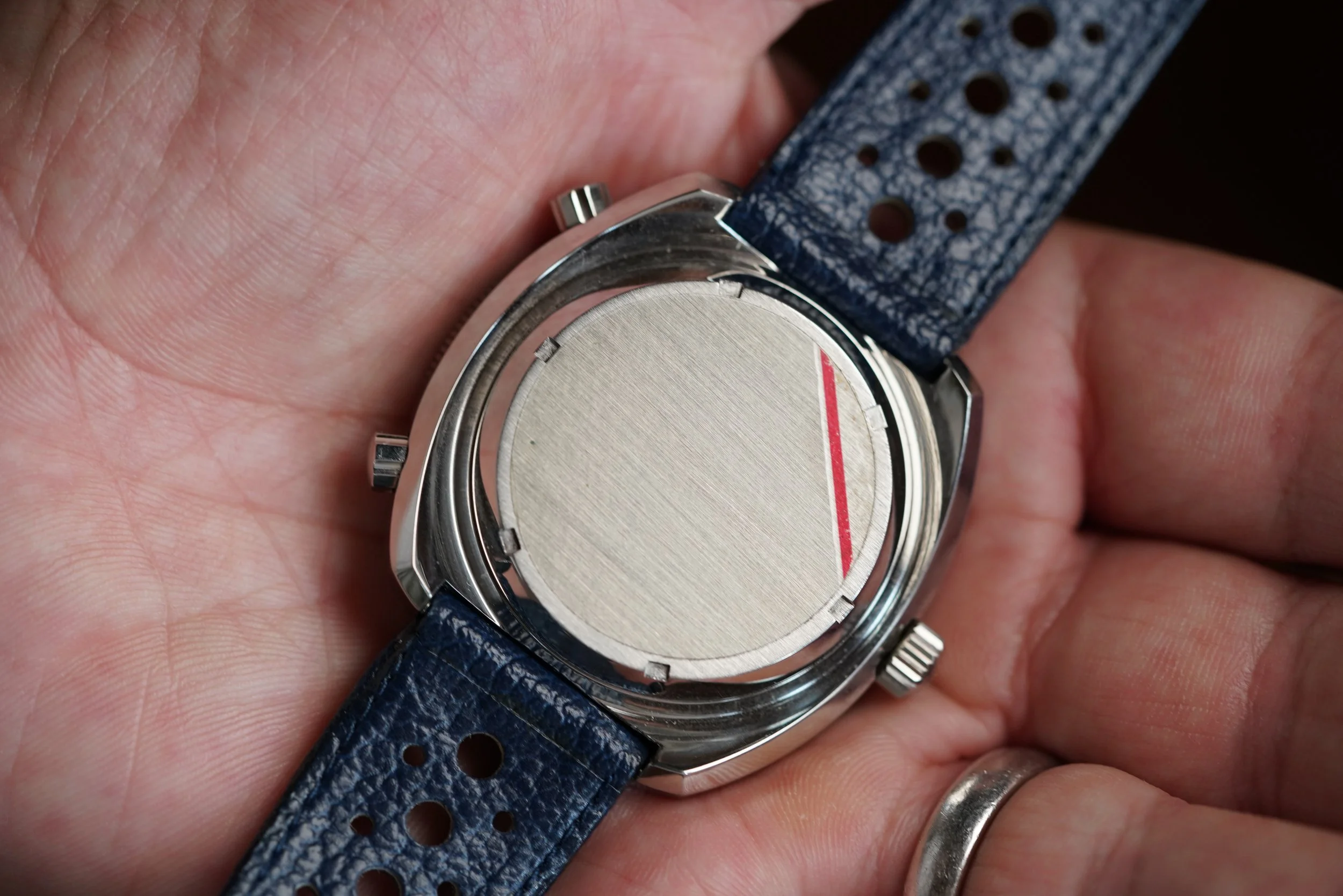 This Heuer Calculator 110.633B is a very attractive example. The case is measures 45mm in diameter. These bezels are extremely cool and fun to use. The colors are incredible. It features a blue dial and blue strap with Heuer buckle!