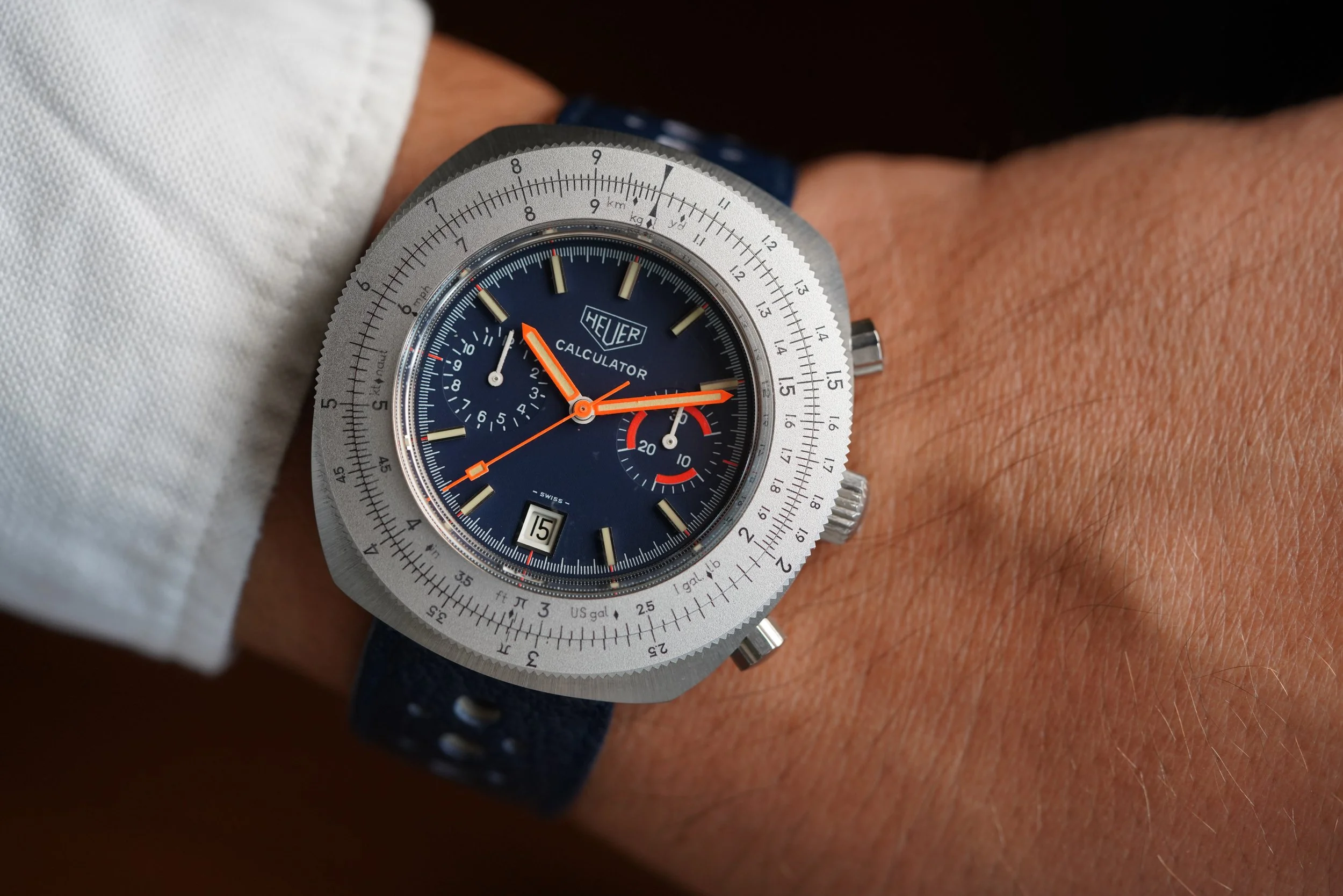 This Calculator reference 740.633 is a very attractive example. The case is measures 45mm in diameter. These bezels are extremely cool and fun to use. The colors are incredible. It features a blue dial and blue strap with Heuer buckle!