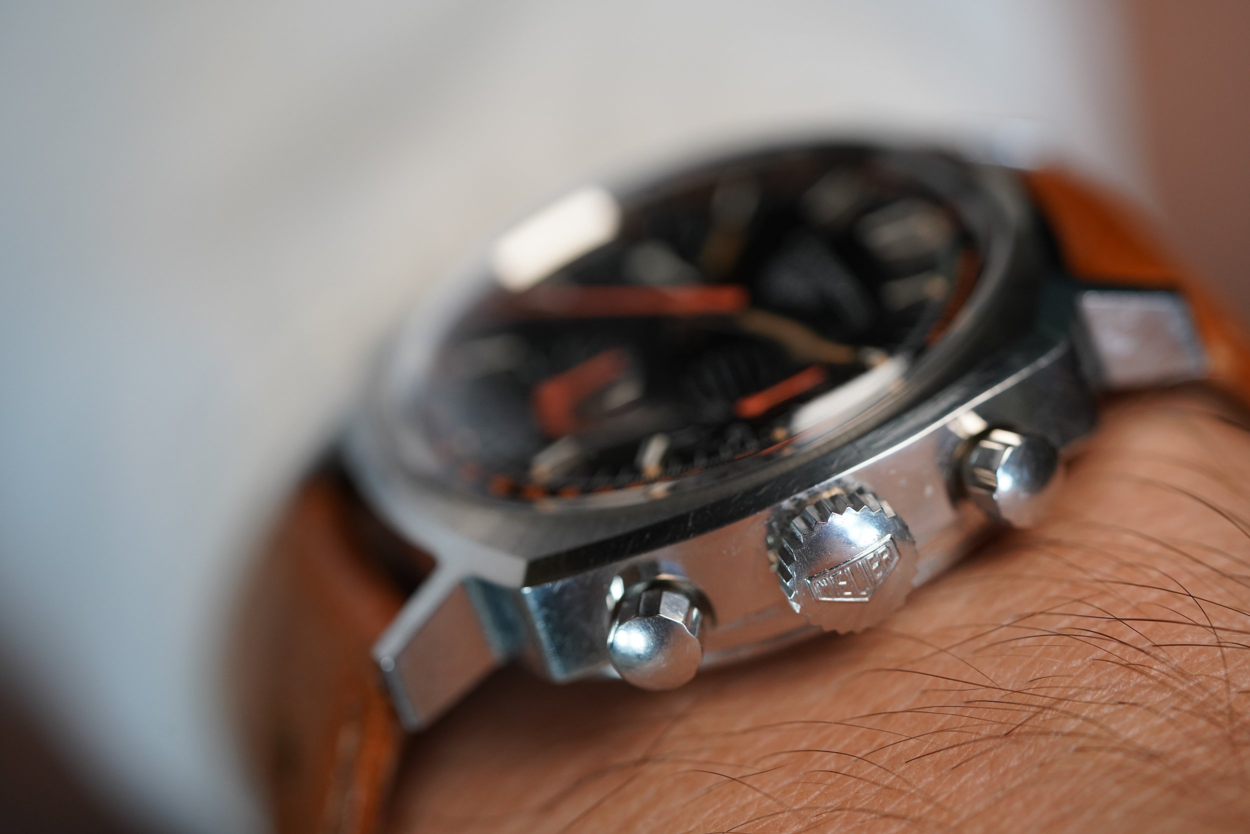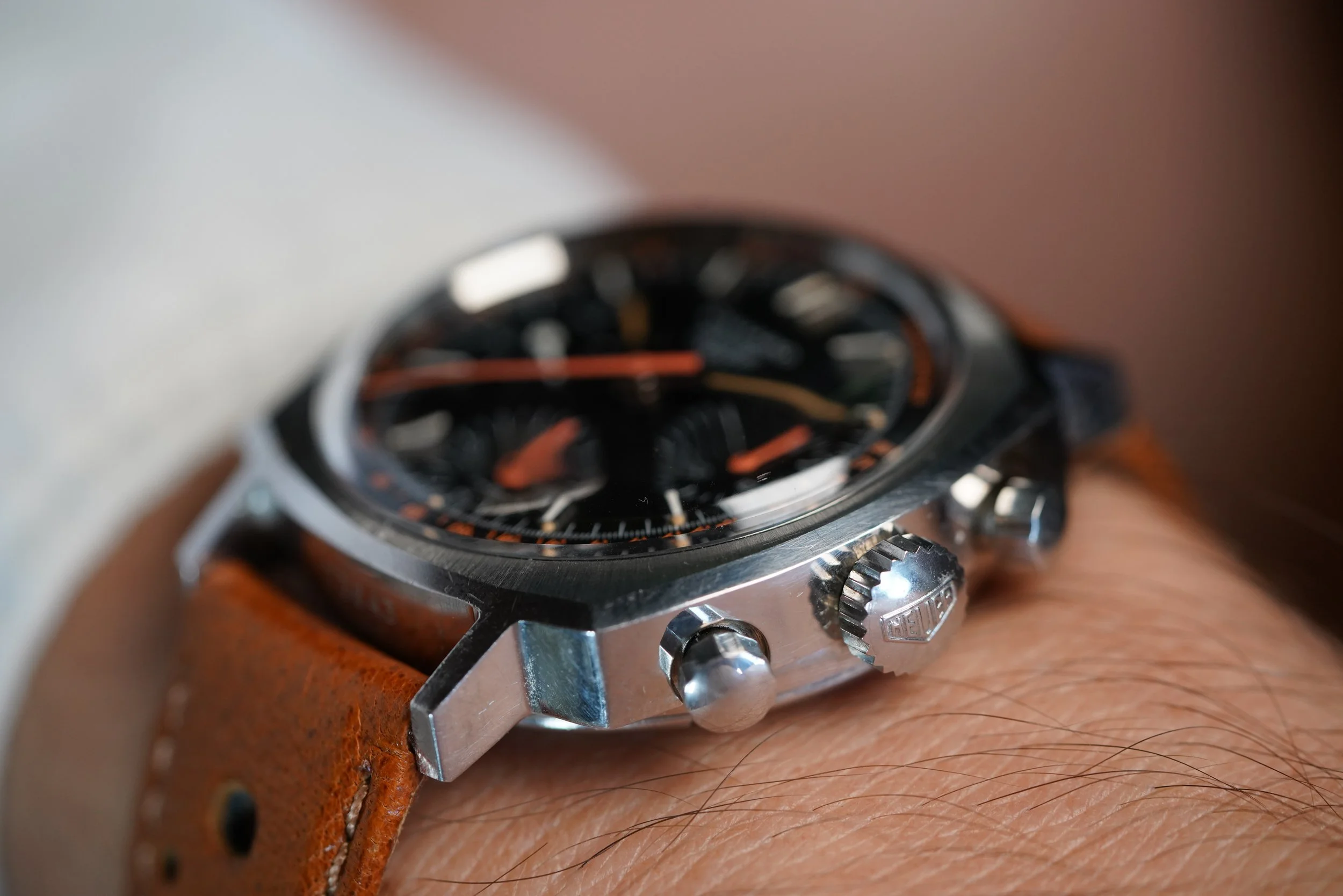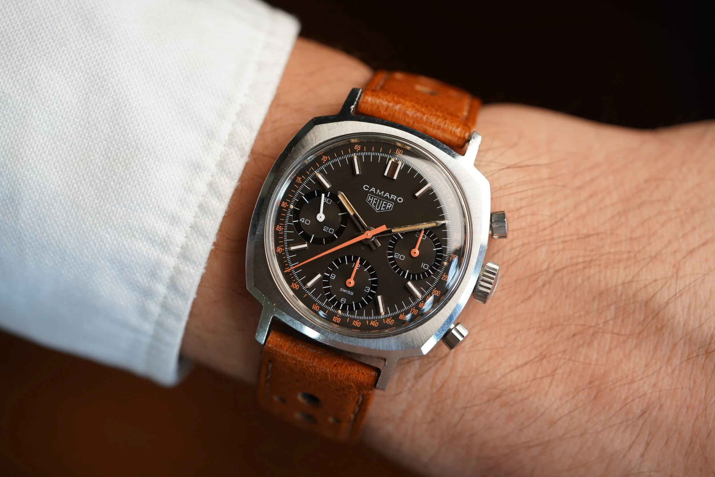 This Heuer Camaro reference 73643NT is a very cool watch with Exotic racing dial. I always excited to offer very cool and interesting chronographs like this. The dial is outstanding. The watch stainless steel. The watch is powered by the Valjoux 7736 manual wind chronograph movement. It comes on an annoynmous strap and a later Heuer buckle. The case appears to be unpolished.