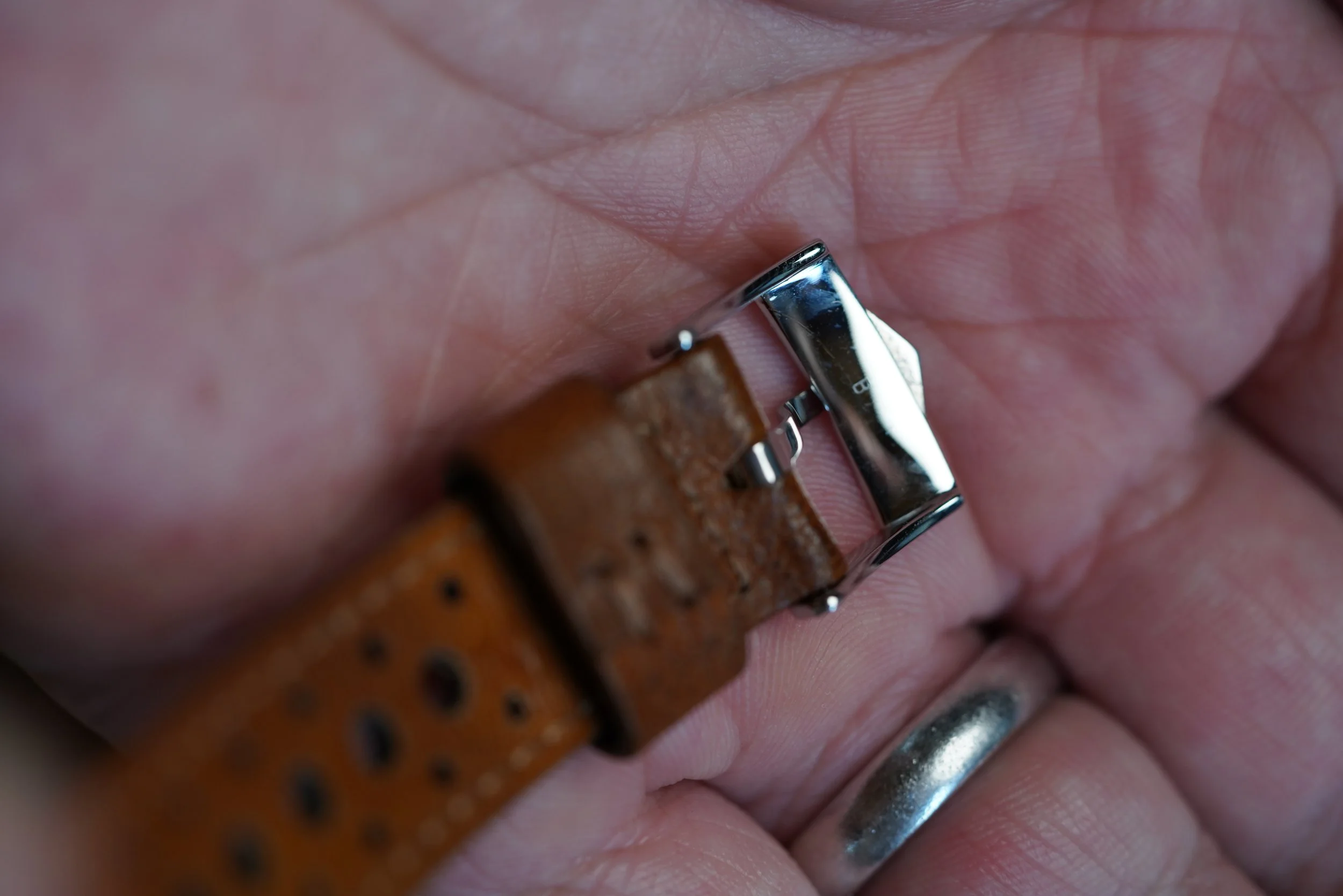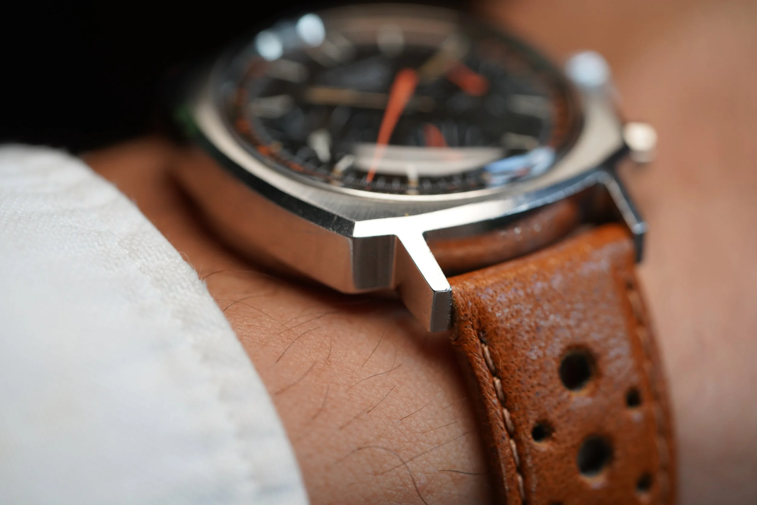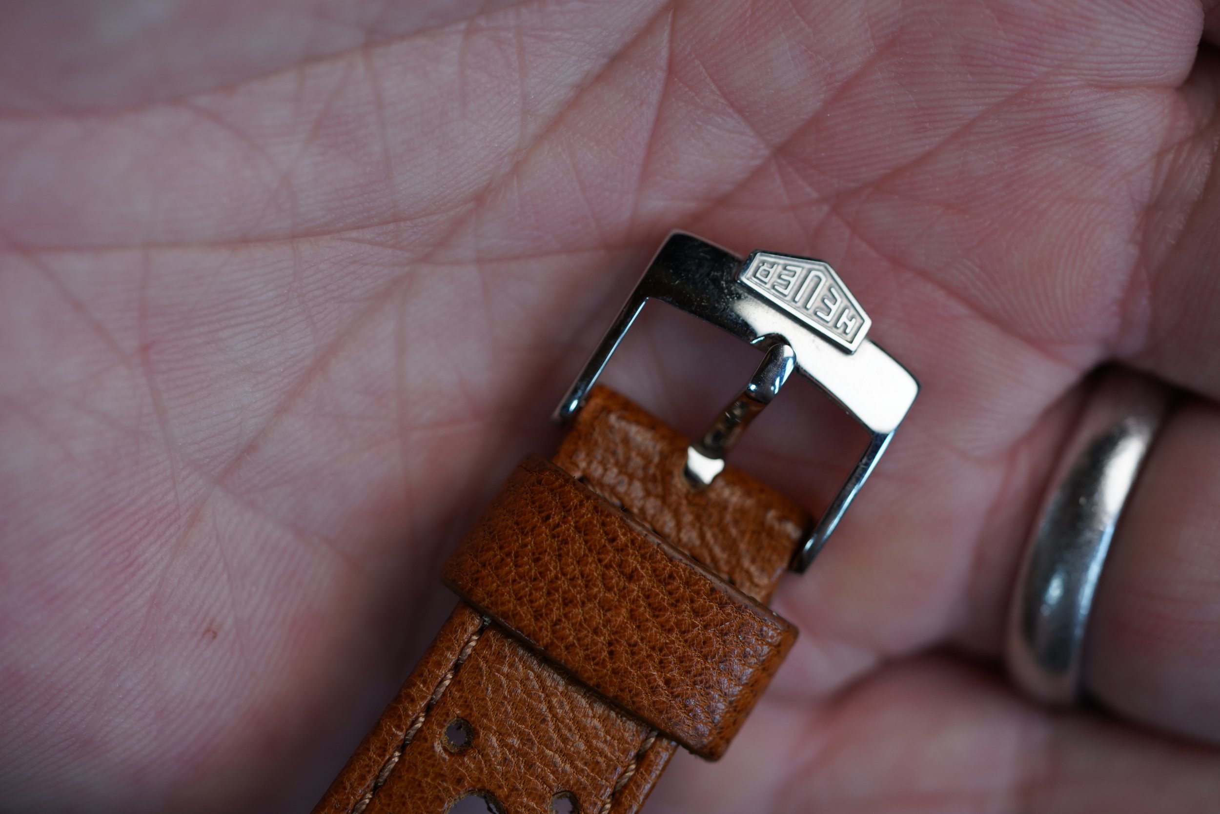 This Heuer Camaro reference 73643NT is a very cool watch with Exotic racing dial. I always excited to offer very cool and interesting chronographs like this. The dial is outstanding. The watch stainless steel. The watch is powered by the Valjoux 7736 manual wind chronograph movement. It comes on an annoynmous strap and a later Heuer buckle. The case appears to be unpolished.