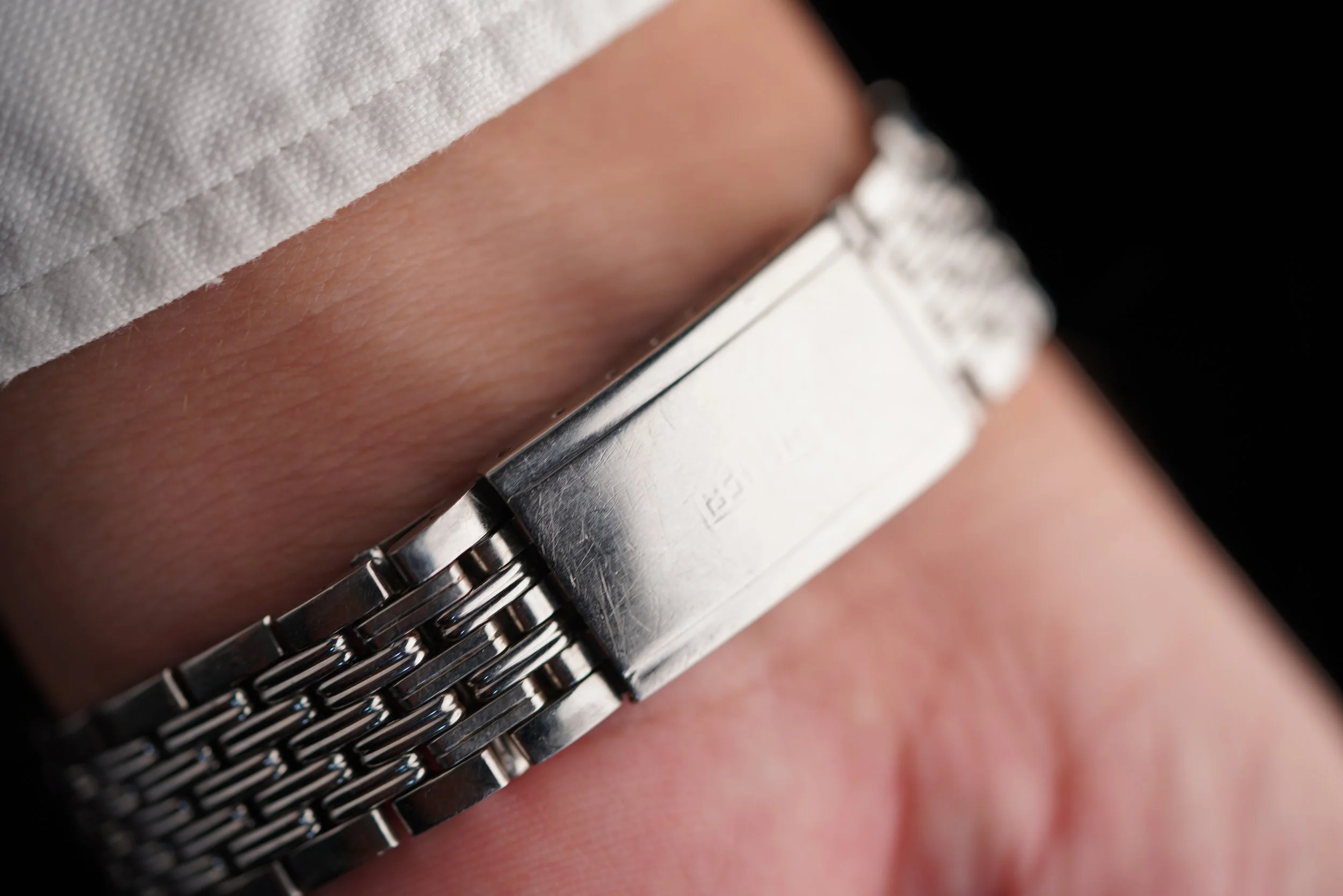 It is paired with a double grain beads of rice Heuer bracelet with correct HLA end links. The bracelet is made by Gay Freres, but the inside clasp blades are replaced and aftermarket.