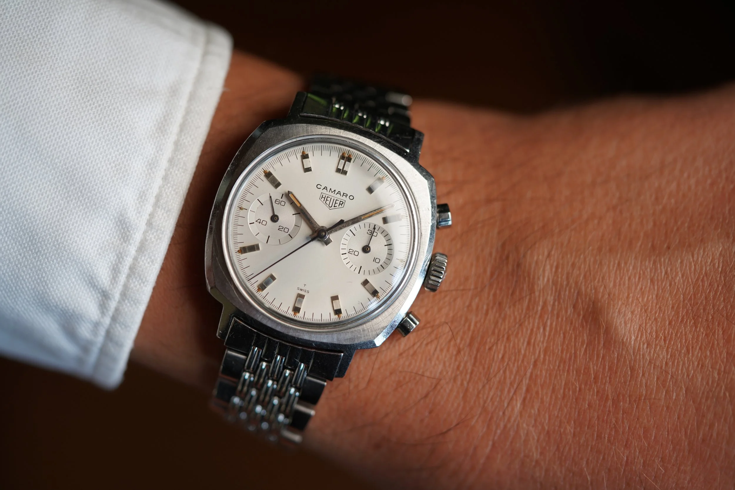Heuer is renowned for its rich history with automotive racing, and one of the great models from the golden age of the brand is the Camaro. The Camaro line has always been a sleeper when compared to the more discussed siblings such as the Autavia and Carrera. This example features a very attractive silver dial and stainless steel case. The case appears to be unpolished.
