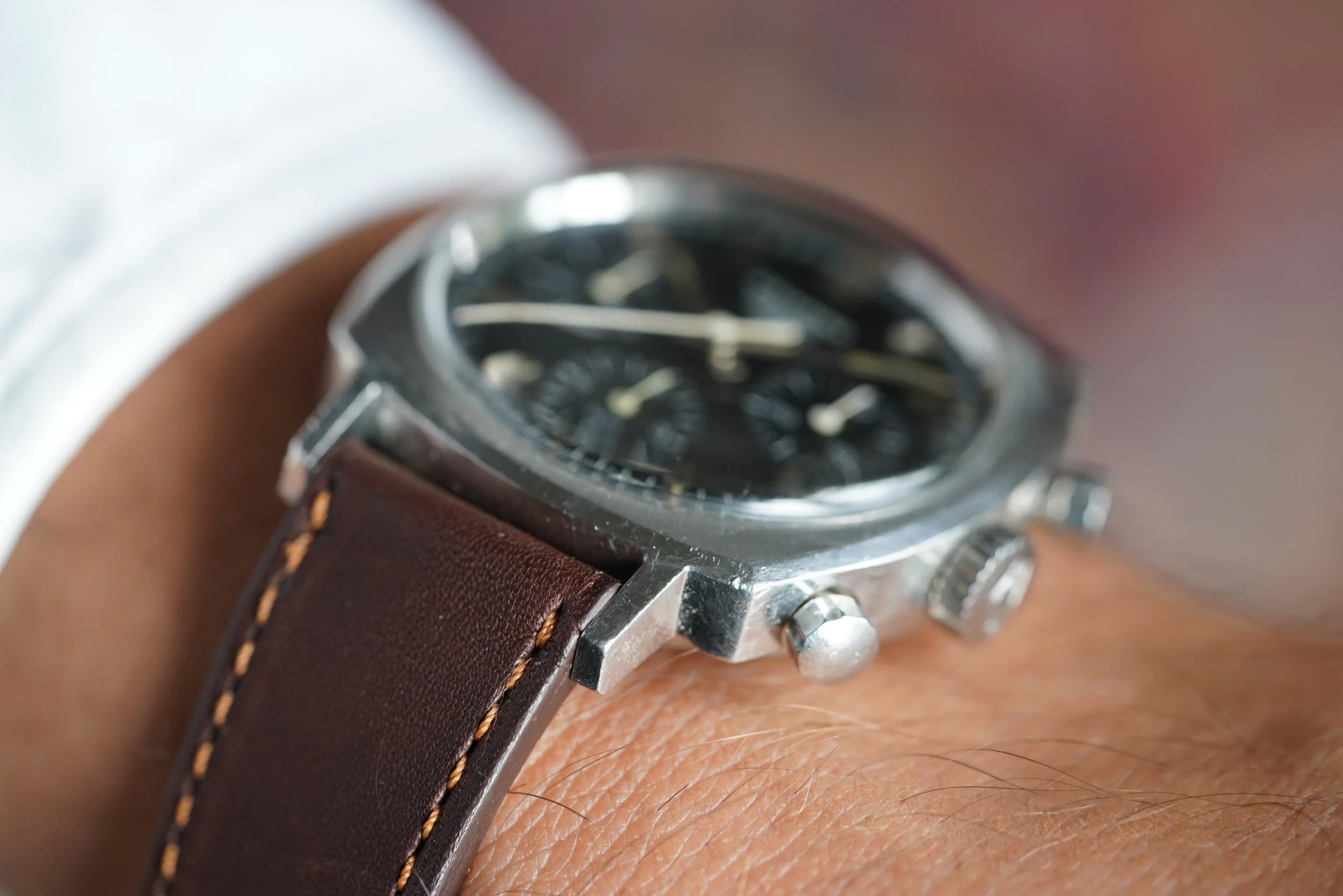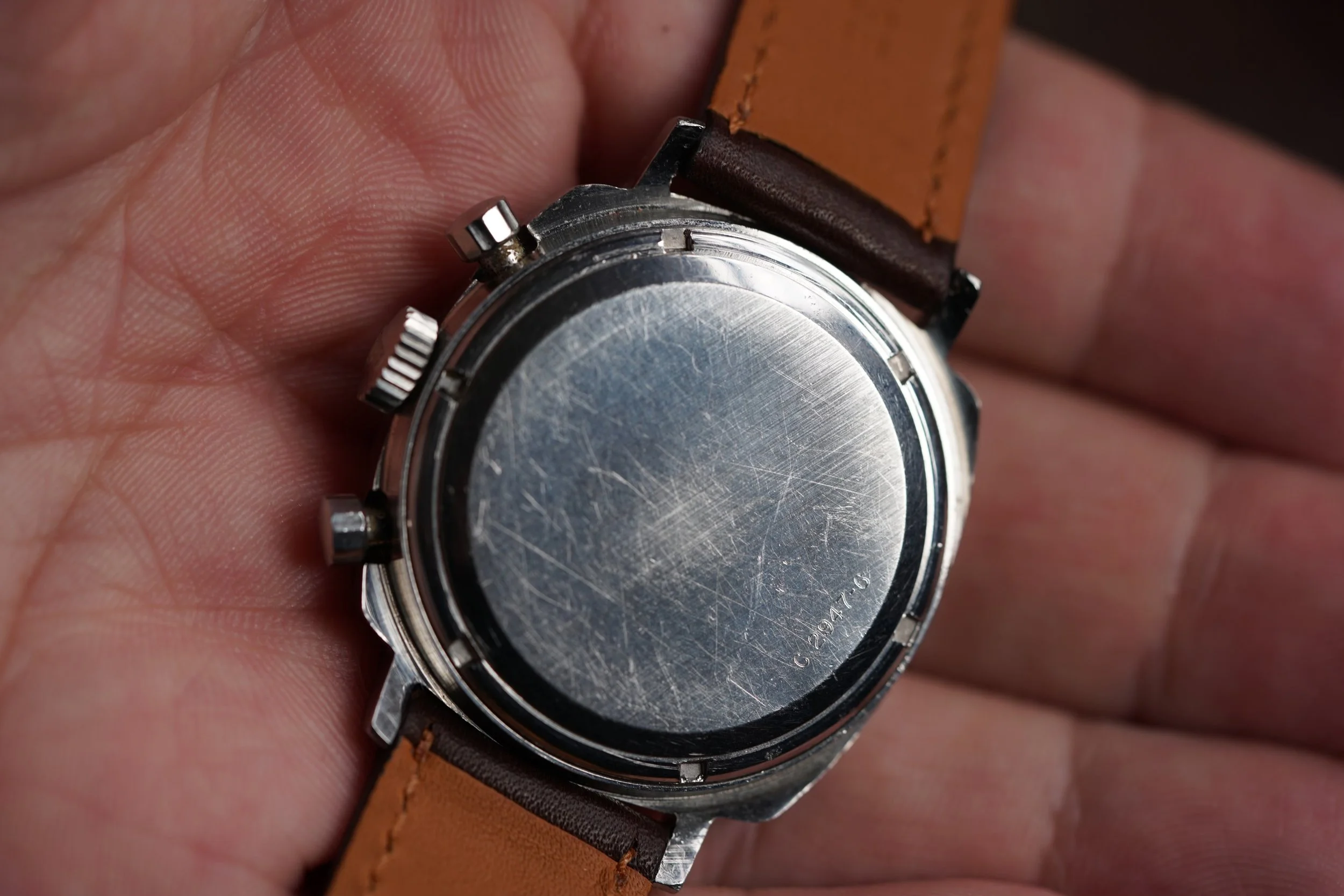 The reference 7220N is powered by the manual wind calibre Valjoux 72. The N in the reference designates the black dial, however it is a nice brown color. The case is unpolished and the watch is paired on a nice brown strap. The case measures 37mm in diameter (43mm lug-to-lug). The watch dates to circa 1971.