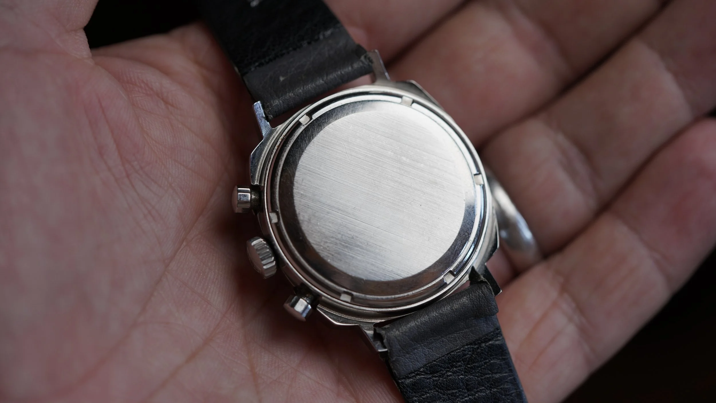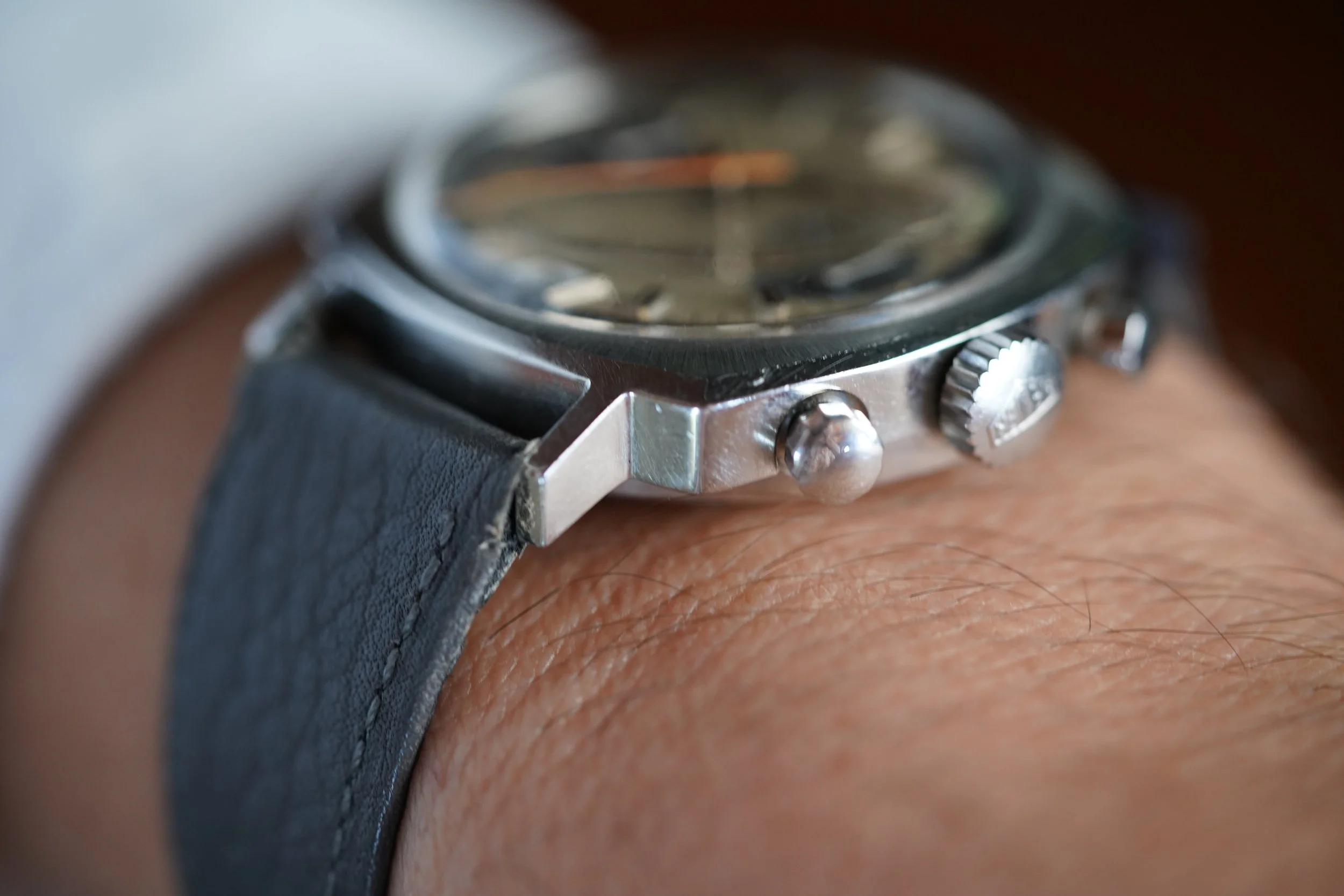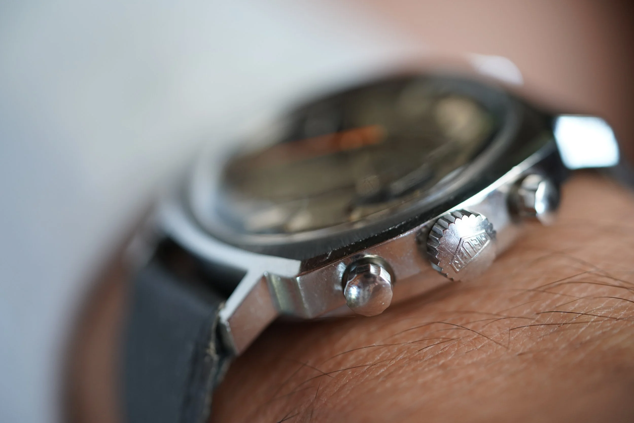 This example is a reference 73443 in well preserved condition with a contrasting dark grey and lighter grey dial with an orange chronograph hand. The watch is paired on a Heuer-signed blue/grey leather strap. The case appears to be unpolished.