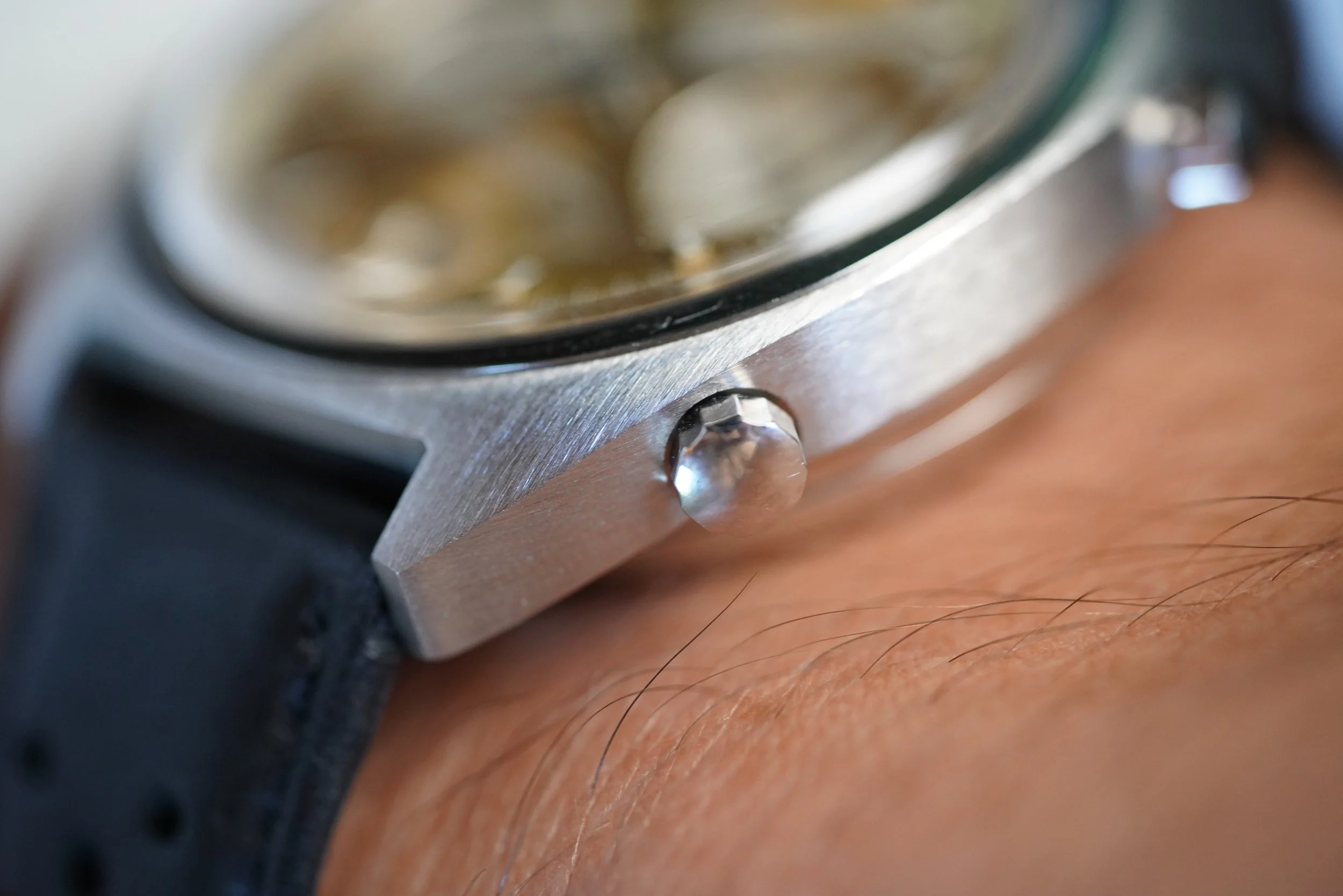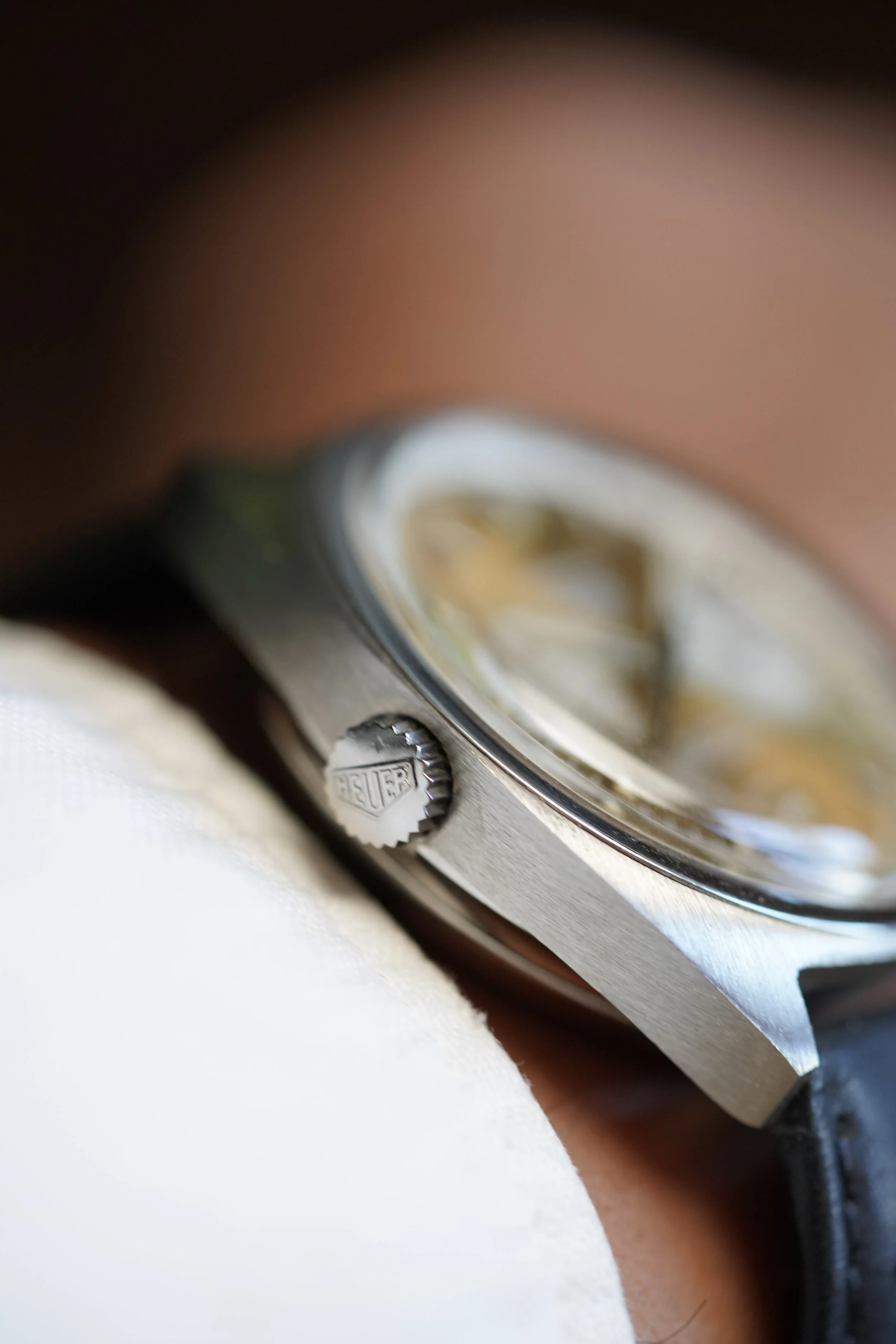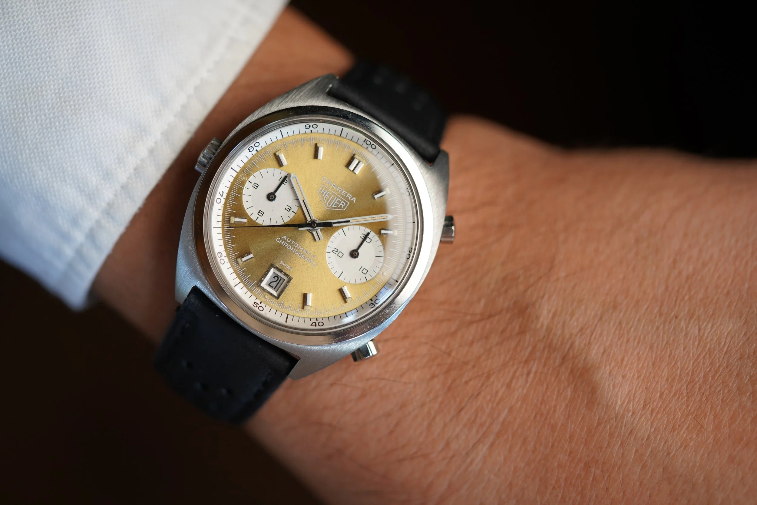 The Heuer Carrera reference 1153N is an incredible 1970s chronograph. It features the calibre 11 movement. The case has been polished. The dial is a 2nd execution with the rare decimal inner track. It has turned tropical and has a champagne color instead of the original blue.