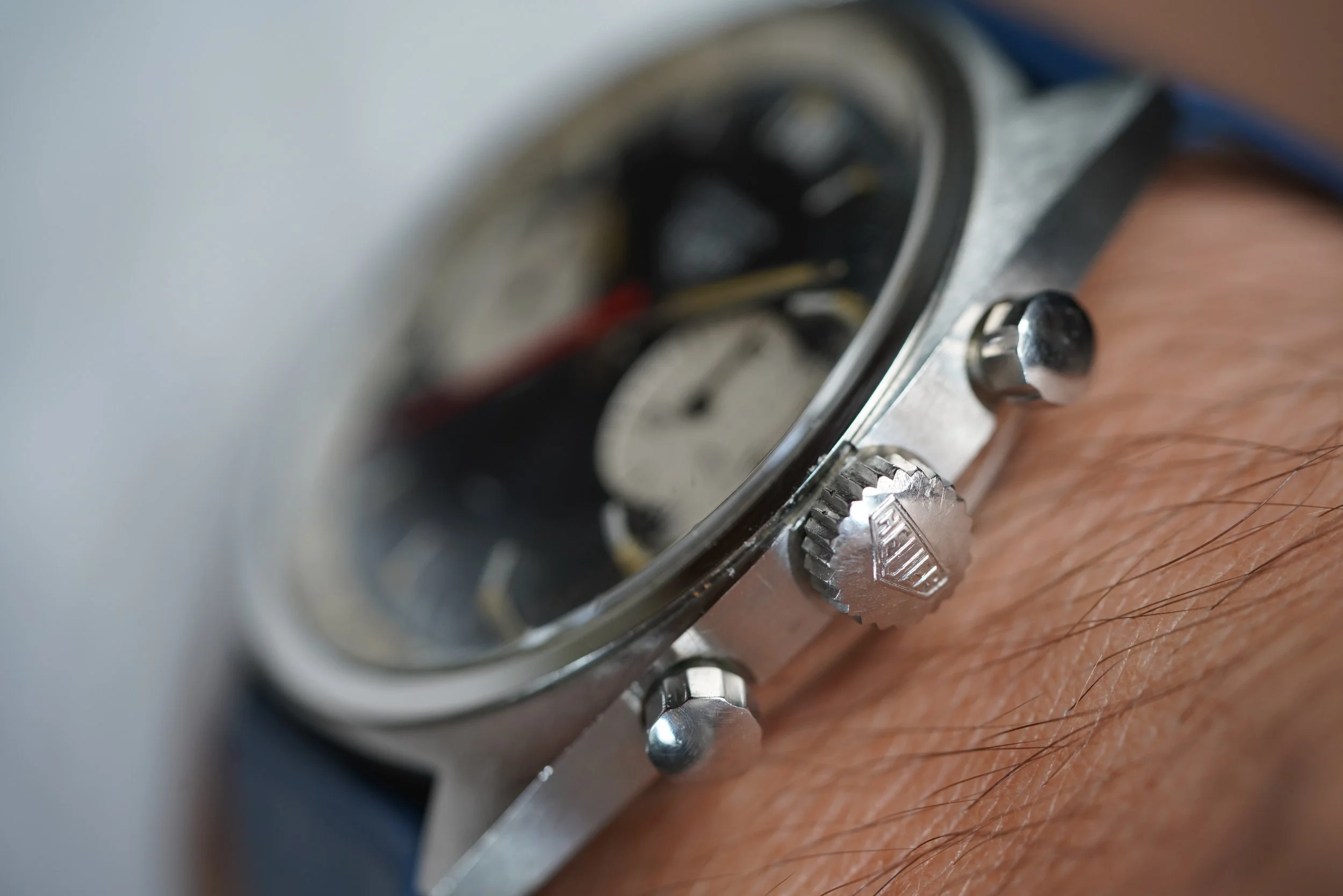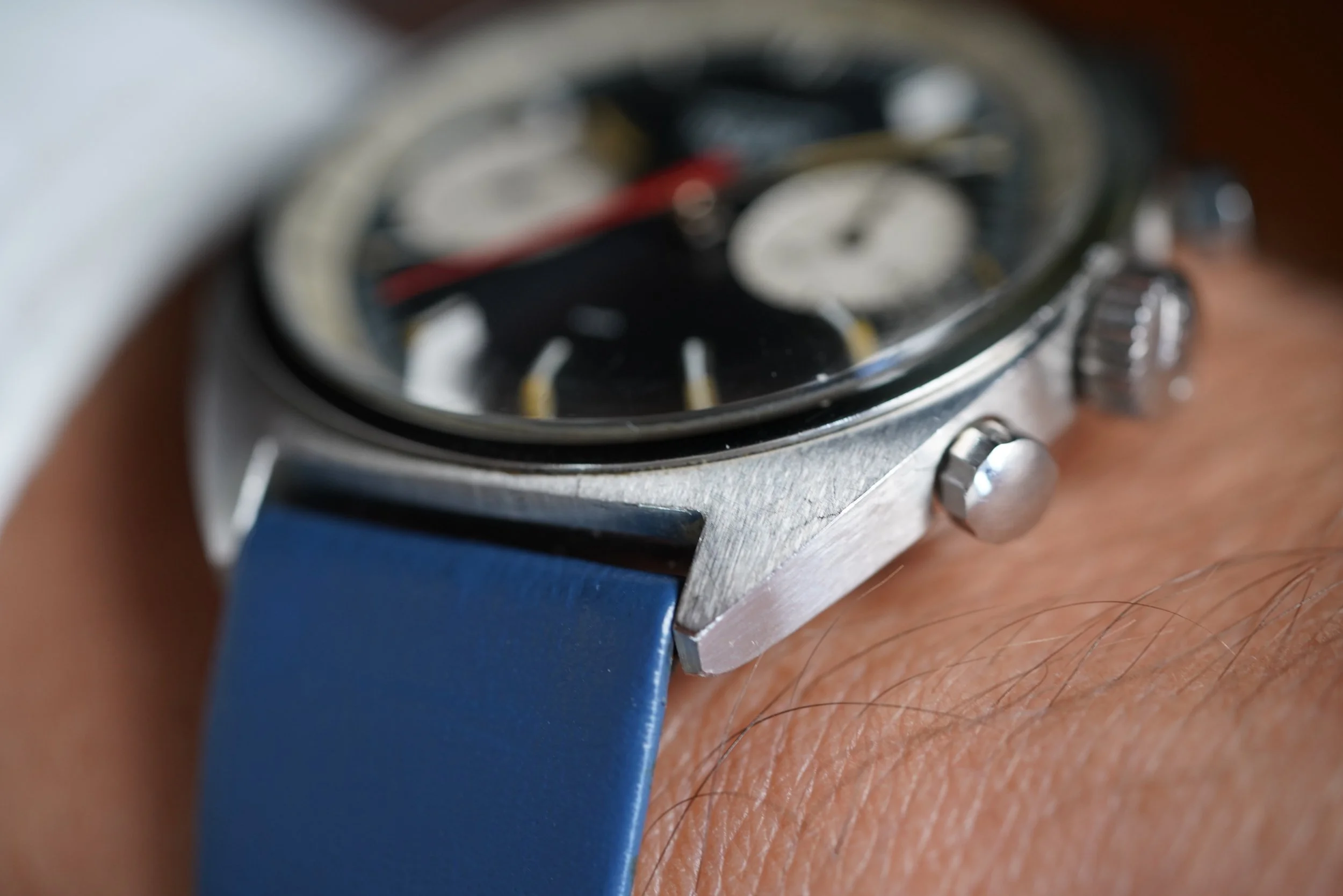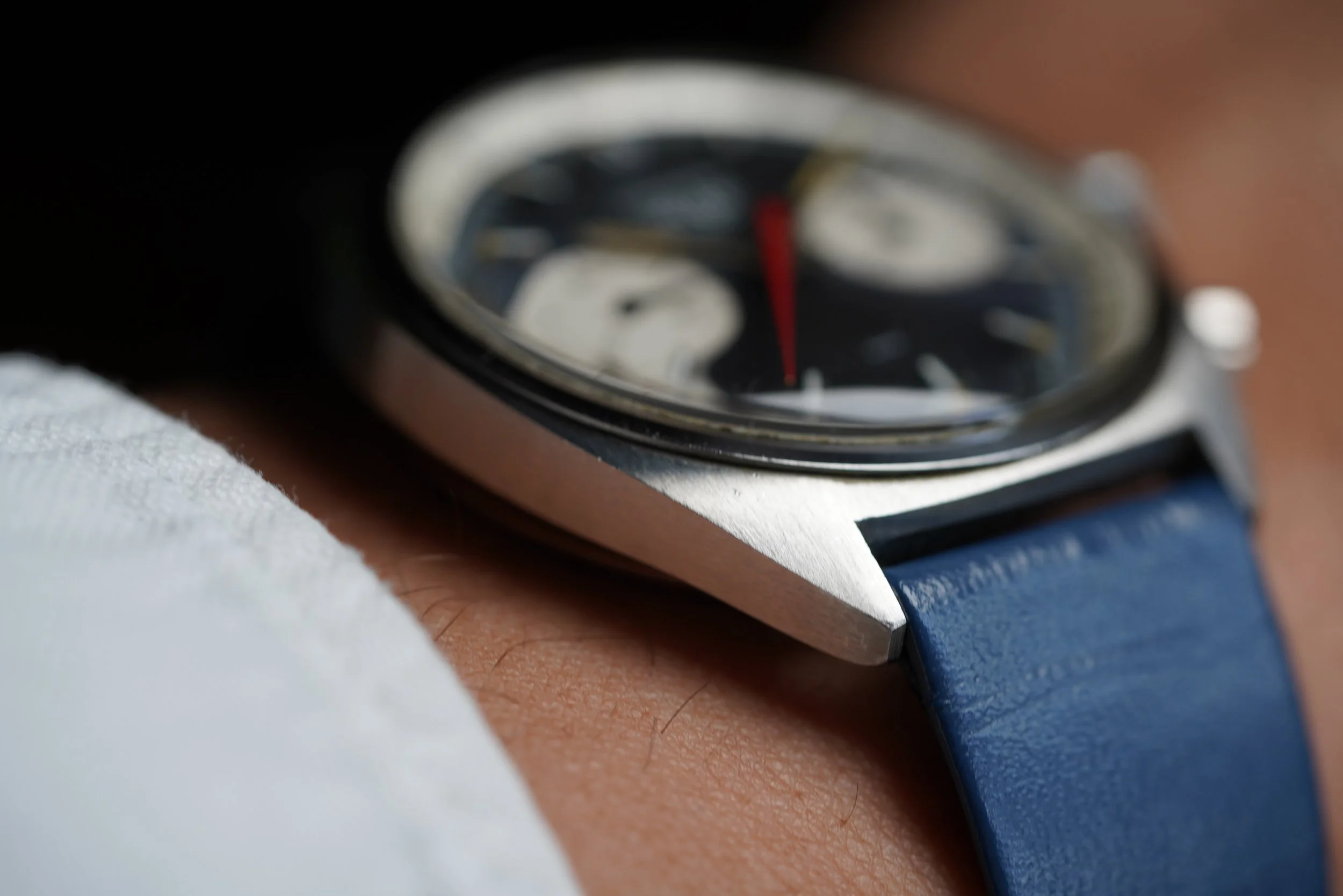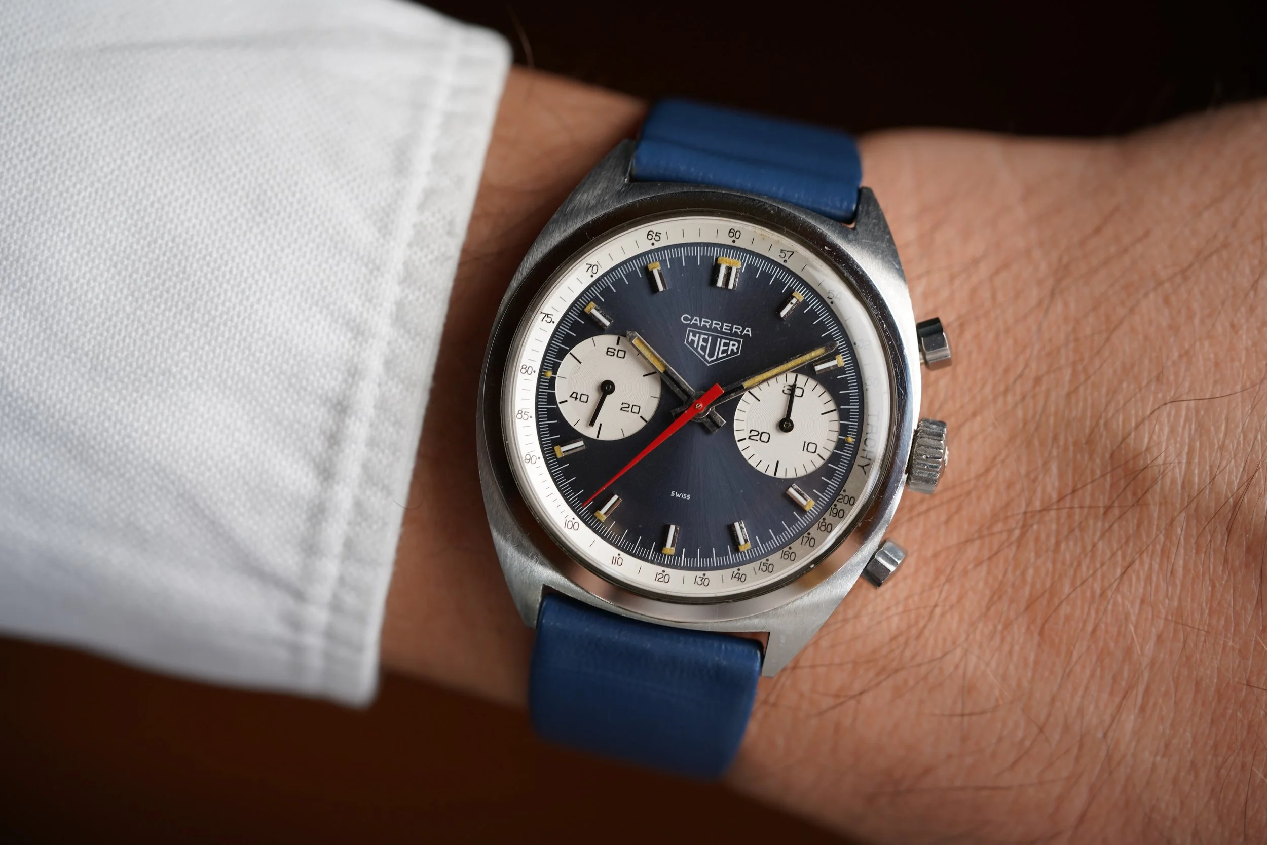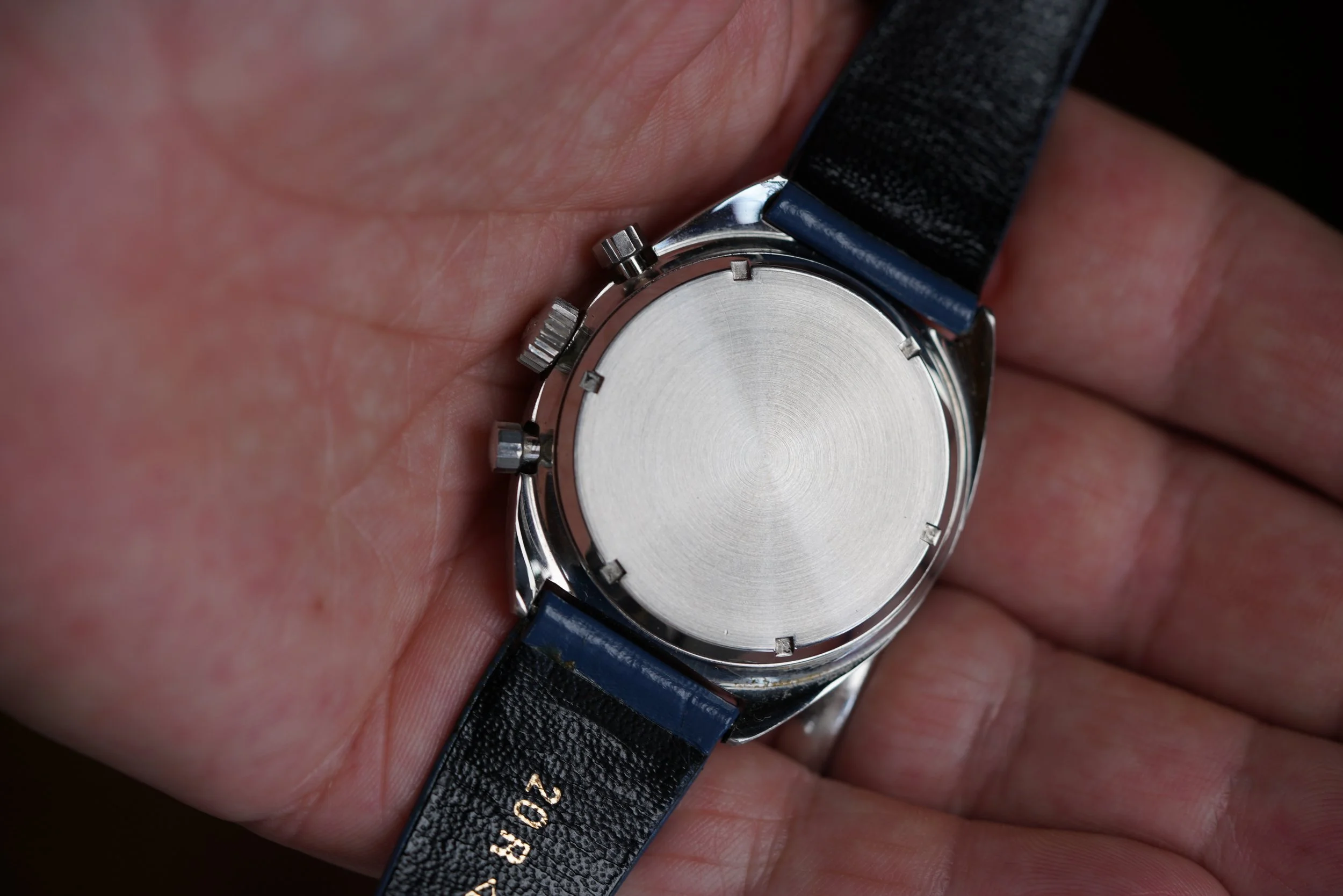 The Heuer Carrera is one of the legendary chronograph designs of the 20th century. You can read more about the origins of the Carrera in the in-depth article that I wrote back in 2013. This Carrera, reference 73353, features an interesting cushion case and blue dial with a tachymeter on the inner bezel. The stainless steel case measures approximately 38mm in diameter and 44mm lug-to-lug. It is paired with a blue leather strap and anonymous stainless steel buckle. The case appears to be unpolished.