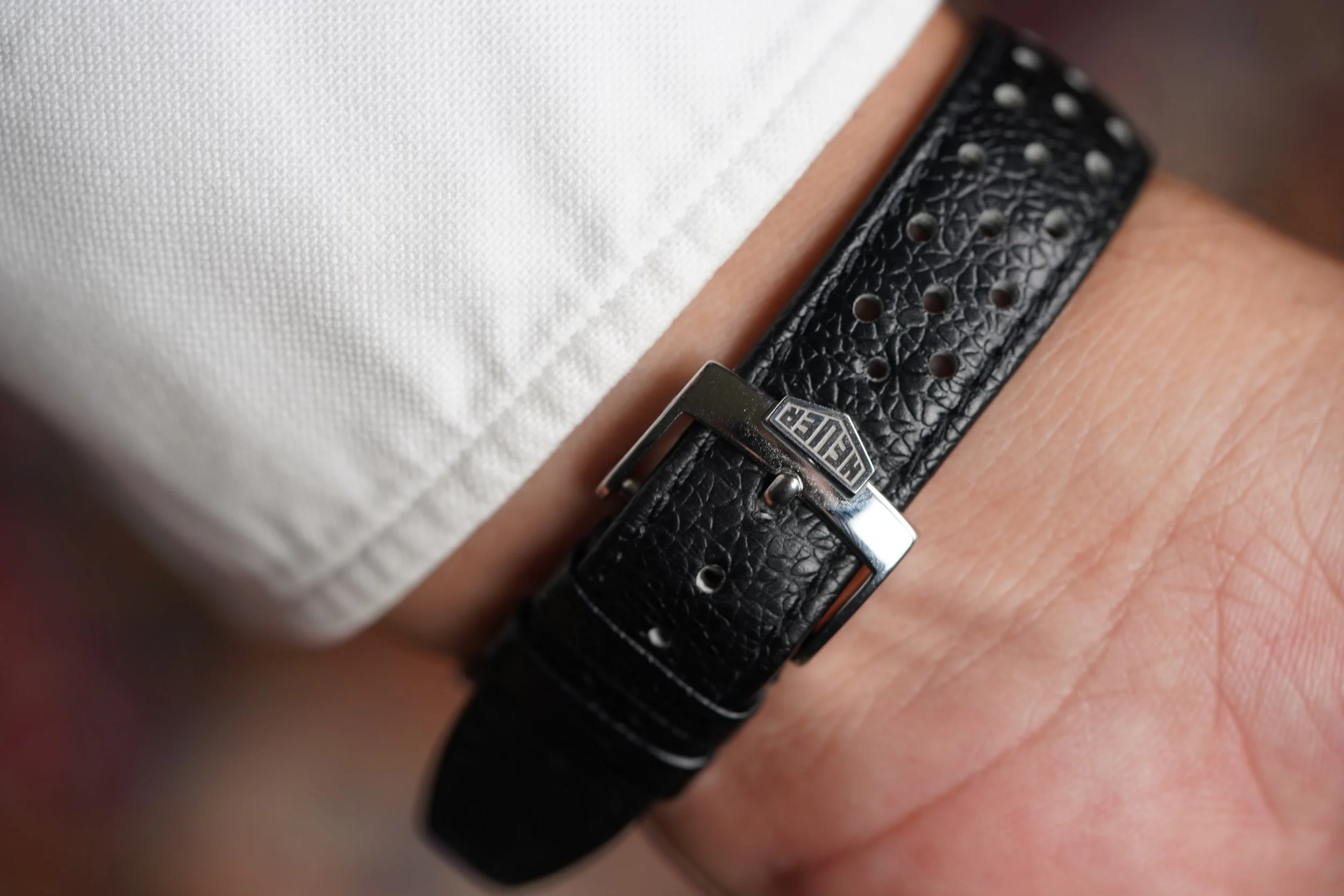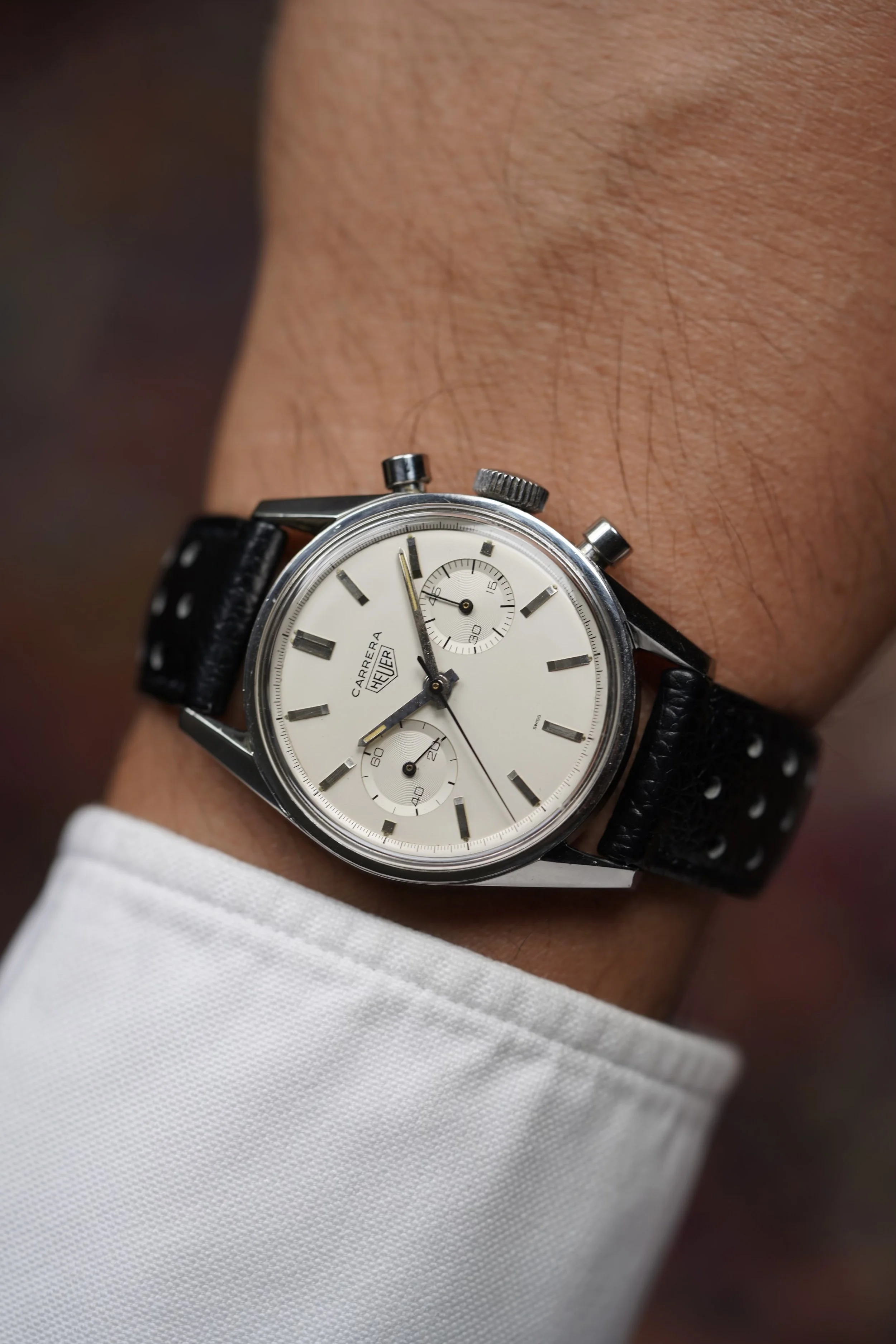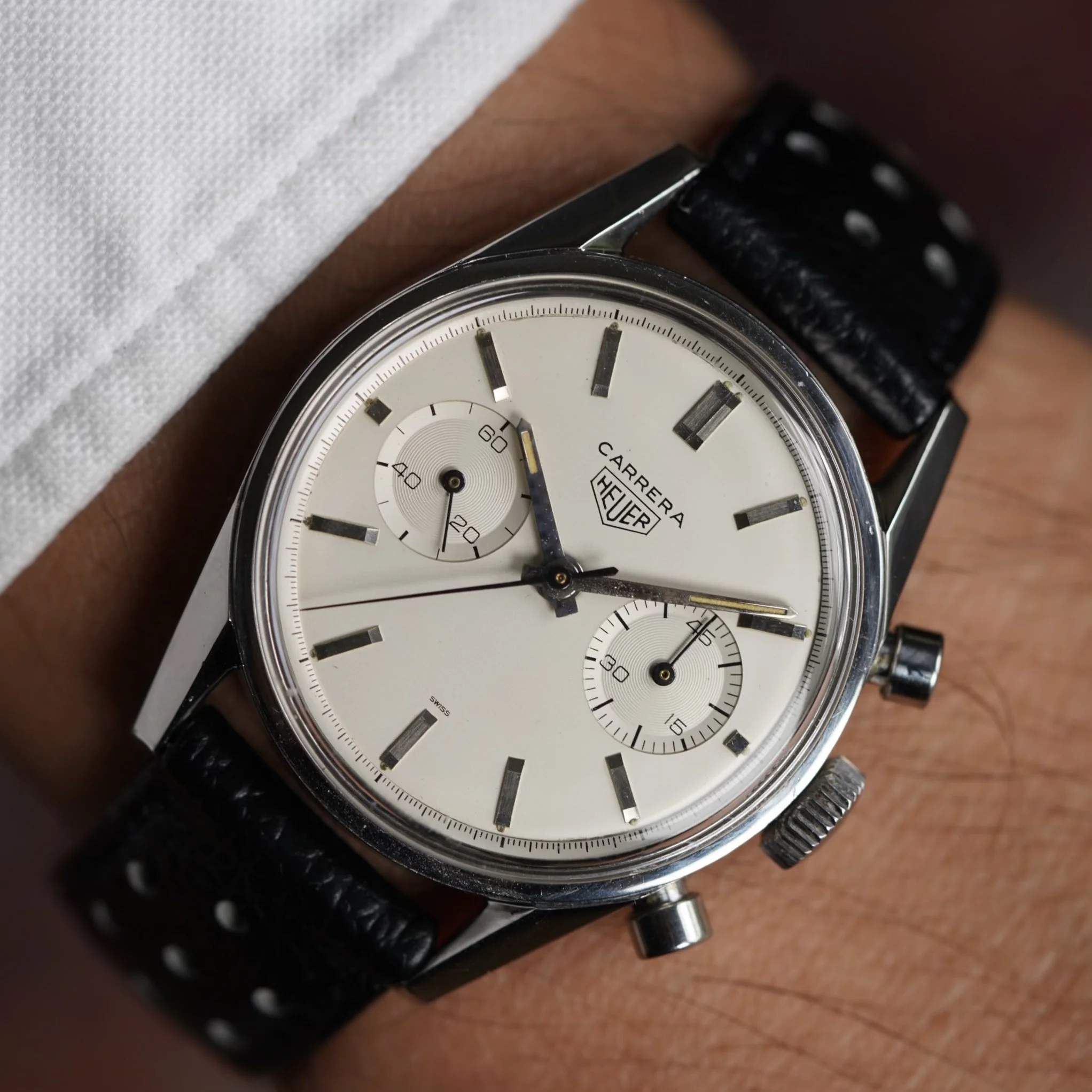 This Heuer Carrera reference 3647S is a very cool and early example with a rare and early “eggshell” white dial. Later examples had silver dials The case lightly polished. It features a SWISS only dial and Heuer buckle.