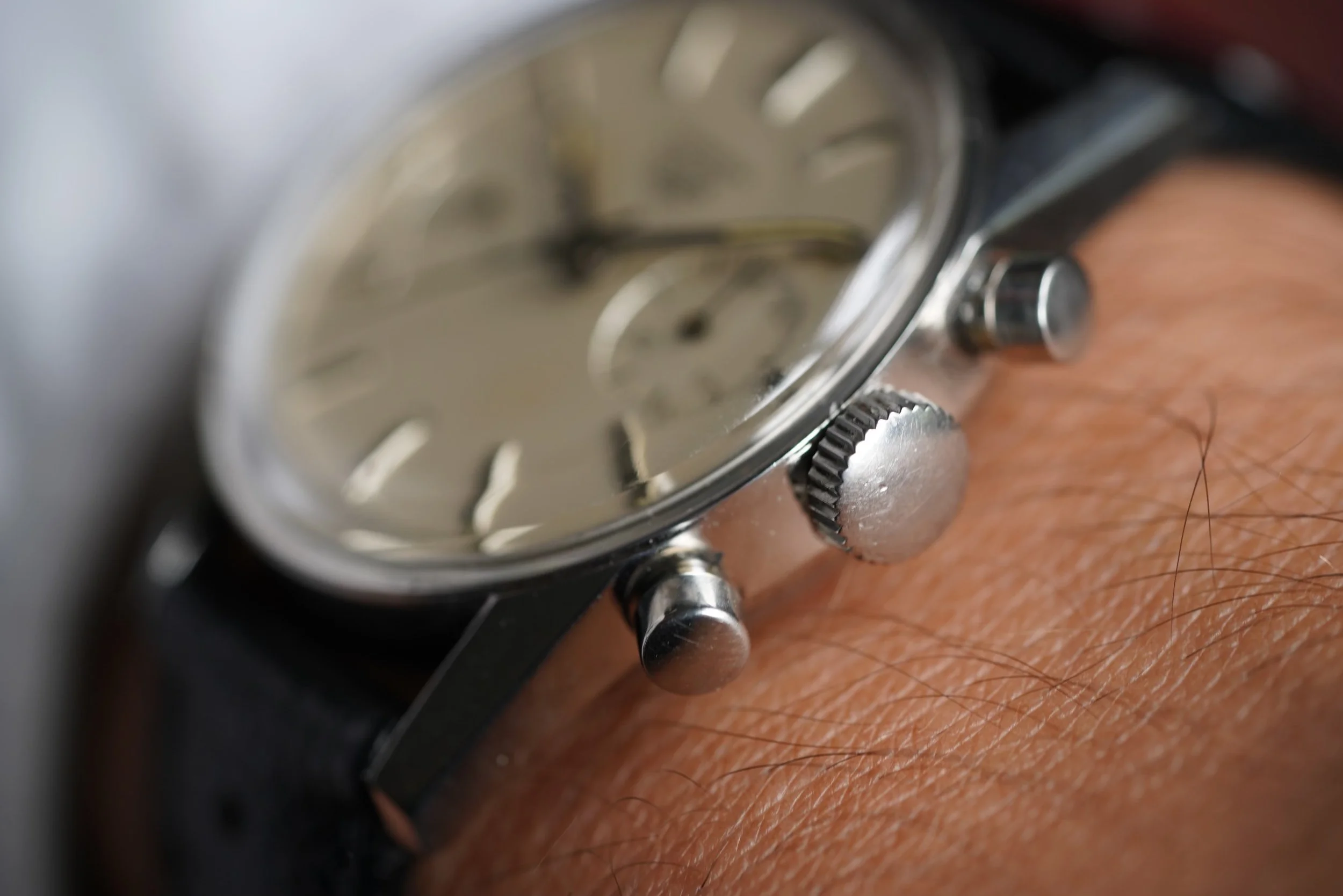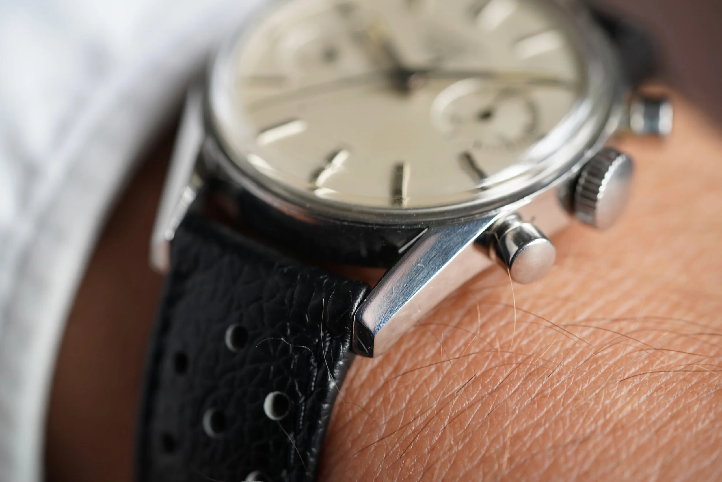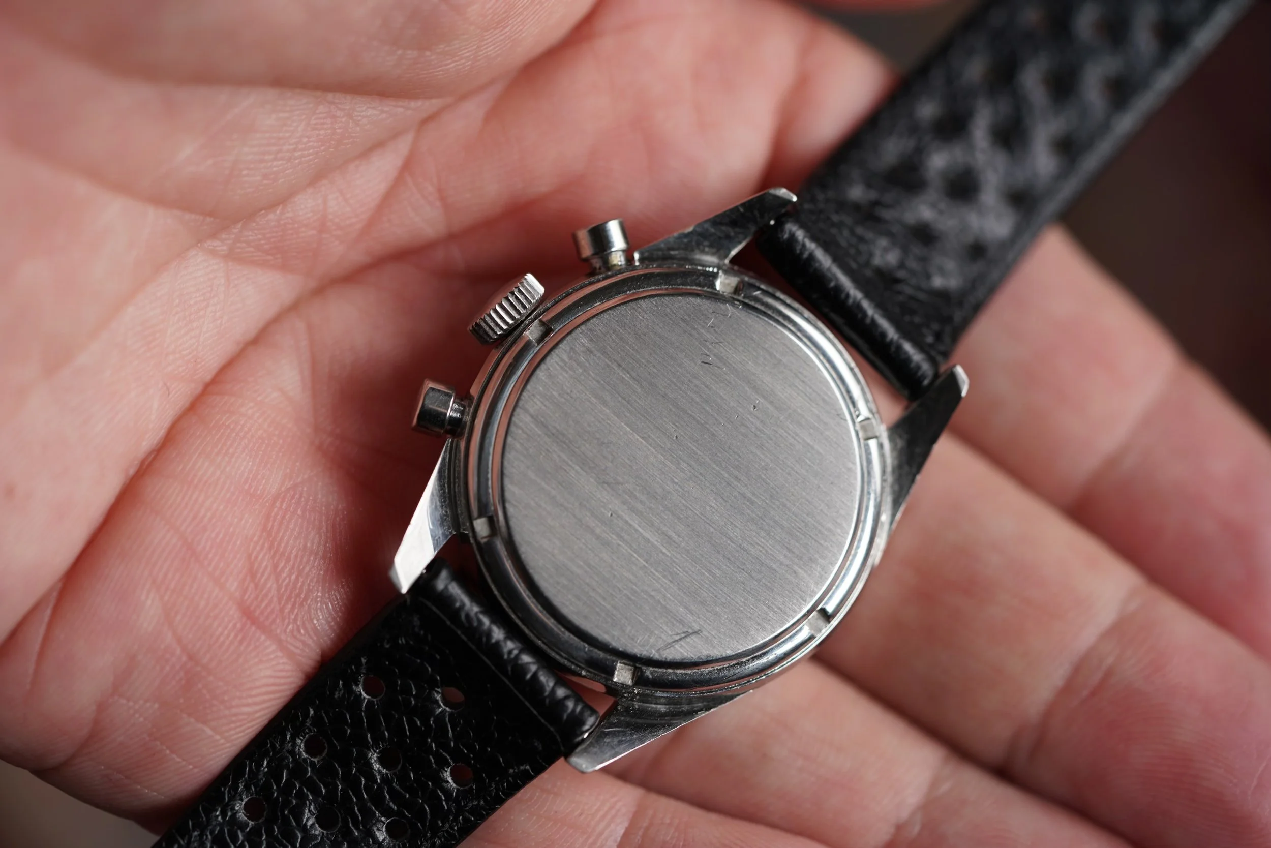This Heuer Carrera reference 3647S is a very cool and early example with a rare and early “eggshell” white dial. Later examples had silver dials The case lightly polished. It features a SWISS only dial and Heuer buckle.