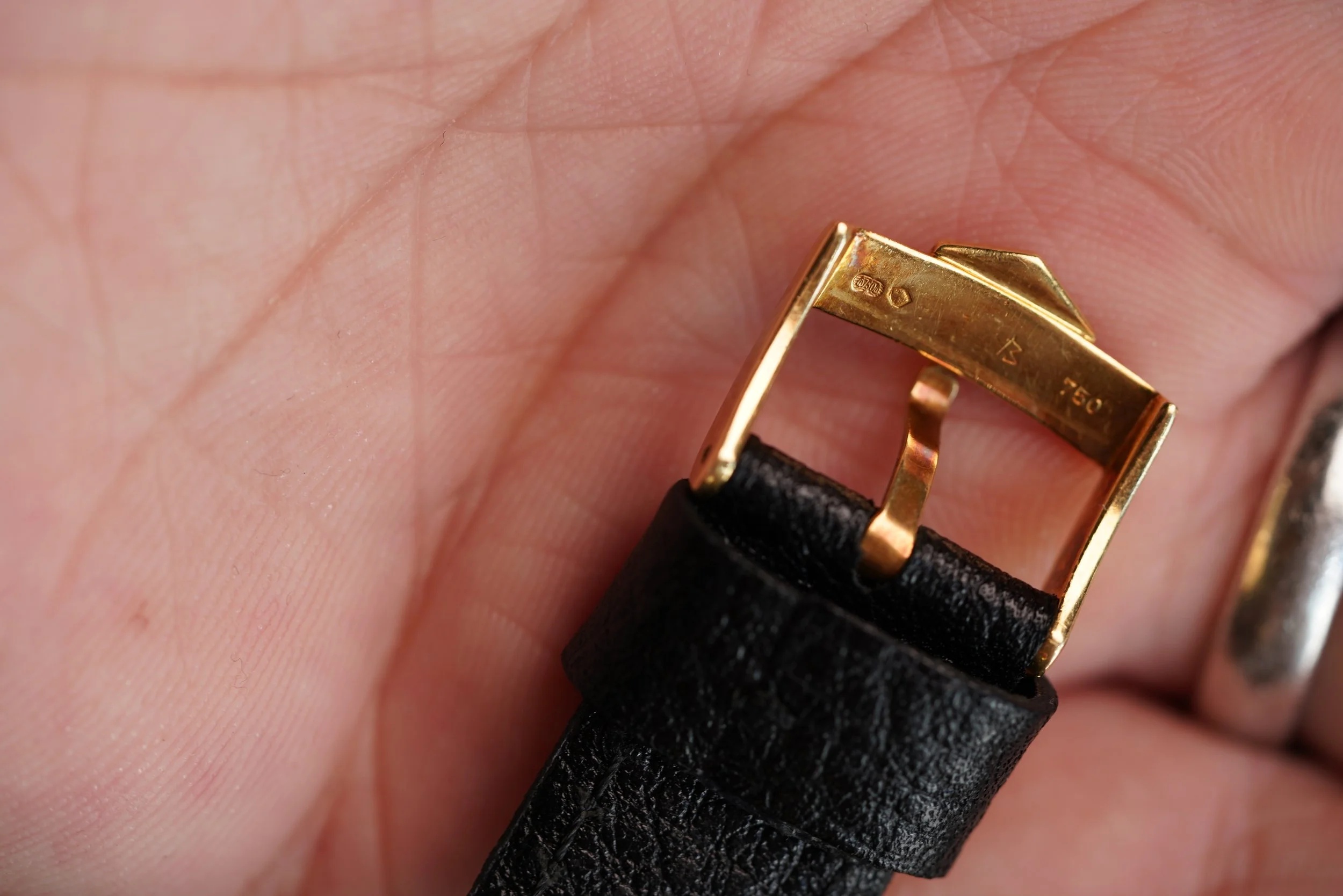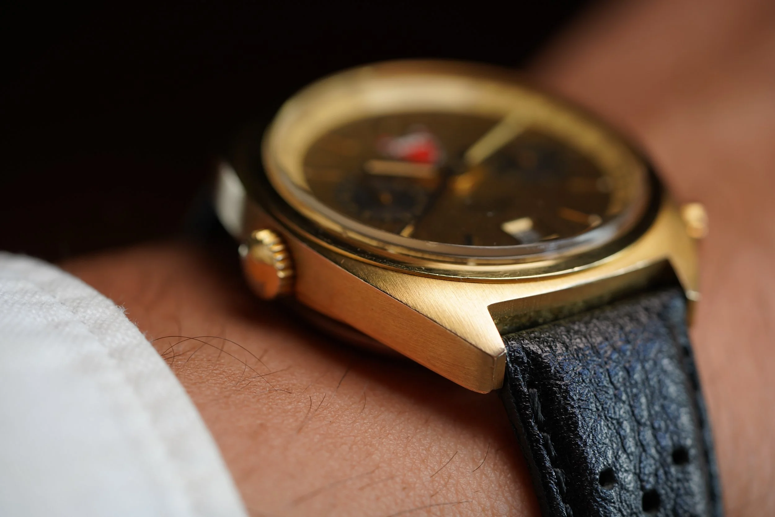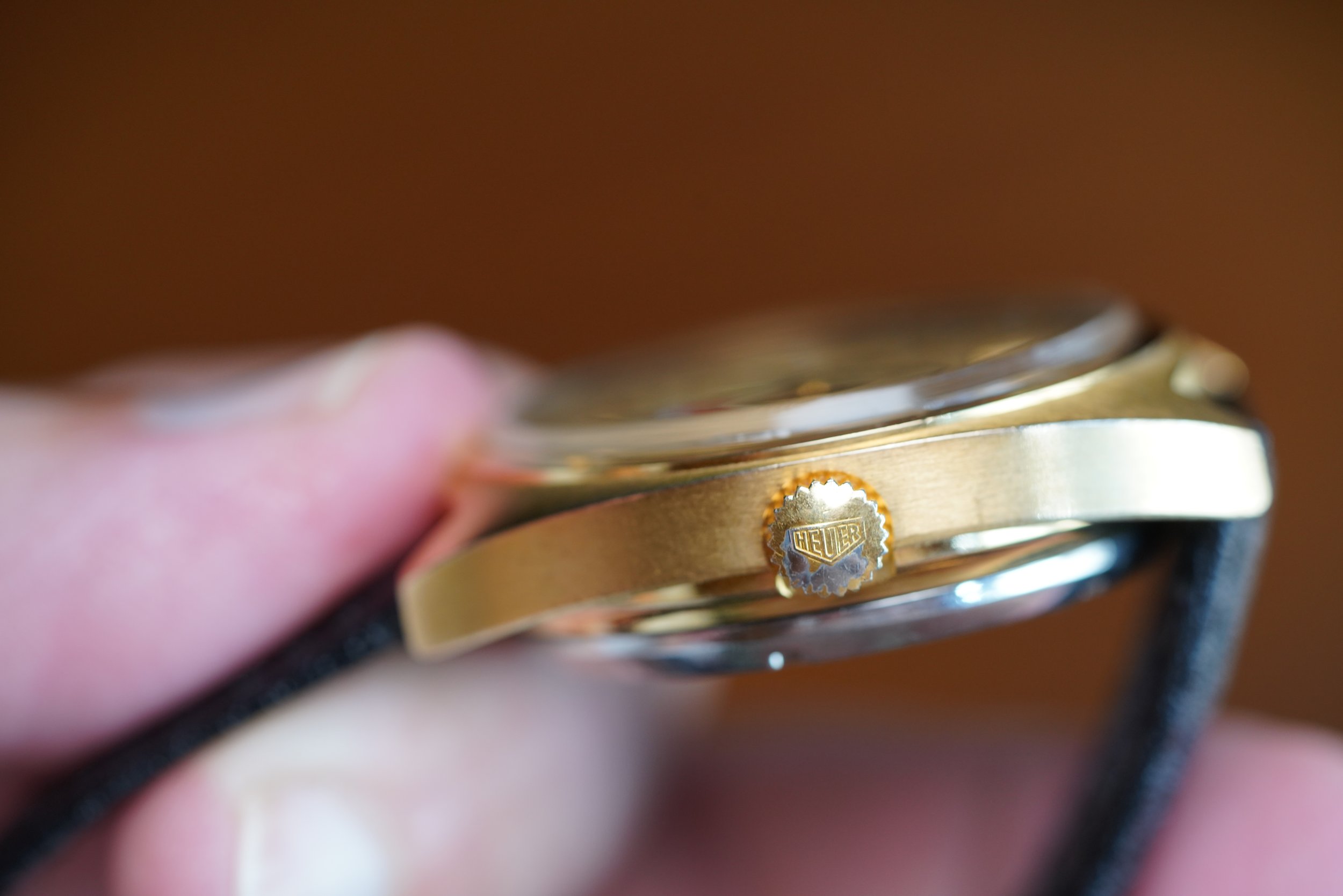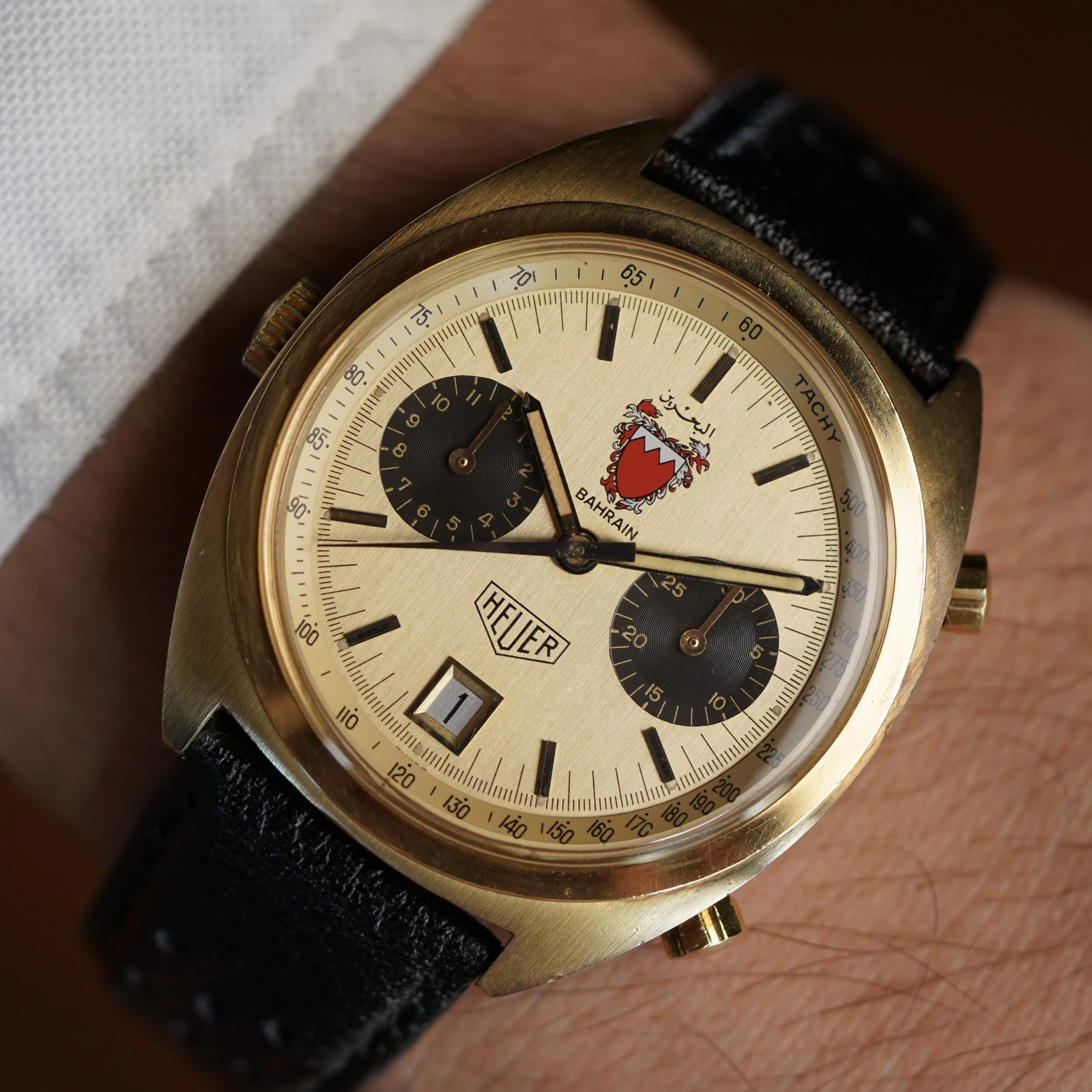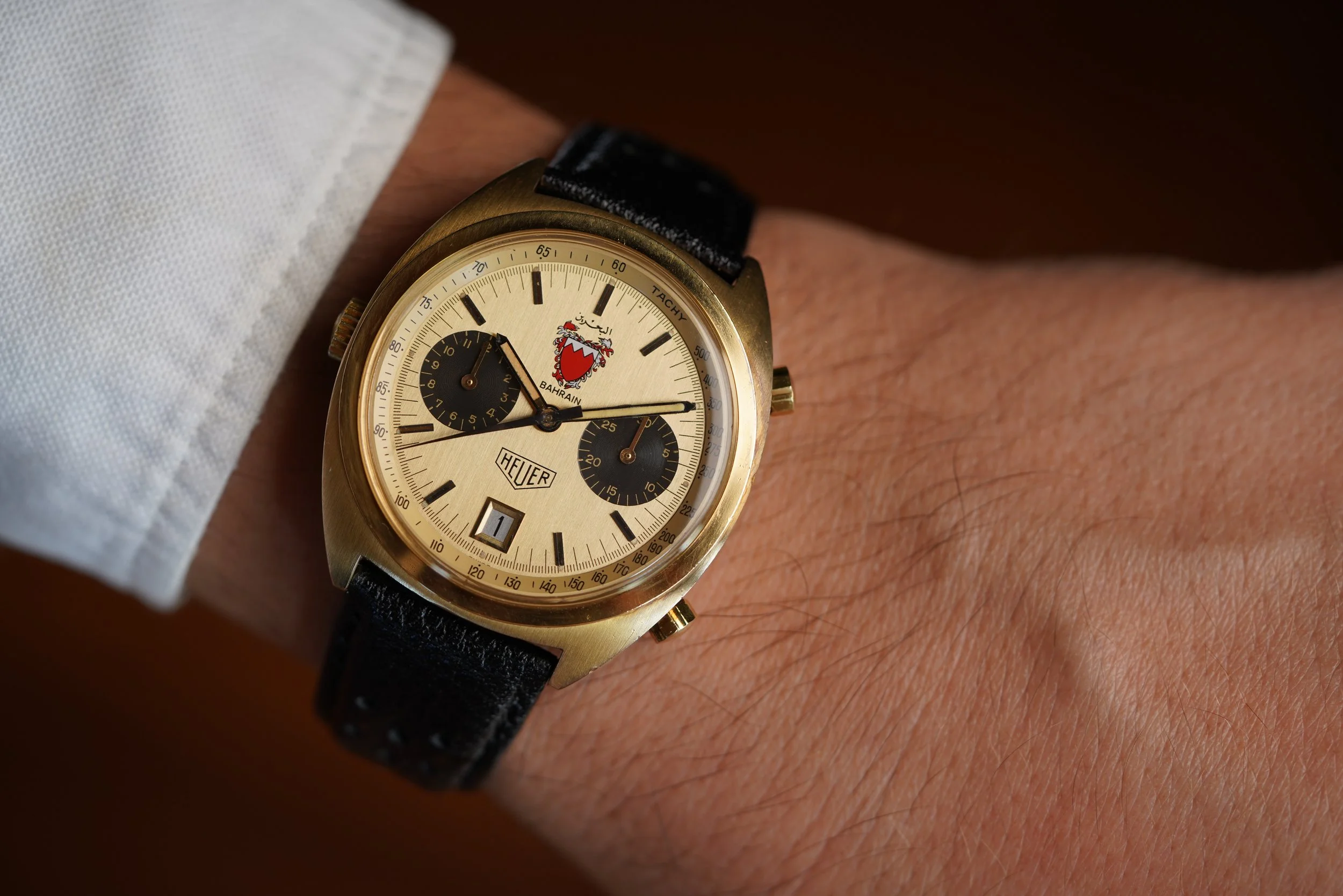 This Heuer Carrera is an interesting part of athletic history as it was made for the Bahraini Olympians of 1980. The dial features a crest and text that reads Bahrain. There is an additional caseback engraving endorsing Heuer as the official timekeeper of the Olympics. The case is gold-plated and measures approximately 38mm in diameter and 43mm lug-to-lug. It is paired with an unsigned black rally strap and an 18k yellow gold Heuer buckle.