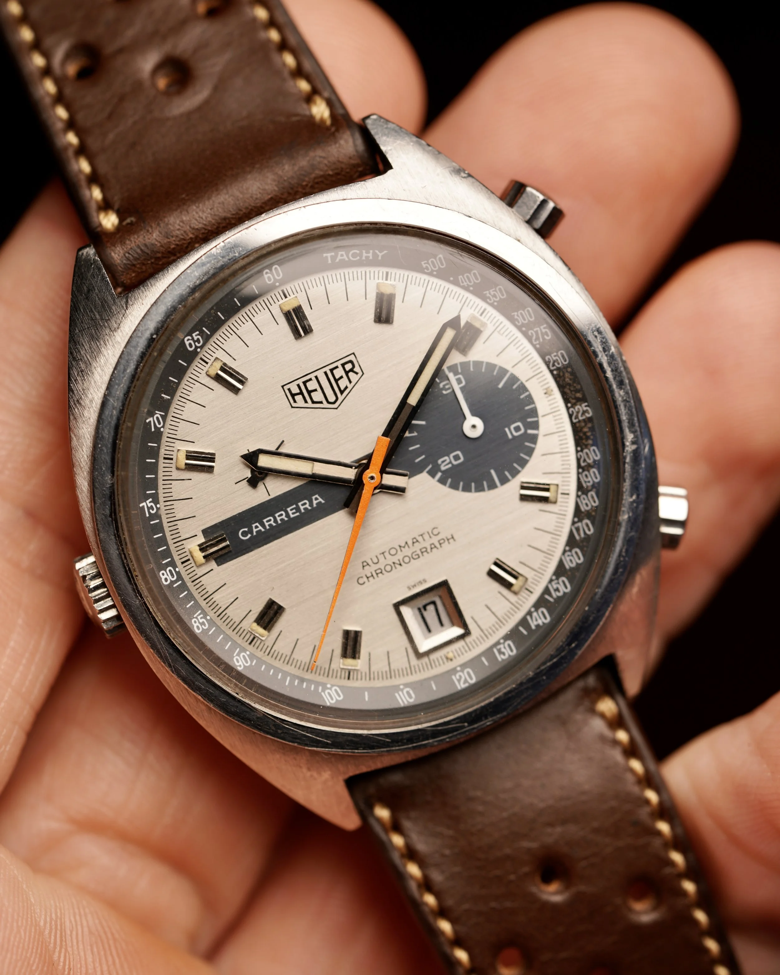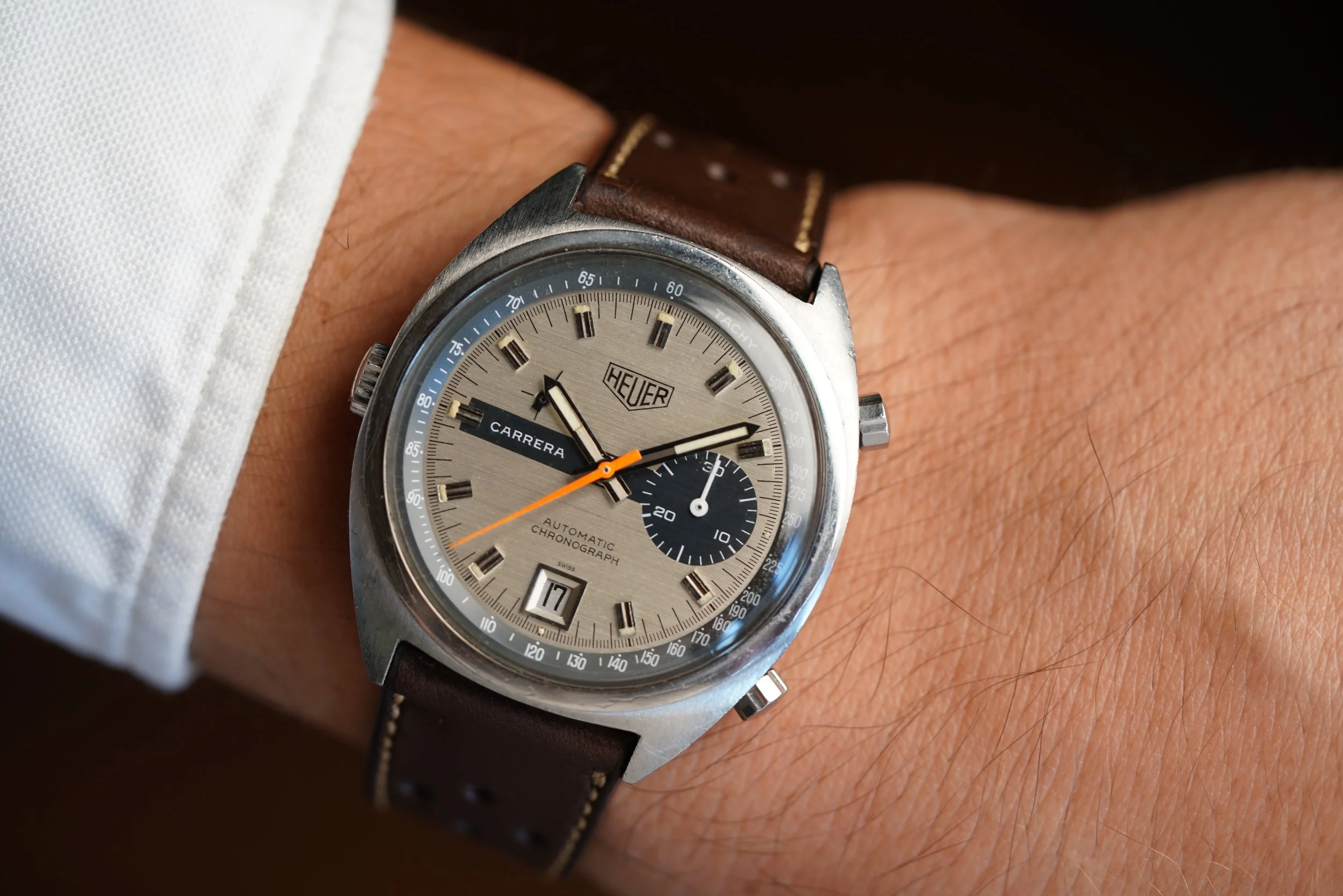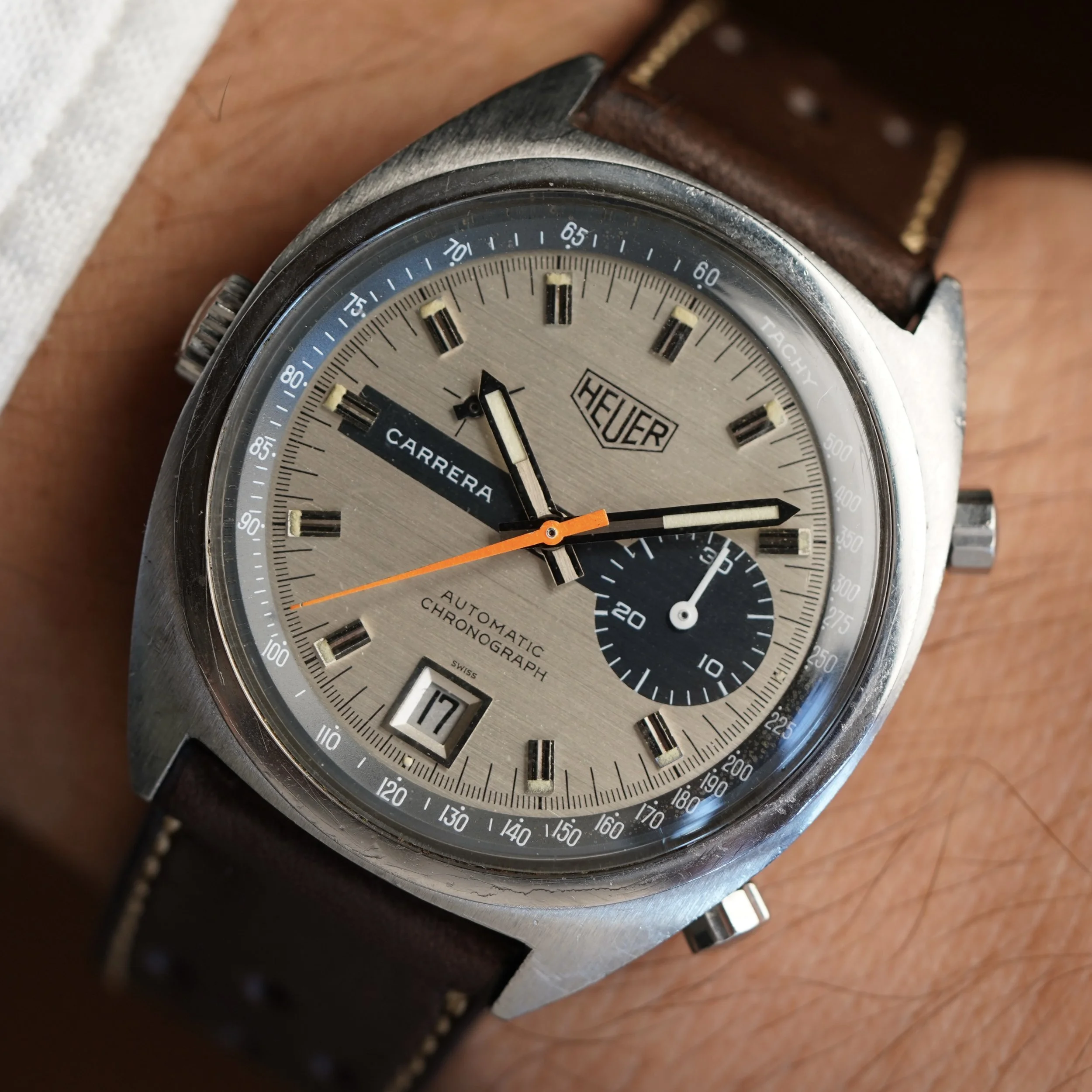 This Heuer Carrera reference 1553 N with a blue dial is a fantastic sports chronograph in stainless steel. The watch features a tachymeter on the inner bezel, with a stark orange contrast chronograph hand. The case appears to be unpolished. It measures 38mm in diameter.