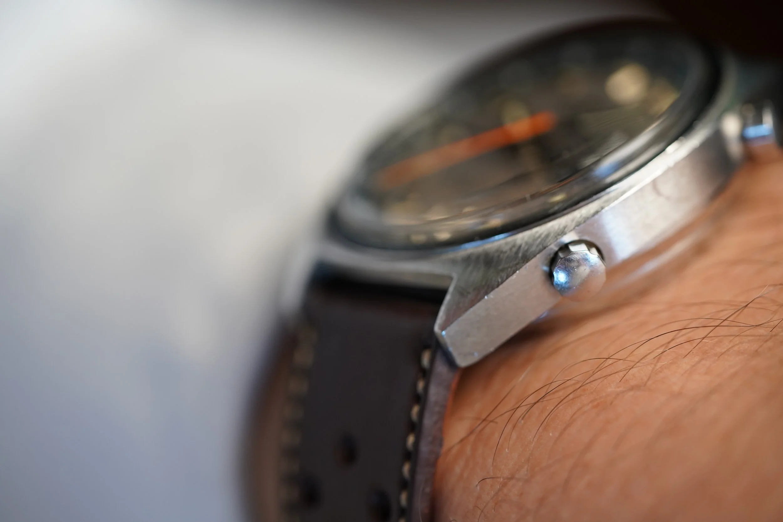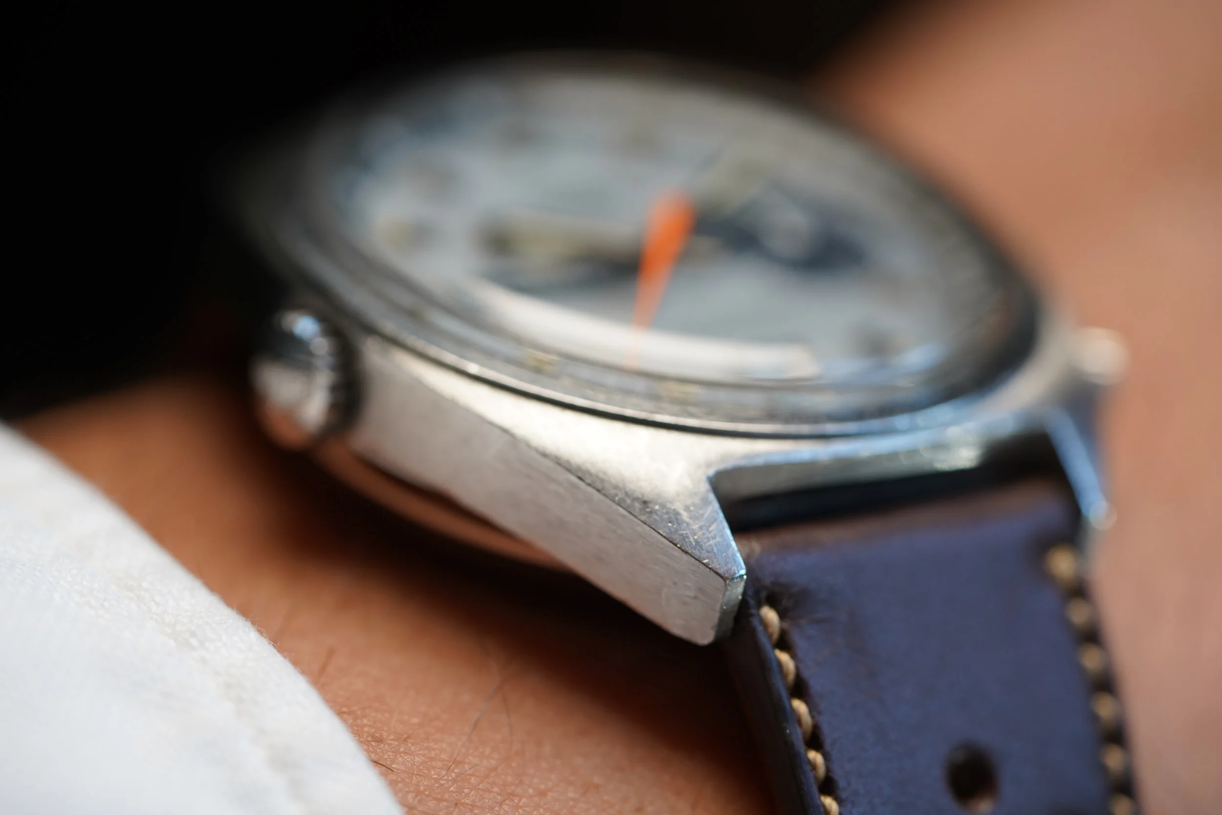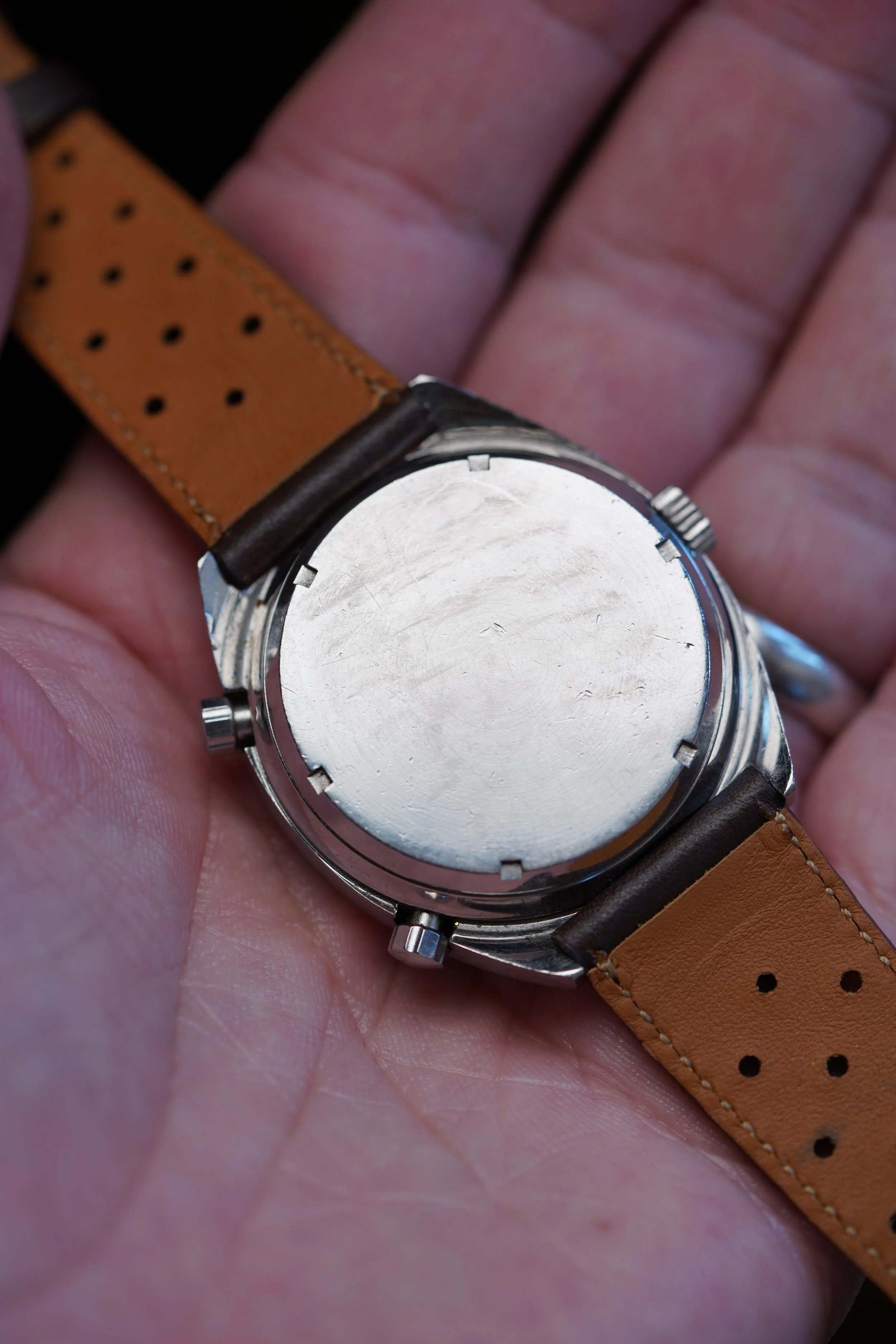 This Heuer Carrera reference 1553 N with a blue dial is a fantastic sports chronograph in stainless steel. The watch features a tachymeter on the inner bezel, with a stark orange contrast chronograph hand. The case appears to be unpolished. It measures 38mm in diameter.