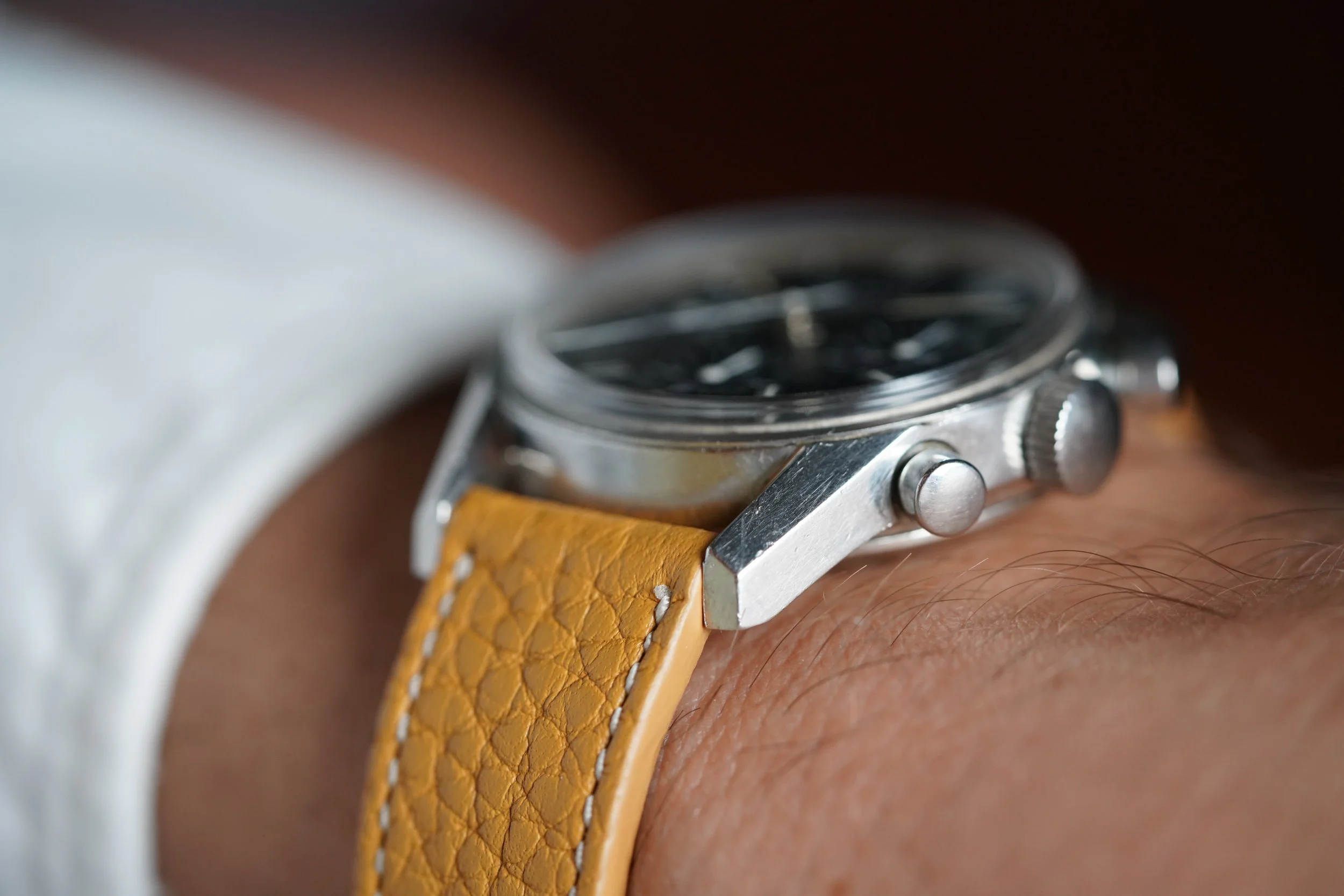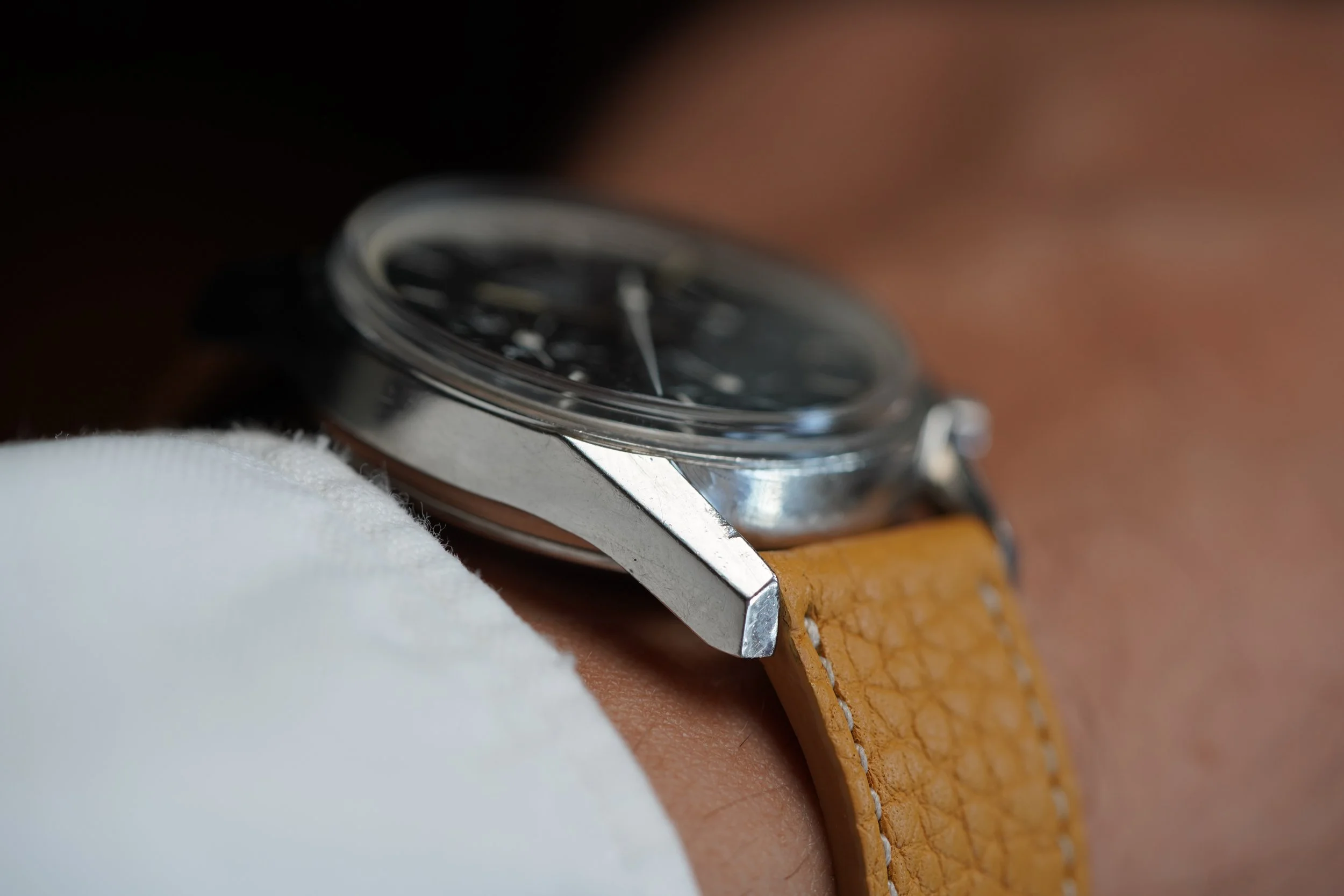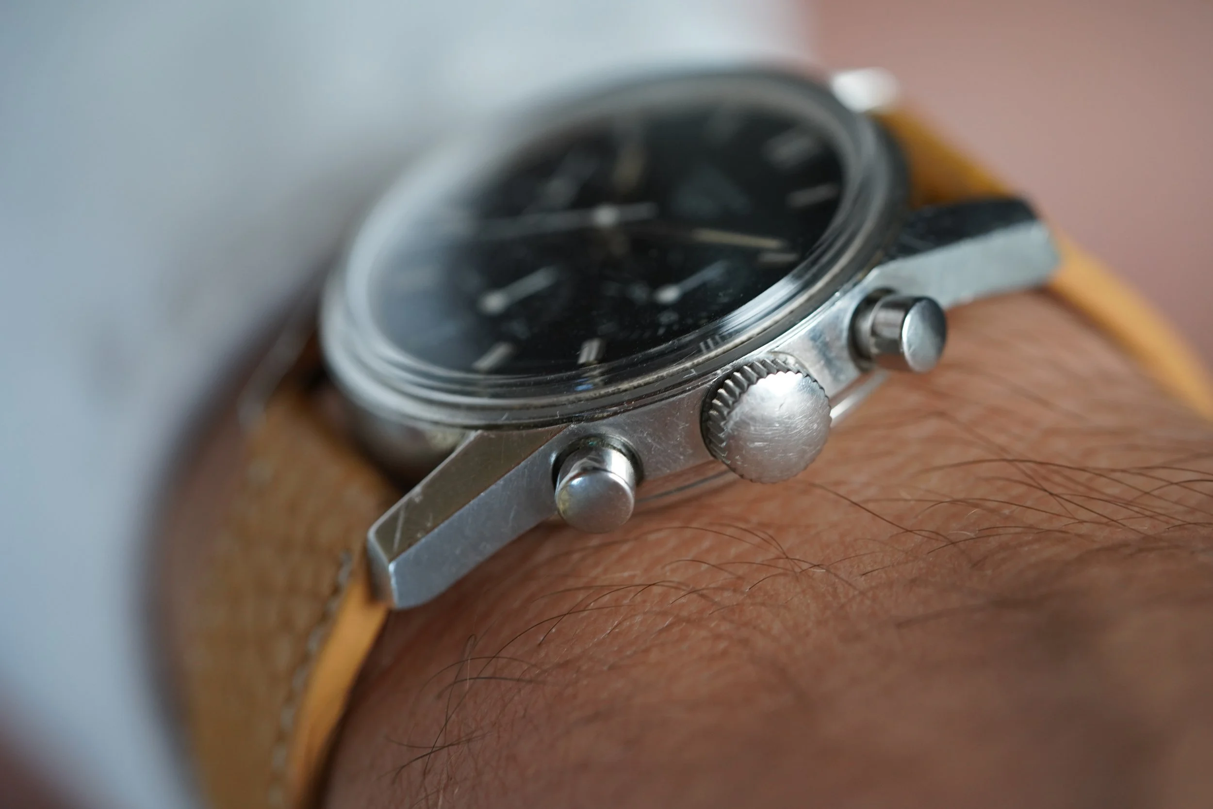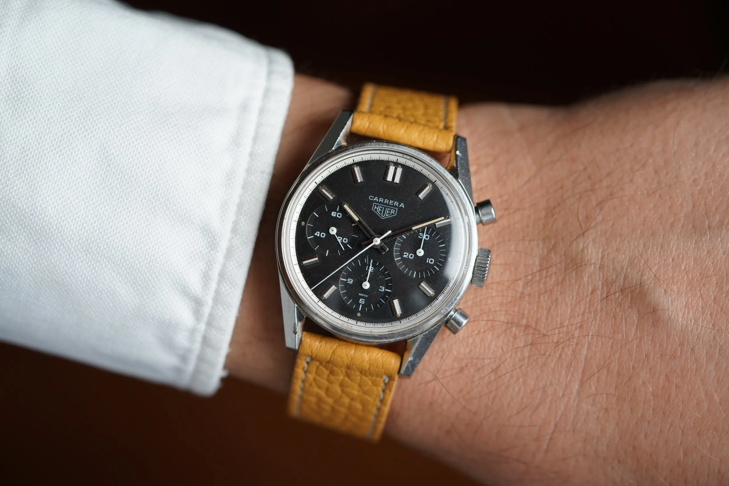 The Carrera is an iconic sports chronograph which is one of the most versatile watches to have in a collection. This is a very attractive example with the black dial. The case appears to be unpolished. It measures 36 millimeters in diameter and 45mm lug-to-lug. The watch is powered by the Valjoux manual-winding calibre 72. It is paired on a nice tan strap and annonymous buckle. The watch dates to the late 1960s.