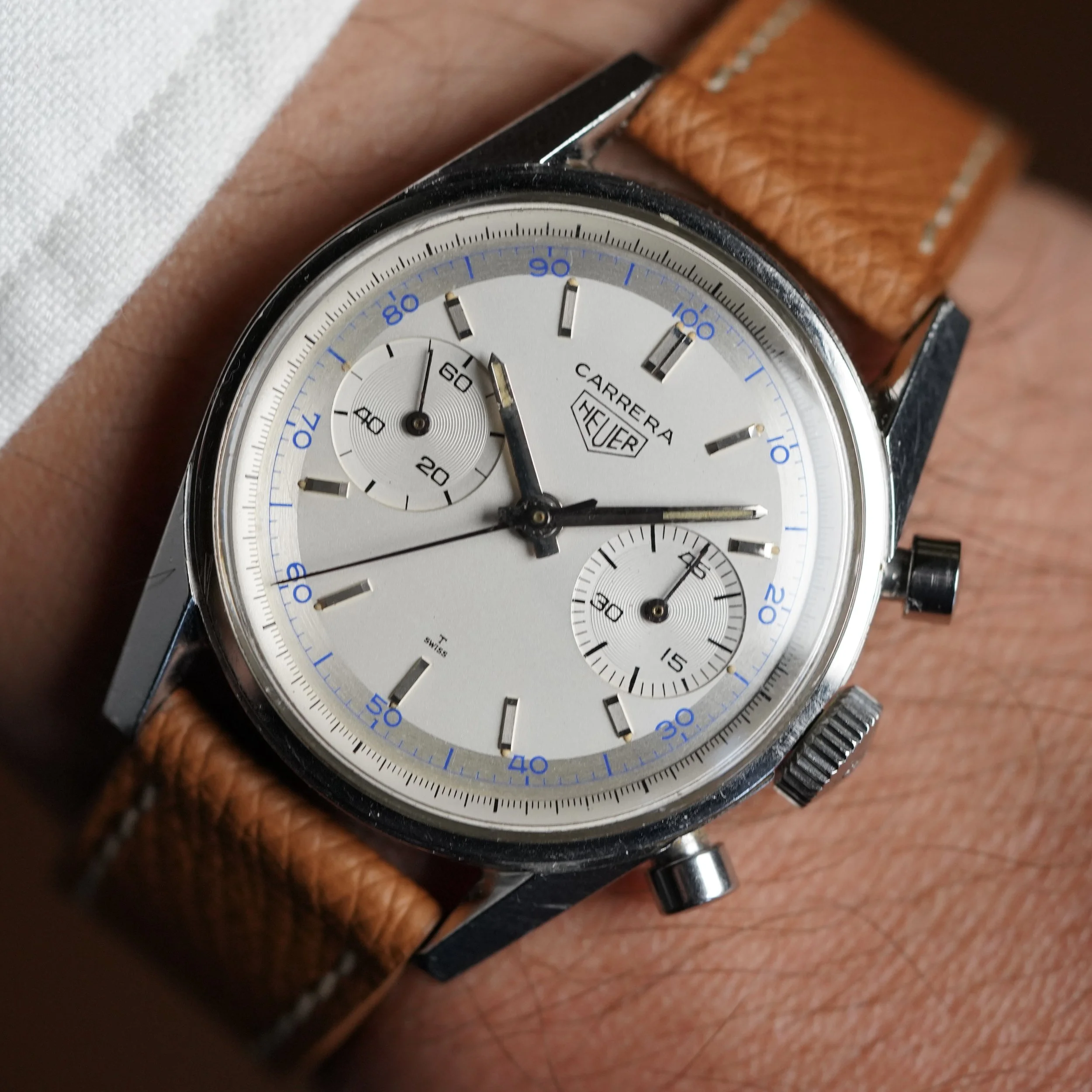 This Heuer Carrera reference 3647D is a fantastic watch with a blue decimal dial. These blue accents are incredibly attractive and this is one of my favorites. These were used to track efficiency in work environments.
