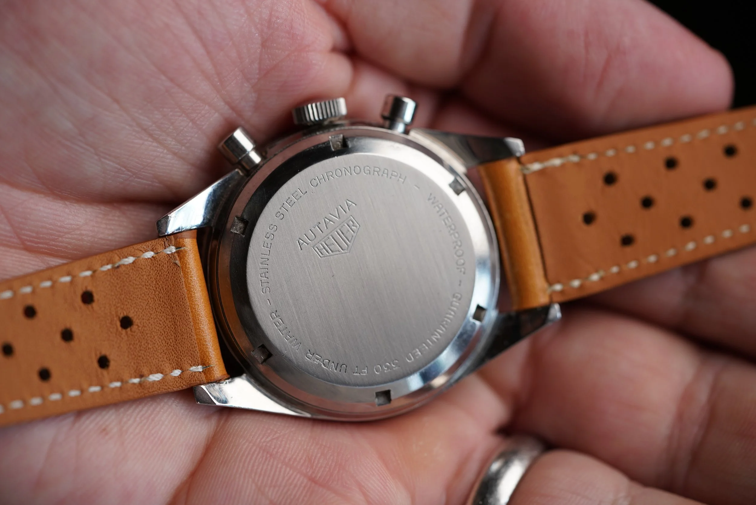 Along with many of its contemporaries of the era, it is powered by the Valjoux 72. This example is the first generation case of the Autavia with larger subdials. The dimensions are 38mm (48mm lug-to-lug). The cases are made Huguenin Freres.