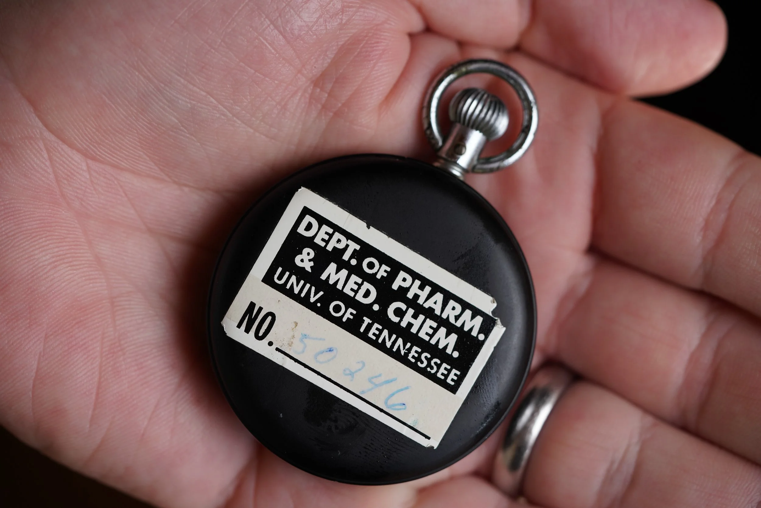 This stopwatch dates to the 1960s. It measures 51mm in diameter and is 17mm thick. We love these sentimental entries into the world of Heuer without the commitment of a several thousand dollar watch. This stop watch has a stop start reset chronograph, with 30 minute elapsed time sub dial at 12 o’clock. This example features a caseback sticker, from the departments of Pharmacology, Medicine and chemistry at the University of Tennessee.