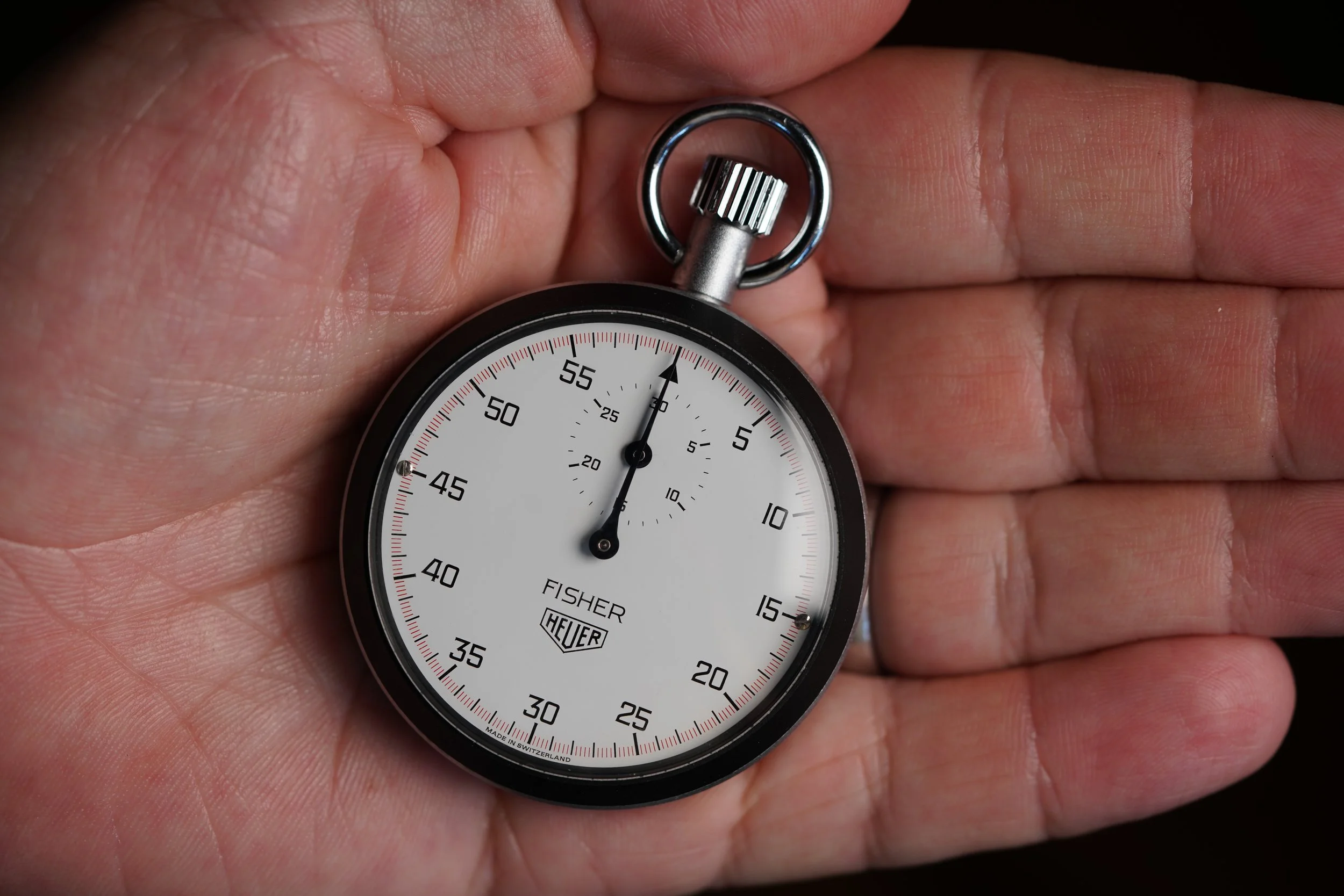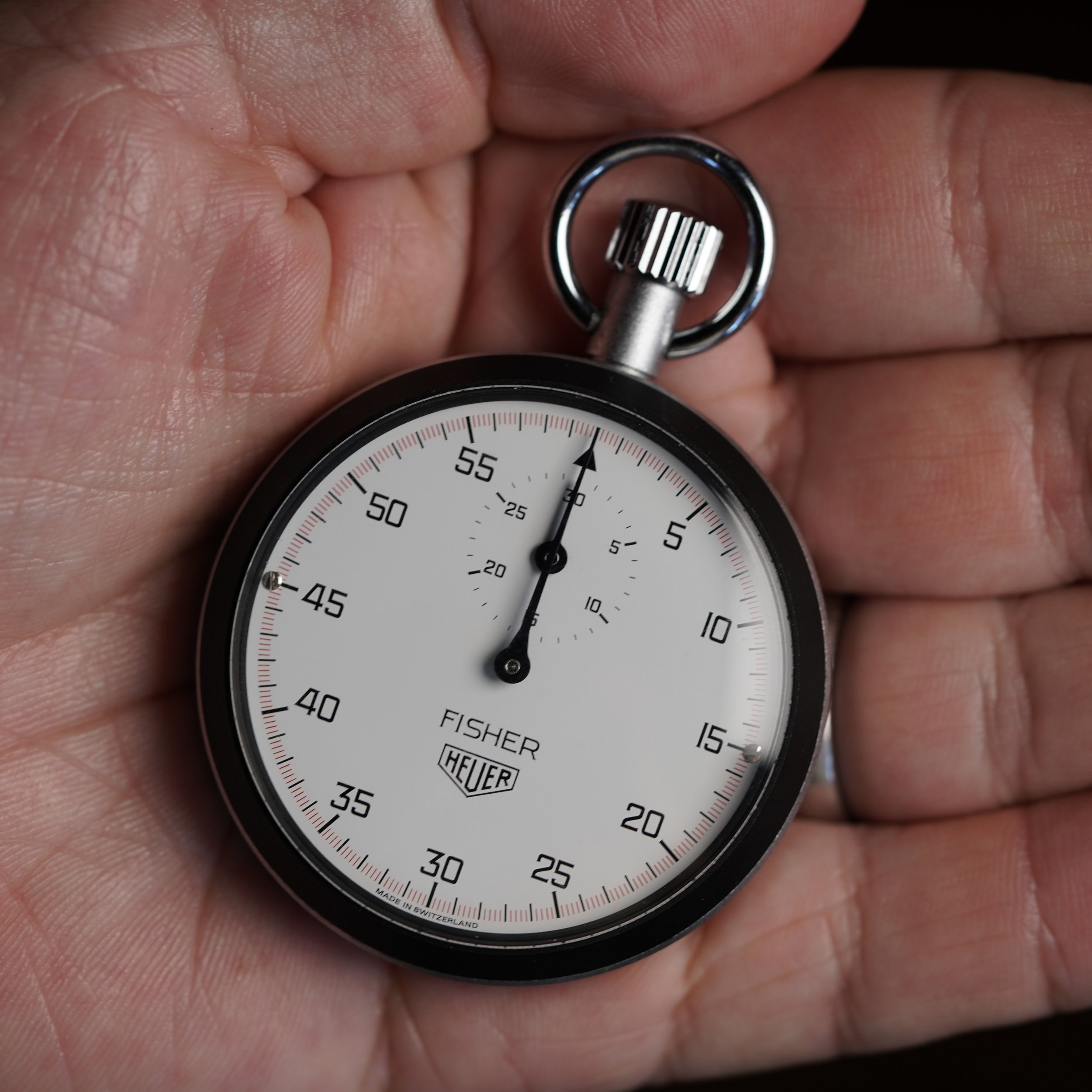 Most of us are familiar with Heuer’s fantastic track and racing history, but lesser discussed are the timing instruments made for the laboratory! The brand was the preeminent maker of stopwatches for scientific settings. Fisher was a seller of scientific instruments supplies in Pennsylvania, USA. It measures approximately 53mm. This stopwatch dates to the 1960s. We love these sentimental entries into the world of Heuer without the commitment of a several thousand dollar watch. This stop watch has a stop start reset chronograph, with 30 minute elapsed time sub dial at 12 o’clock.