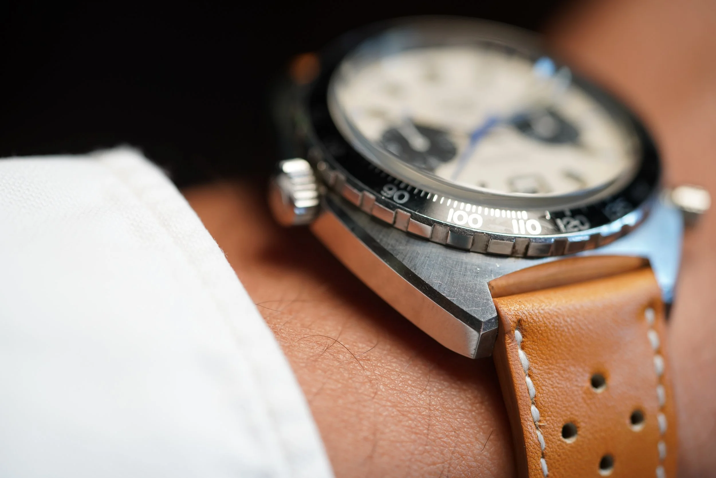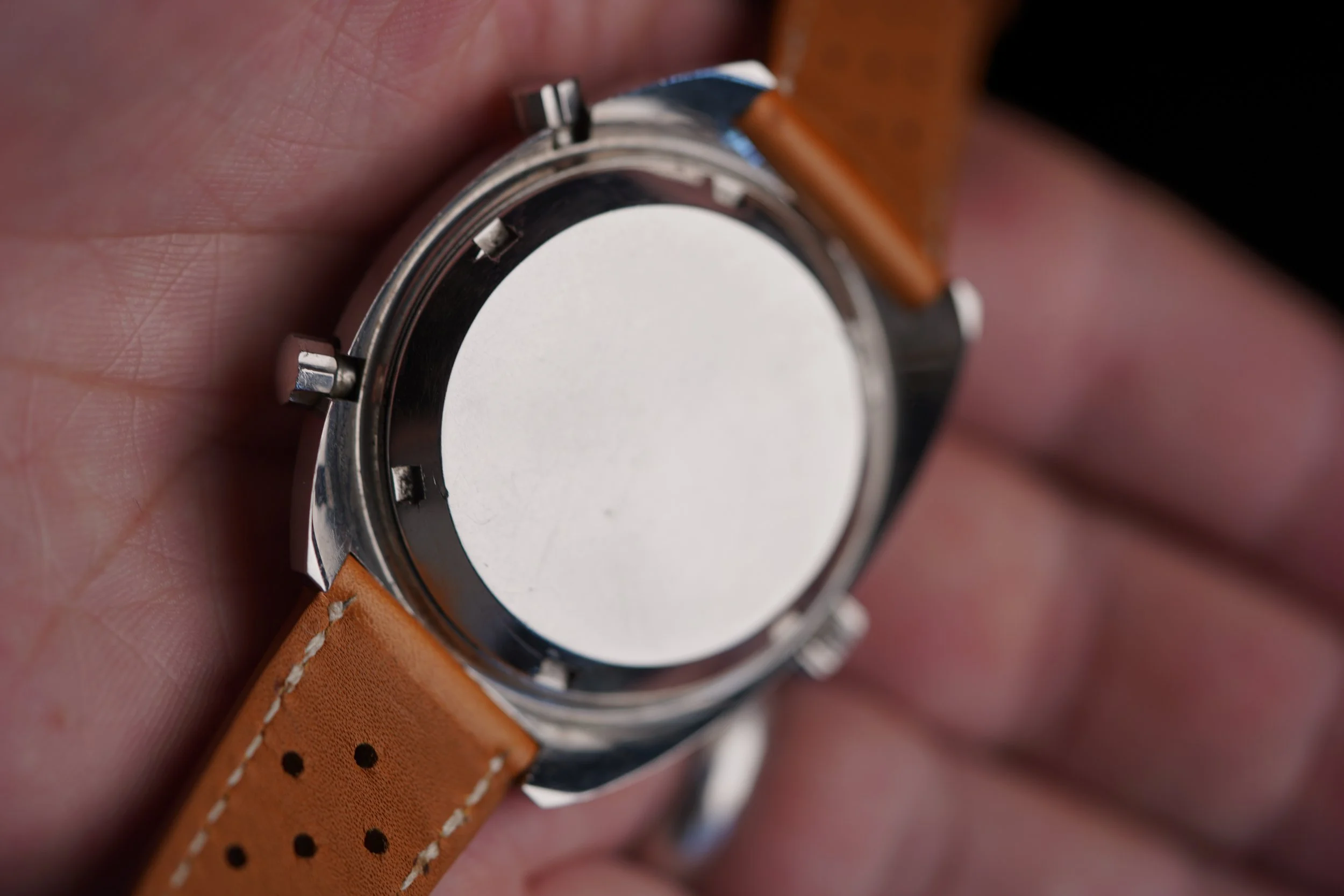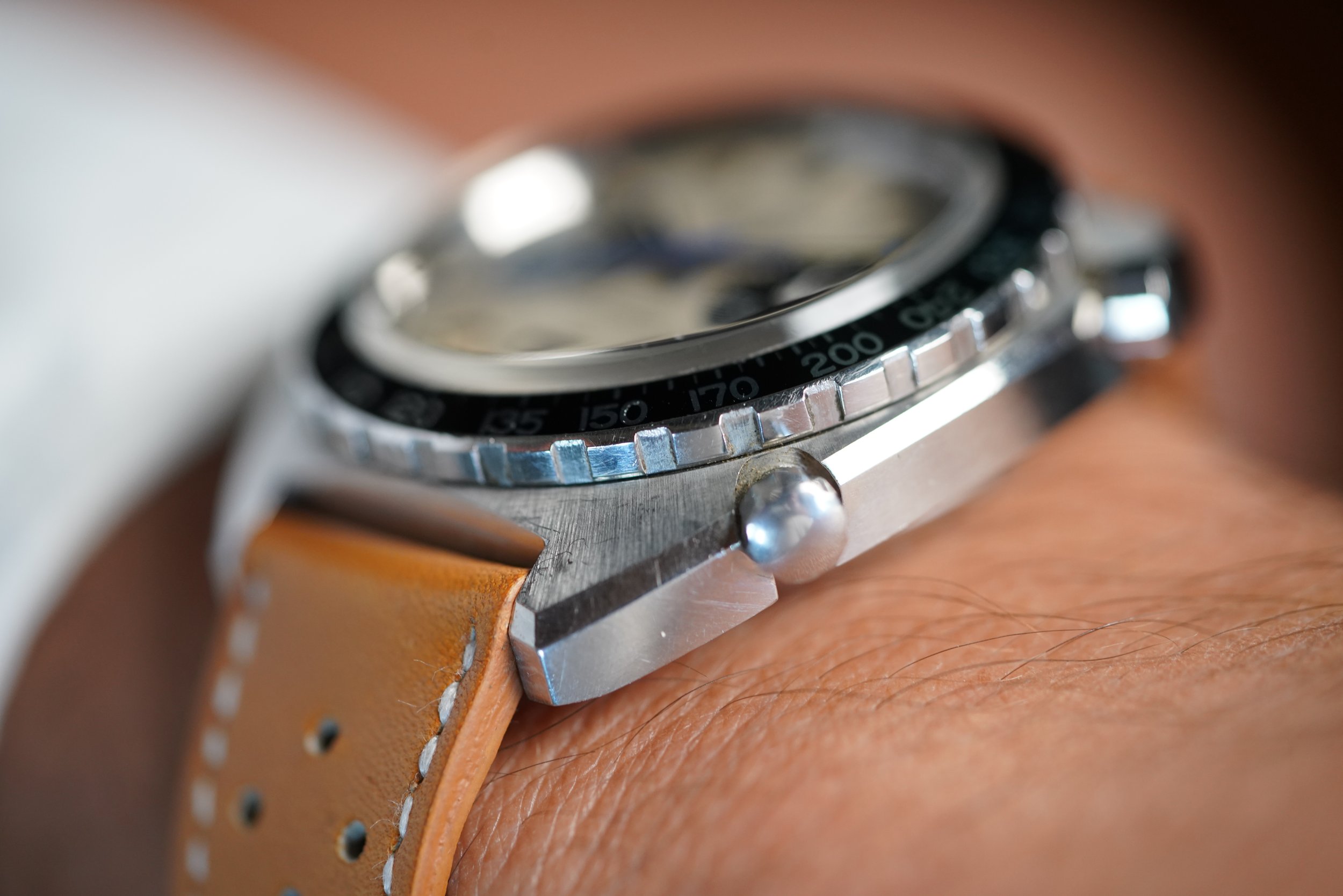 This is an interesting Heuer Autavia reference 1163 V with an early Jo Siffert Mark 2 Flat V Autavia dial with ridged hour markers and later Jo Siffert hands. It is a bit of a Frankenstein as the dial is too early for the case. Nonetheless, it is a very attractive and wearable watch. It features an unpolished Schmitz case and possibly started life as a Viceroy Autavia. It is keeping good time, but it is somewhat firm to advance the time and date, so a service would be recommended.