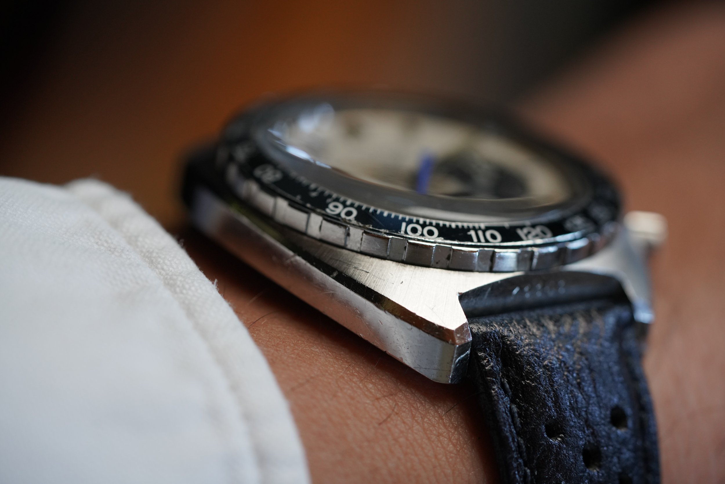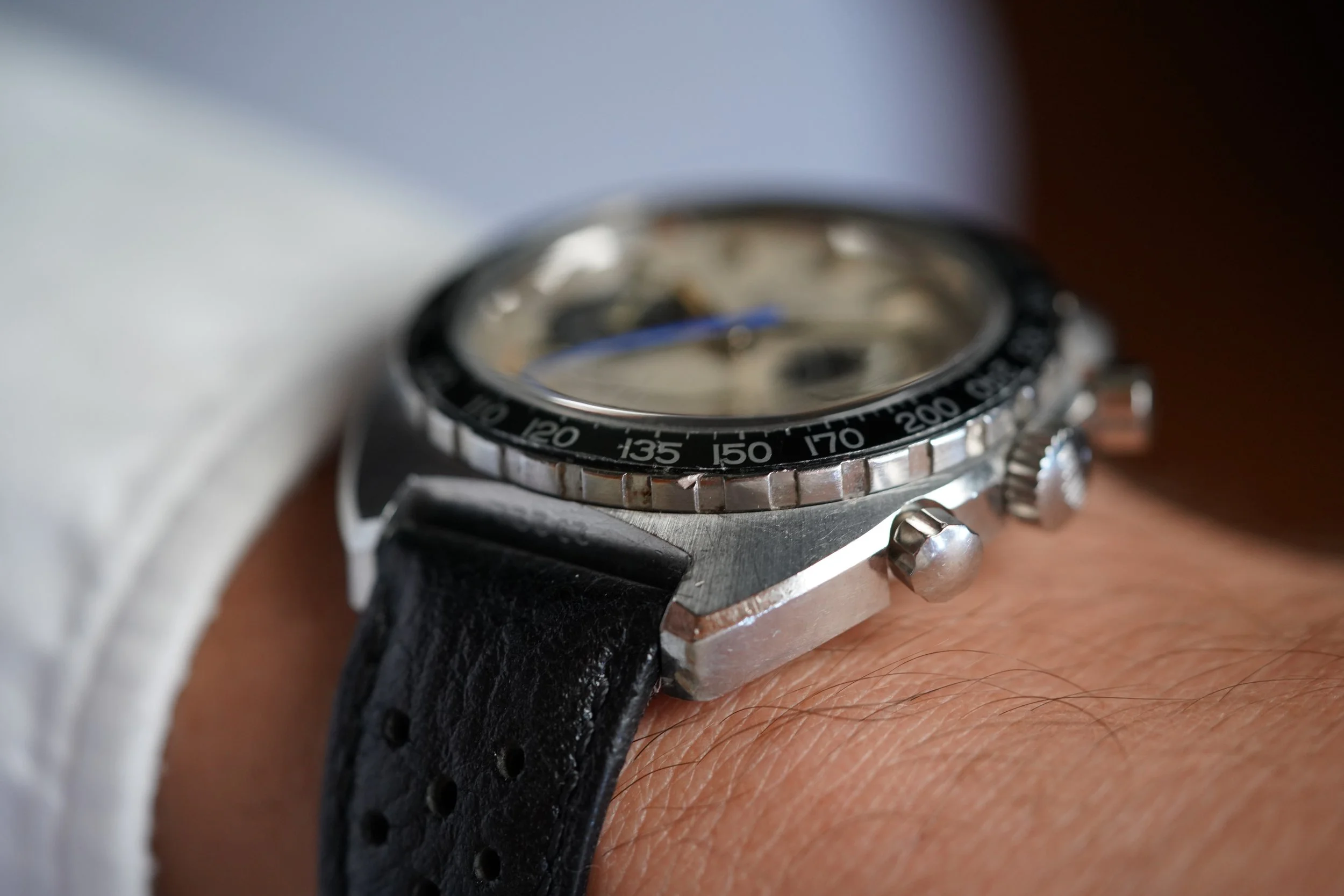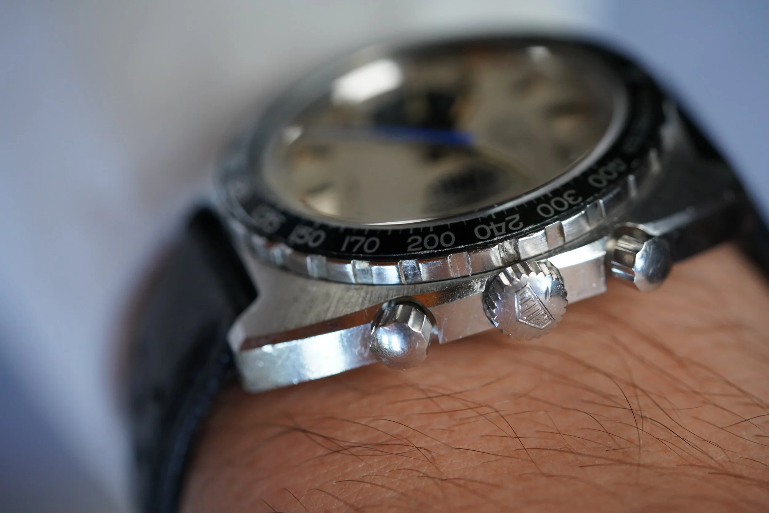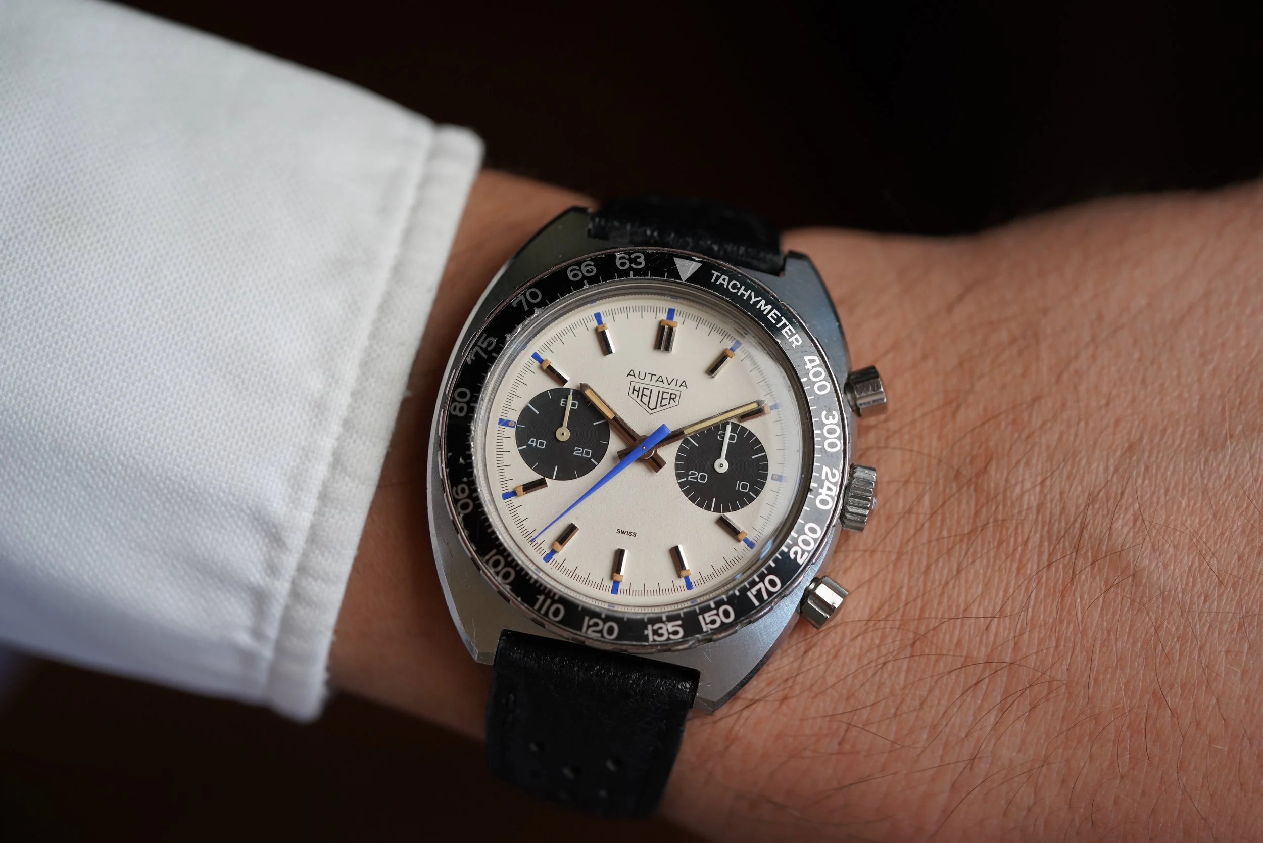 This Heuer “Jo Siffert Colors” Autavia reference 73663 is from a super cool watch that is very similar to the reference 1163 famously worn by the automotive racer. It features a Tachymeter bezel. The minute hand has been relumed. The case appears to be unpolished. It measures 42mm in diameter. It is powered by the Valjoux 7736. It is paired on an annoymous strap and buckle.