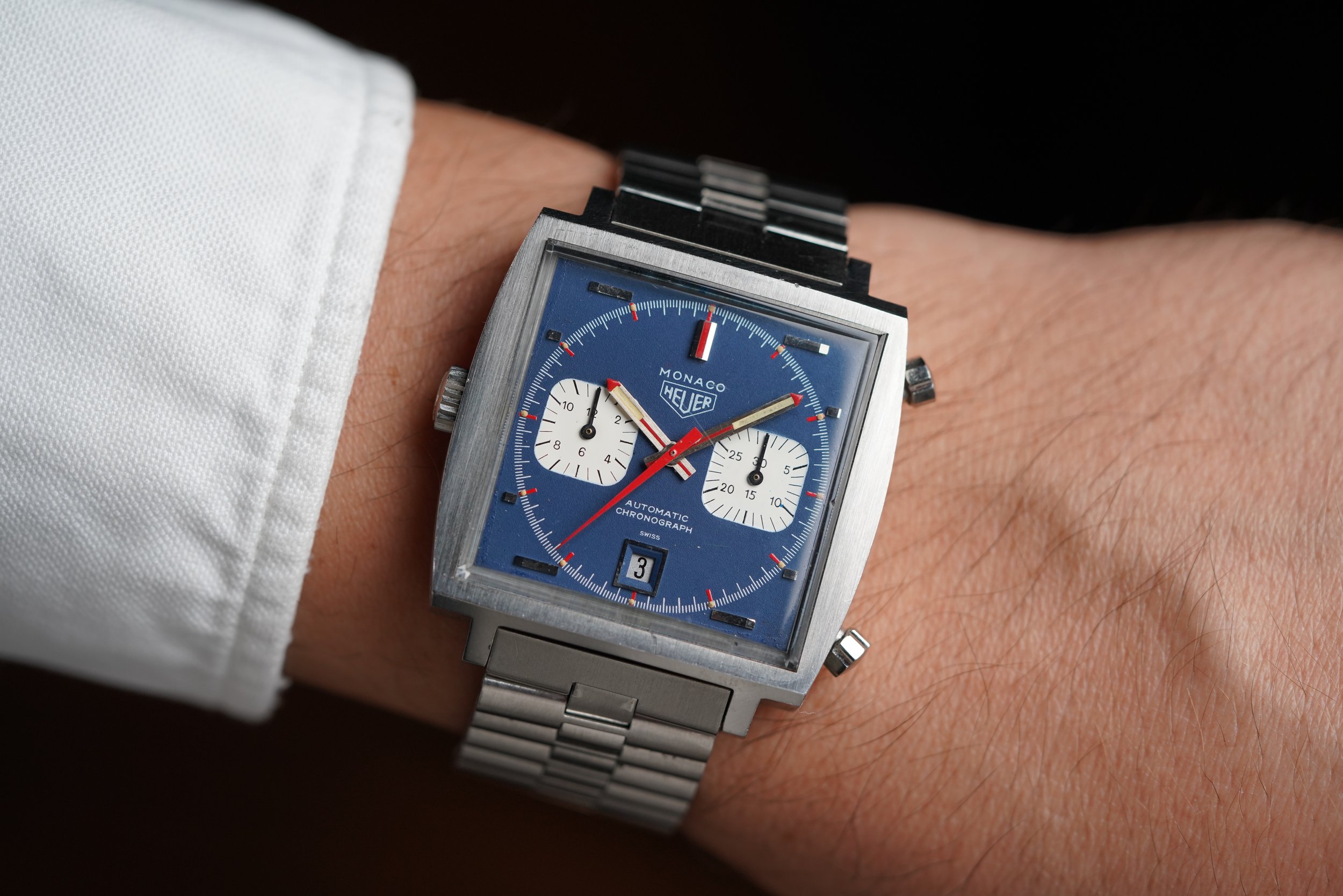The Heuer Monaco was introduced in 1969 with the first automatic Swiss chronograph movement featuring the iconic calibre 11. Coupled by the association of Steve McQueen’s decision to wear the watch in the film ‘Le Mans’, the watch is nothing short of iconic. The design is one of the most attractive and compelling sports chronographs.