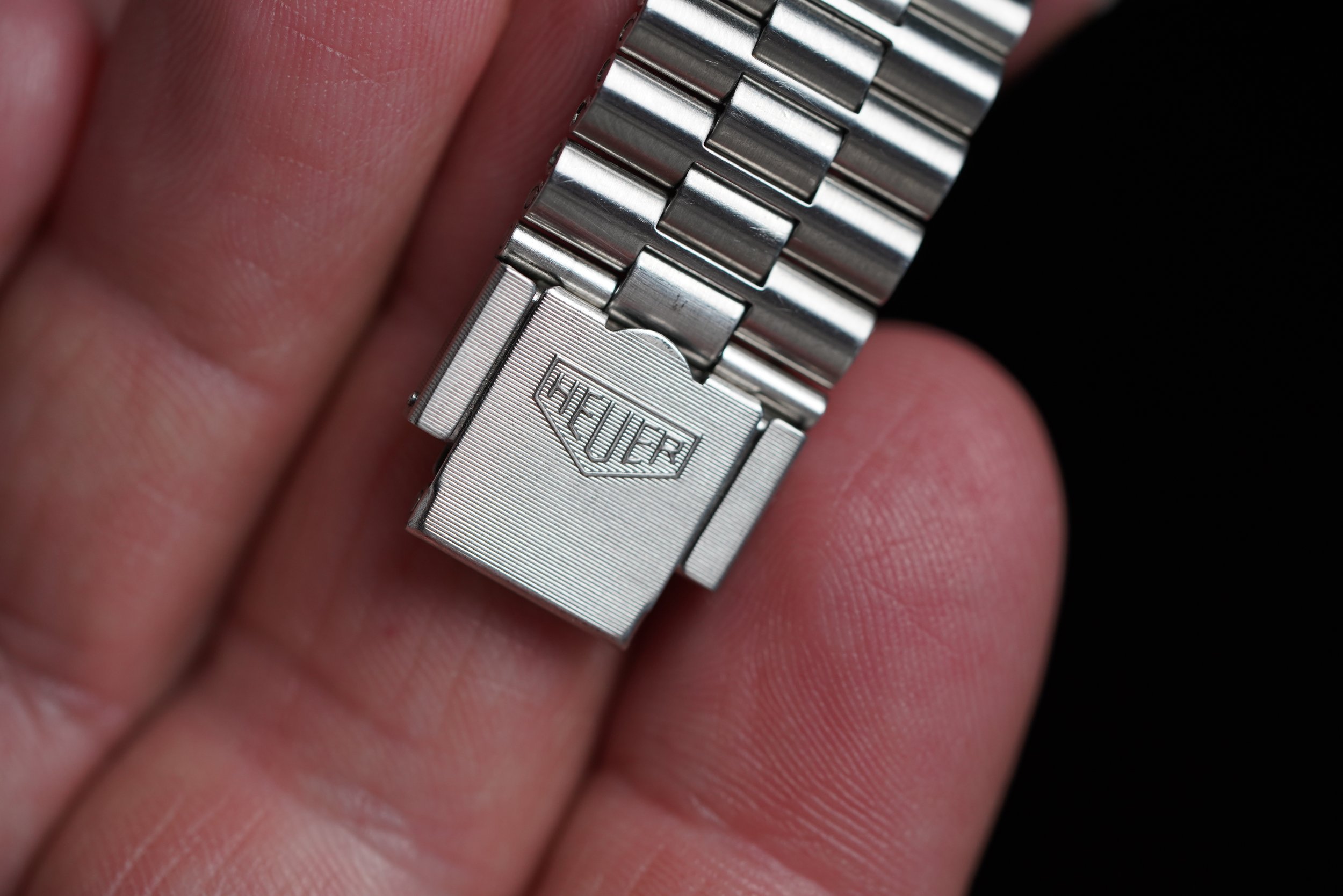 This example is in phenomenal condition. The case appears to be unpolished. The dial is in absolutely remarkable condition, In addition, it is paired on a vintage Heuer bracelet made by NSA.