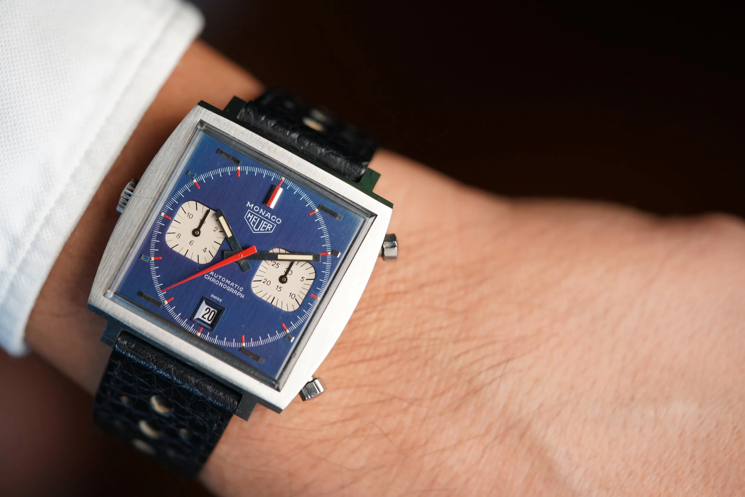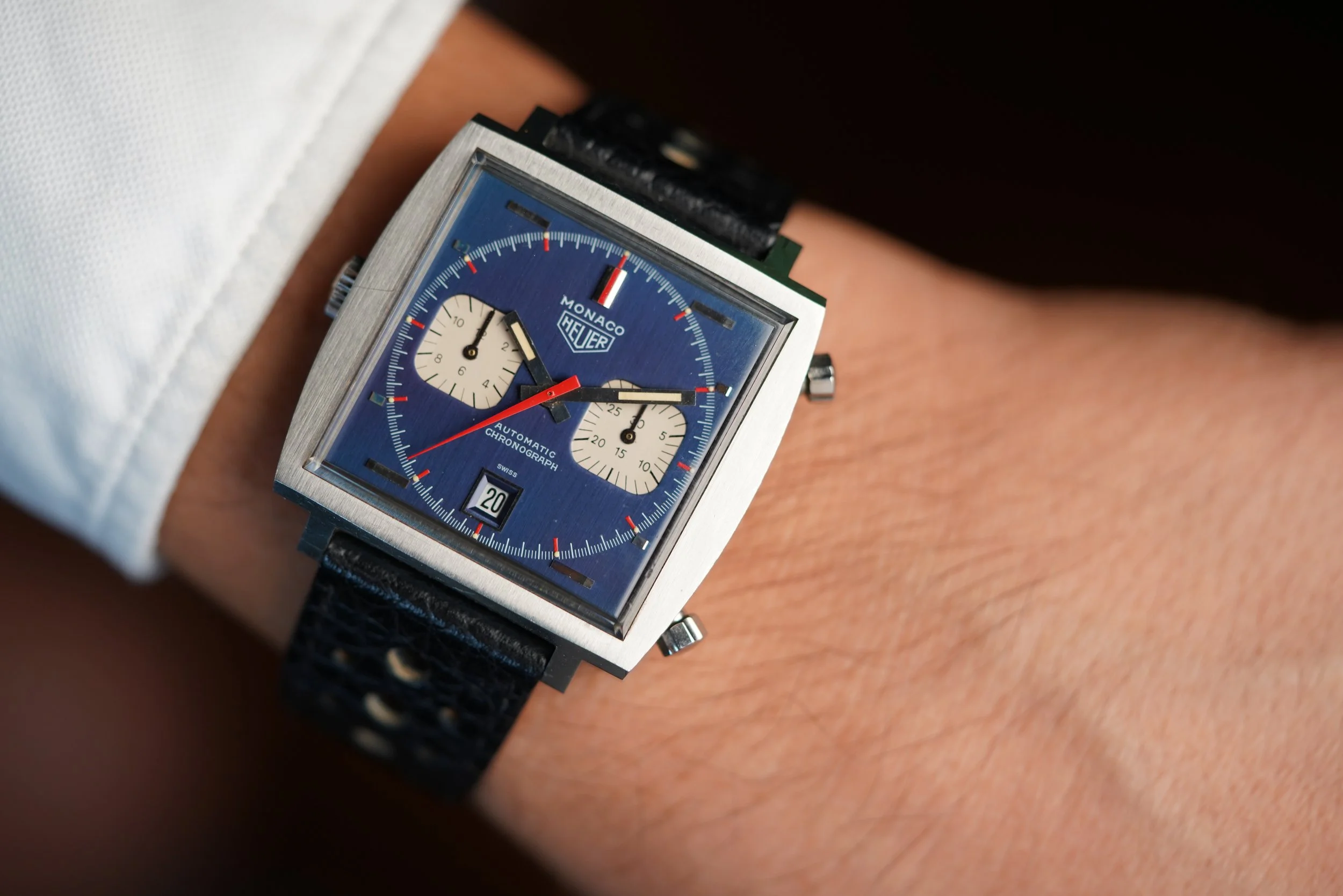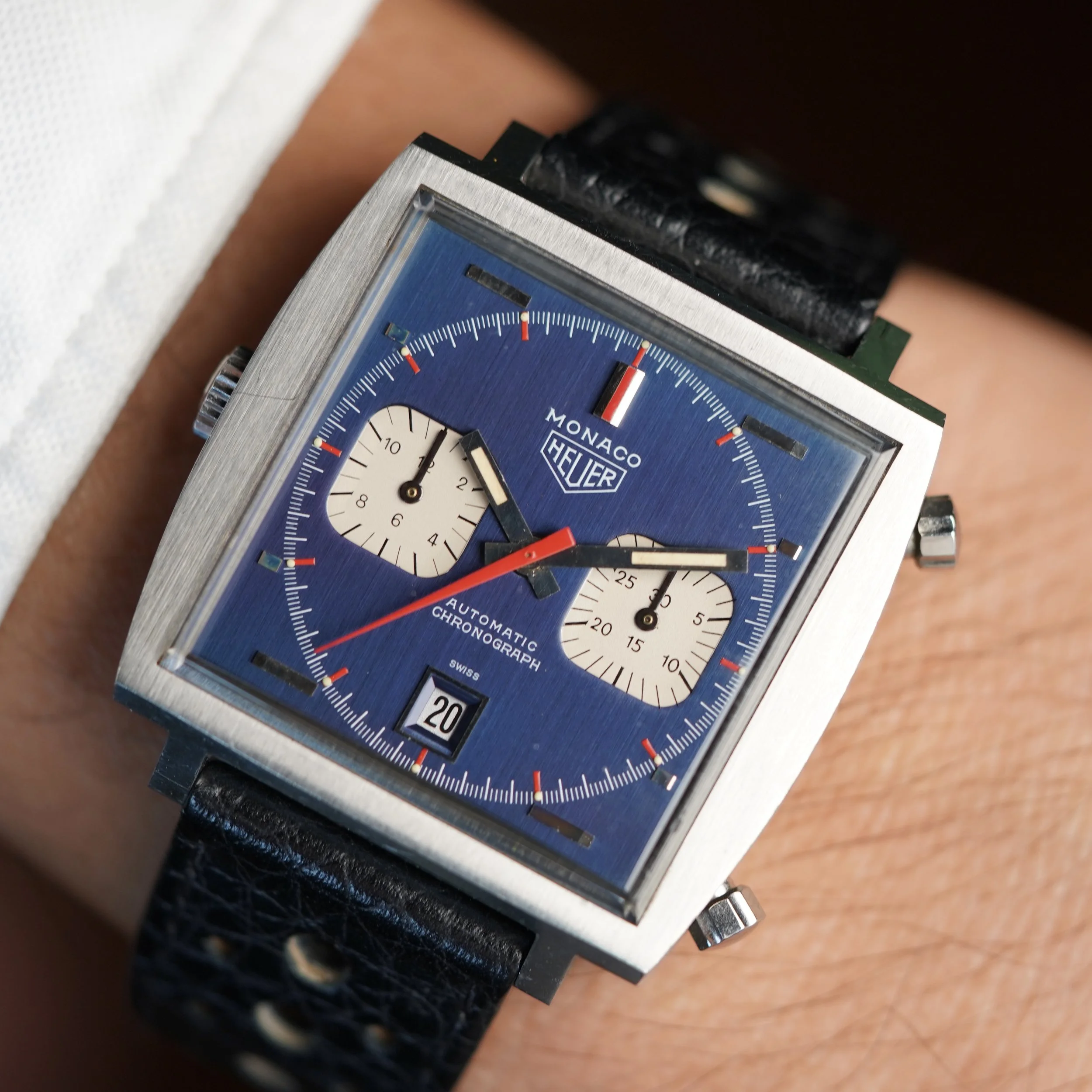 The Heuer Monaco was introduced in 1969 with the first automatic chronograph movement, the calibre 11. Coupled by the association of Steve McQueen’s decision to wear the watch in the film ‘Le Mans’, the watch is nothing short of iconic. This example is in great condition. It features a stunning blue dial. The watch comes with an additional stainless steel Heuer Bracelet. It is paired with a black rally strap and a stainless steel Heuer Buckle. The case appears to be unpolished.