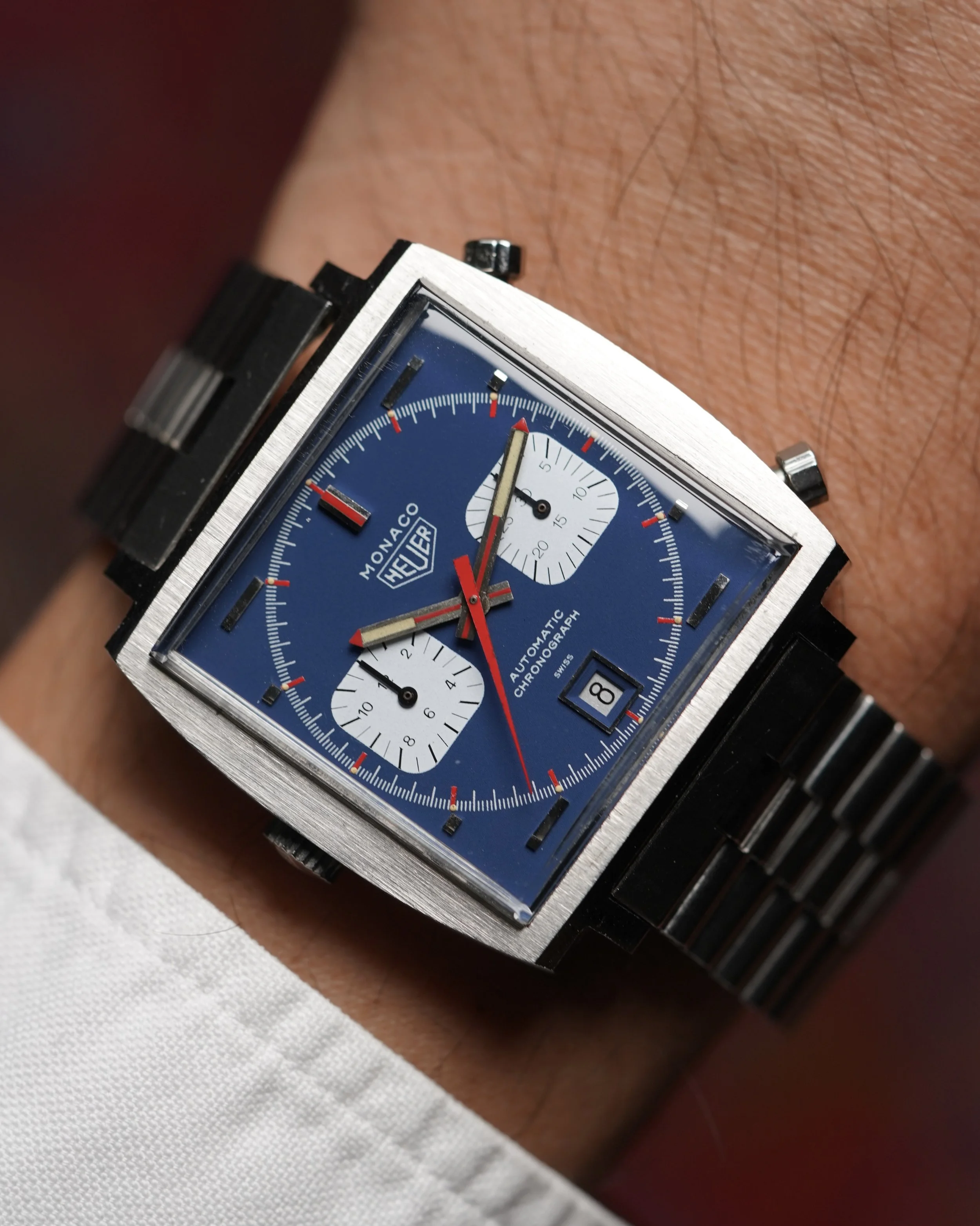 The Heuer Monaco was introduced in 1969 with the first automatic chronograph movement, the calibre 11. Coupled by the association of Steve McQueen’s decision to wear the watch in the film ‘Le Mans’, the watch is nothing short of iconic. This example is in phenomenal condition. We believe the case is unpolished. The dial is super attractive. In addition, it is paired on the MK II Heuer bracelet made by NSA. It dates to circa 1970.