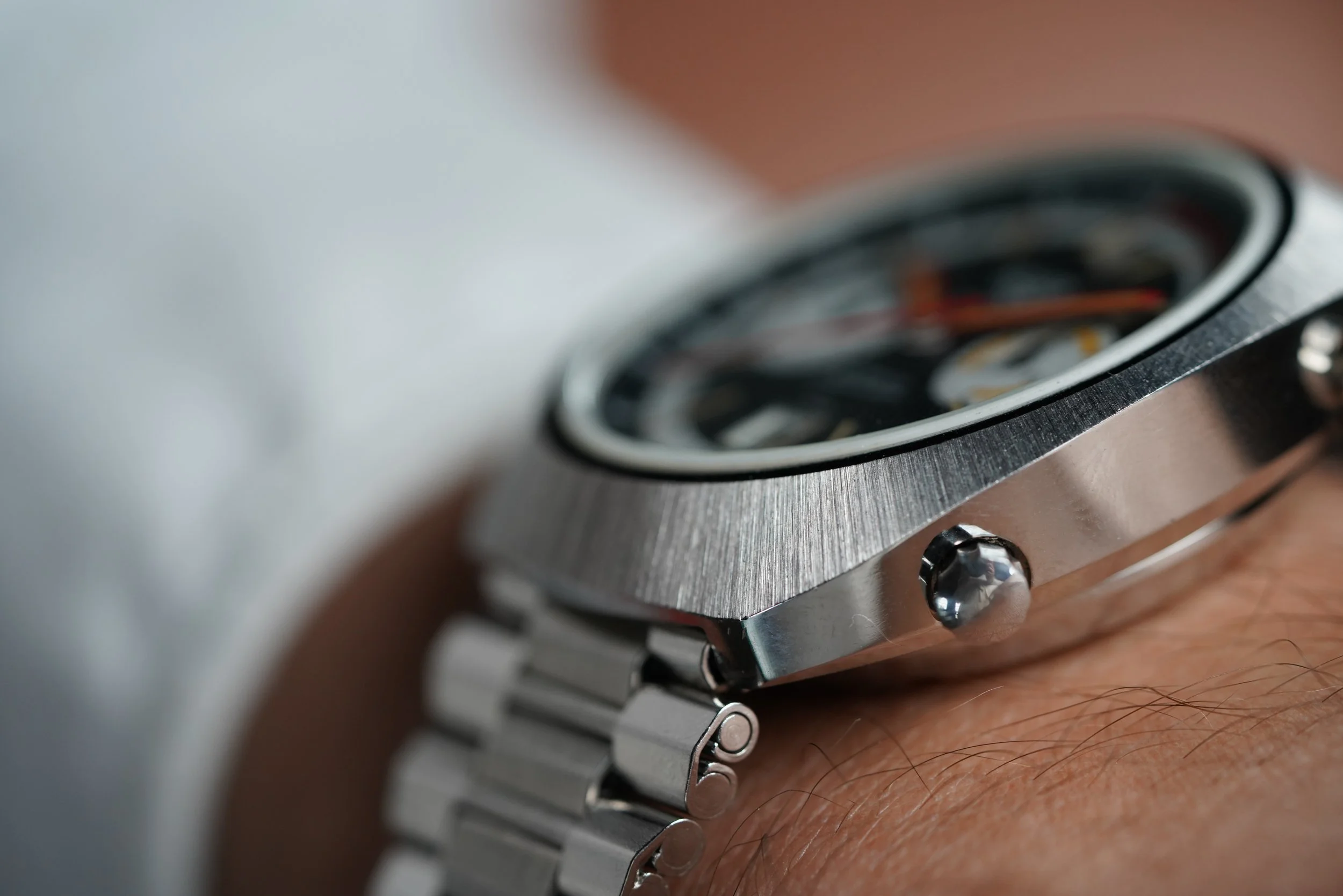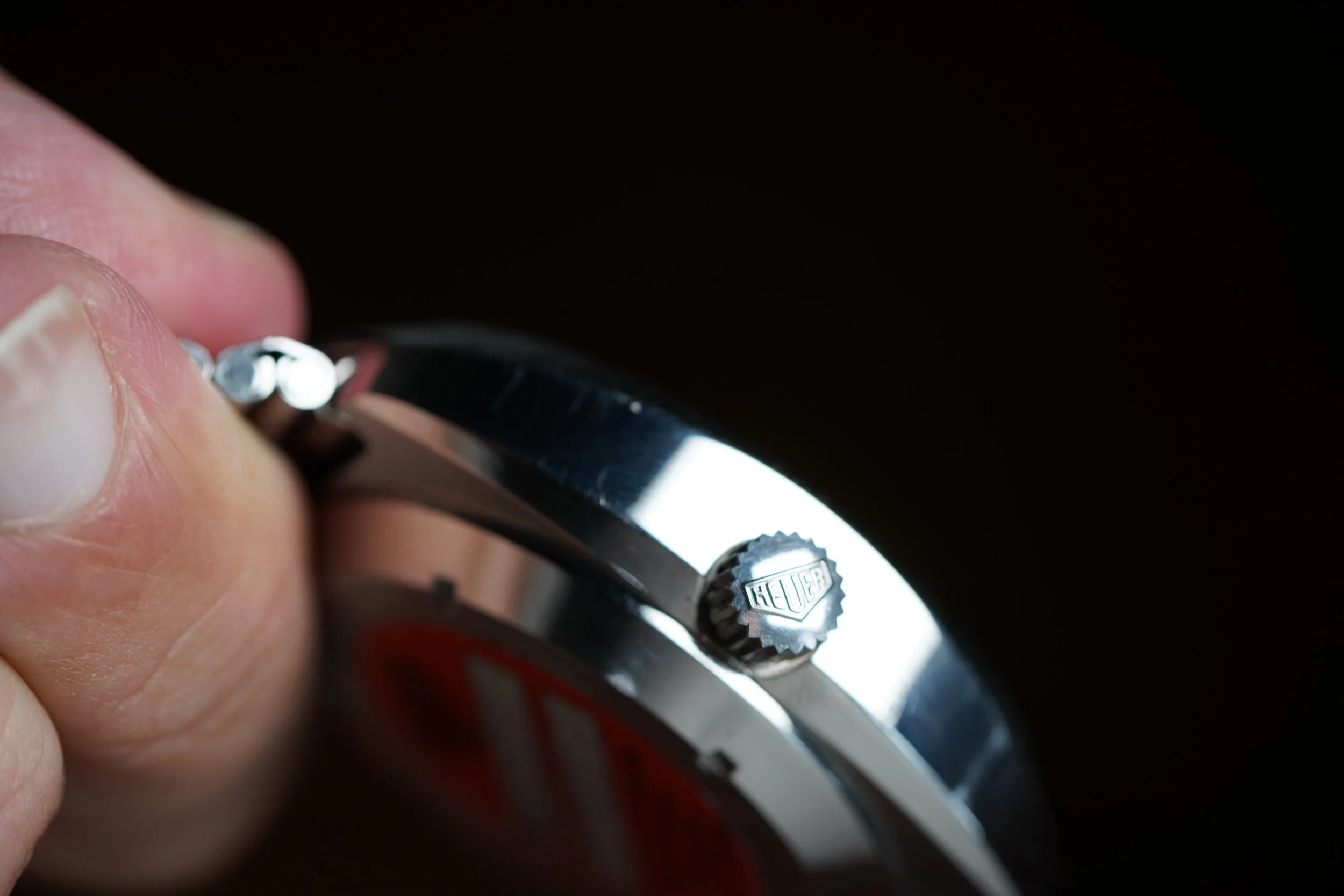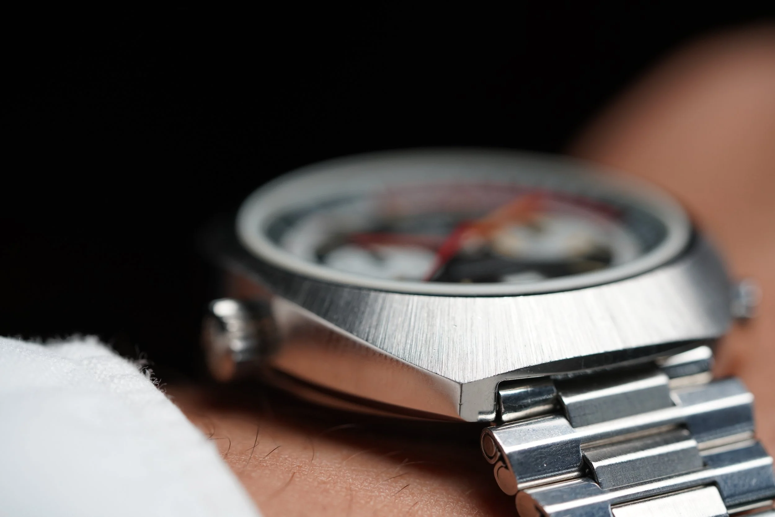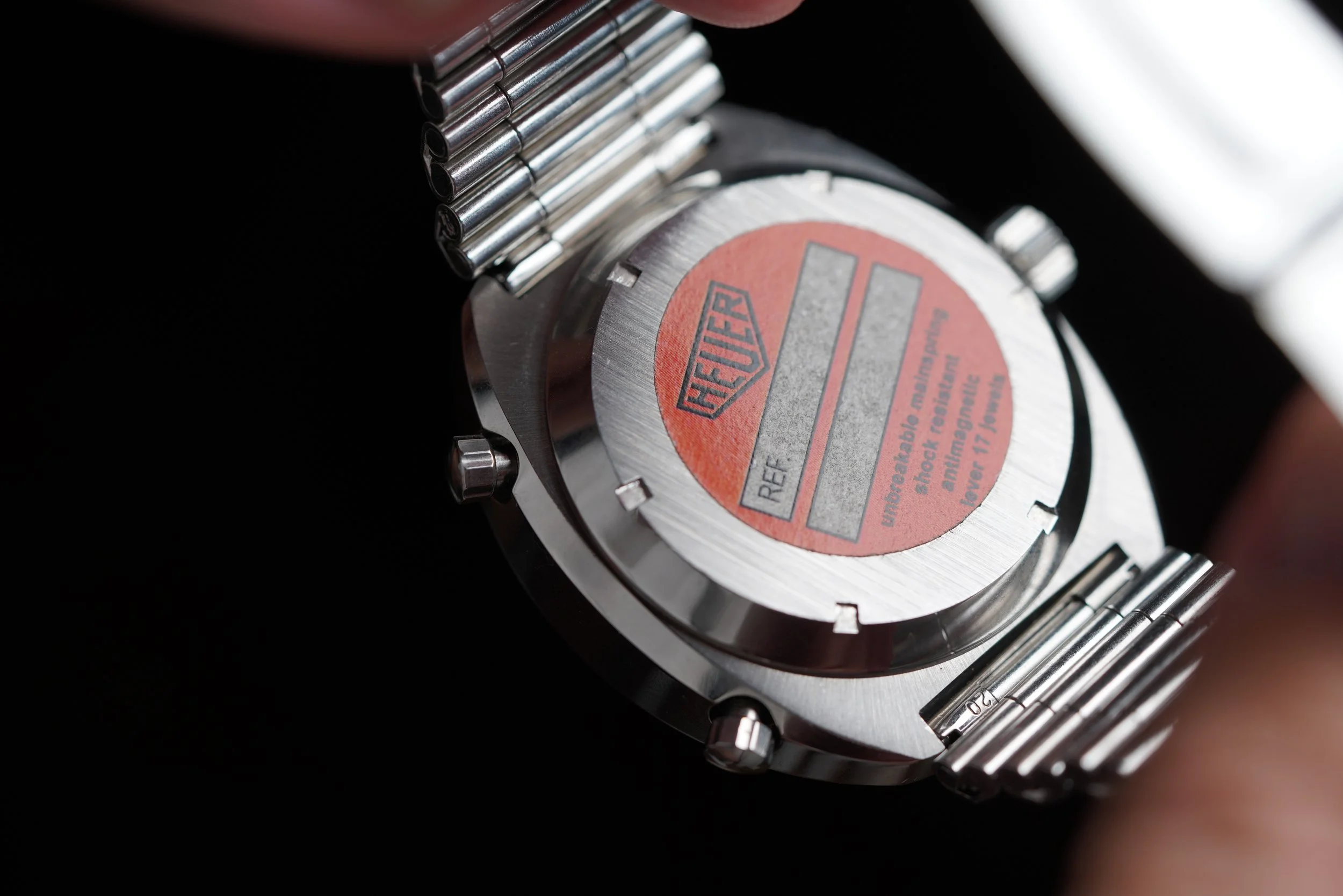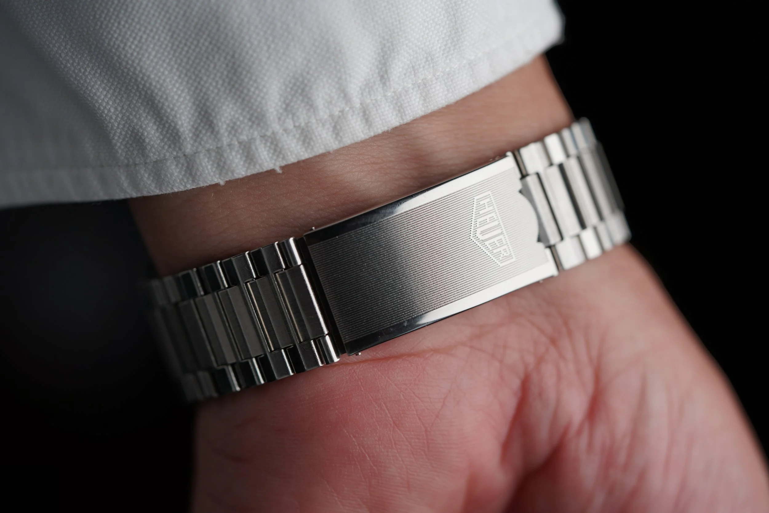 The Heuer Montreal was originally released in 1972. The reference 110.503 is powered by the Heuer Calibre 12. This example features a black dial with contrasting white track and subdials. It features red luminous hands and a date window at 6 o’clock. The Heuer signed NSA bracelet is unpolished. The case has been polished.