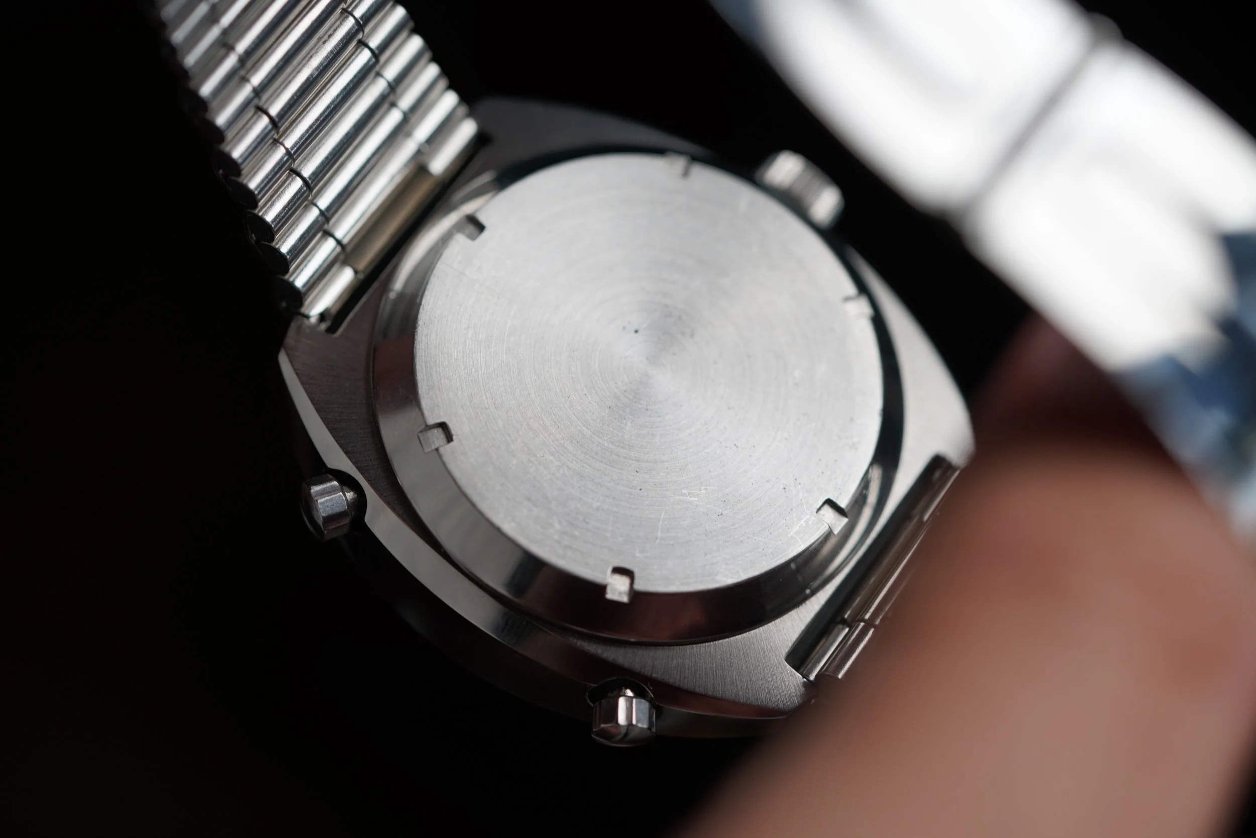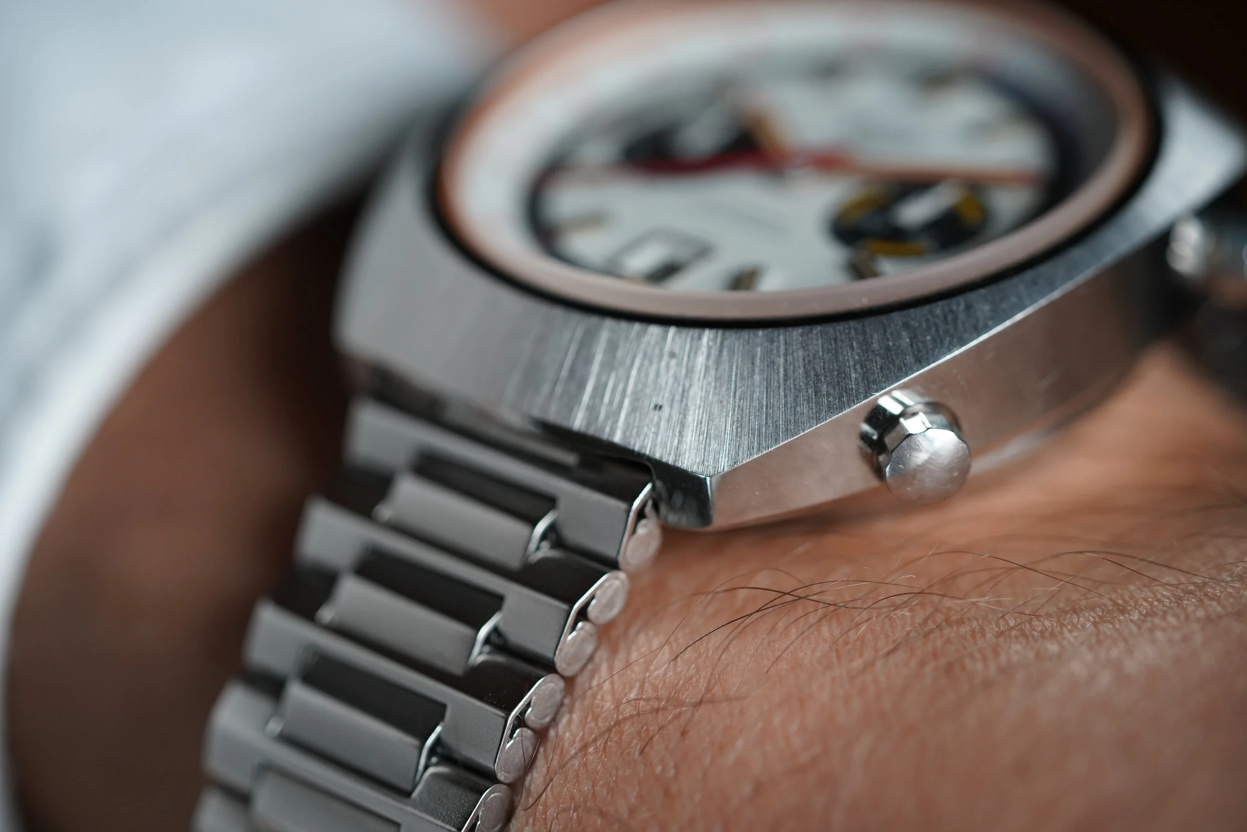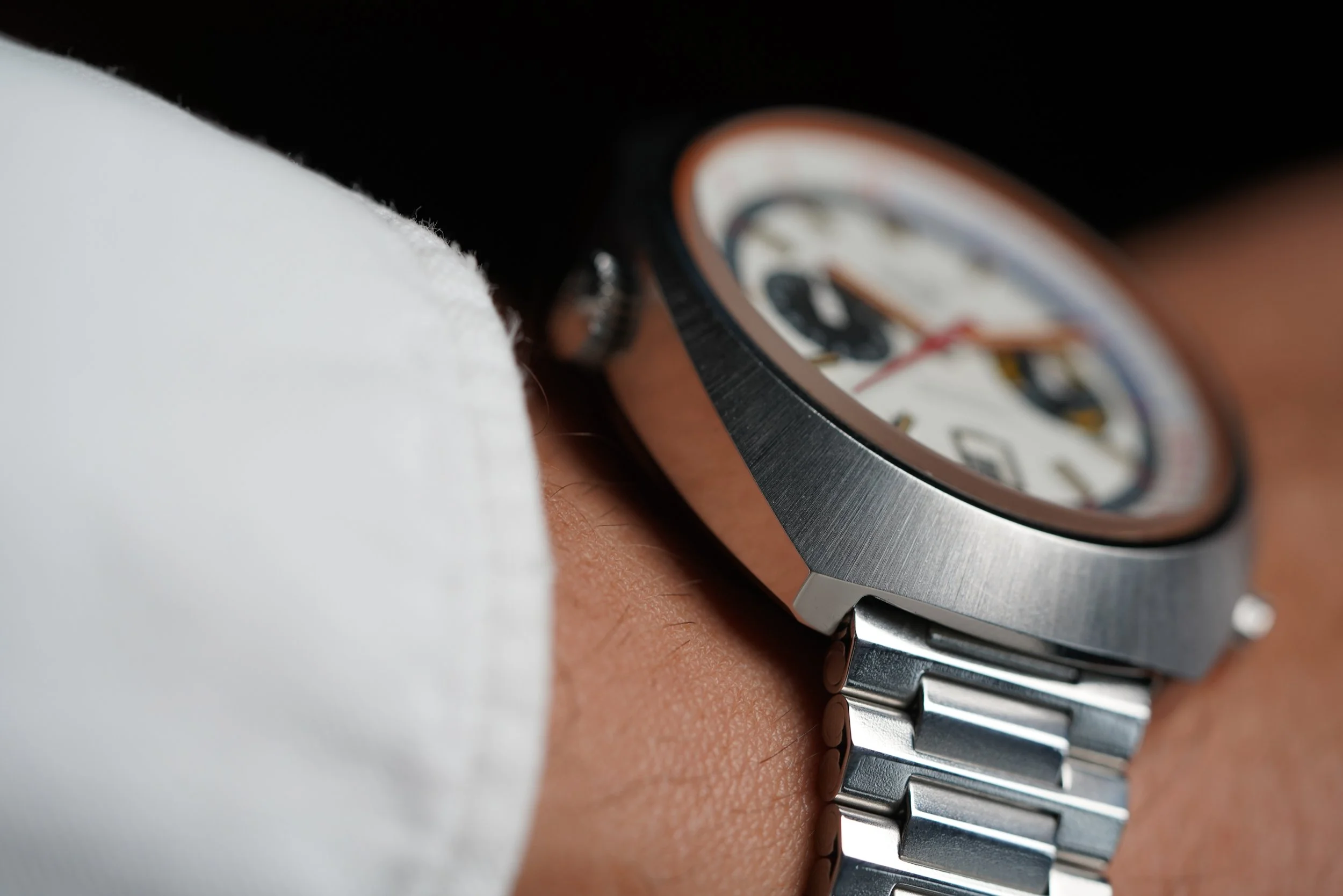 The Heuer Montreal was originally released in 1972. The reference 110.503 is powered by the Heuer Calibre 12. This example features a white dial with contrasting white track and subdials. It features red luminous hands and a date window at 6 o’clock. The Heuer signed NSA bracelet is unpolished. The case appears to be unpolished.