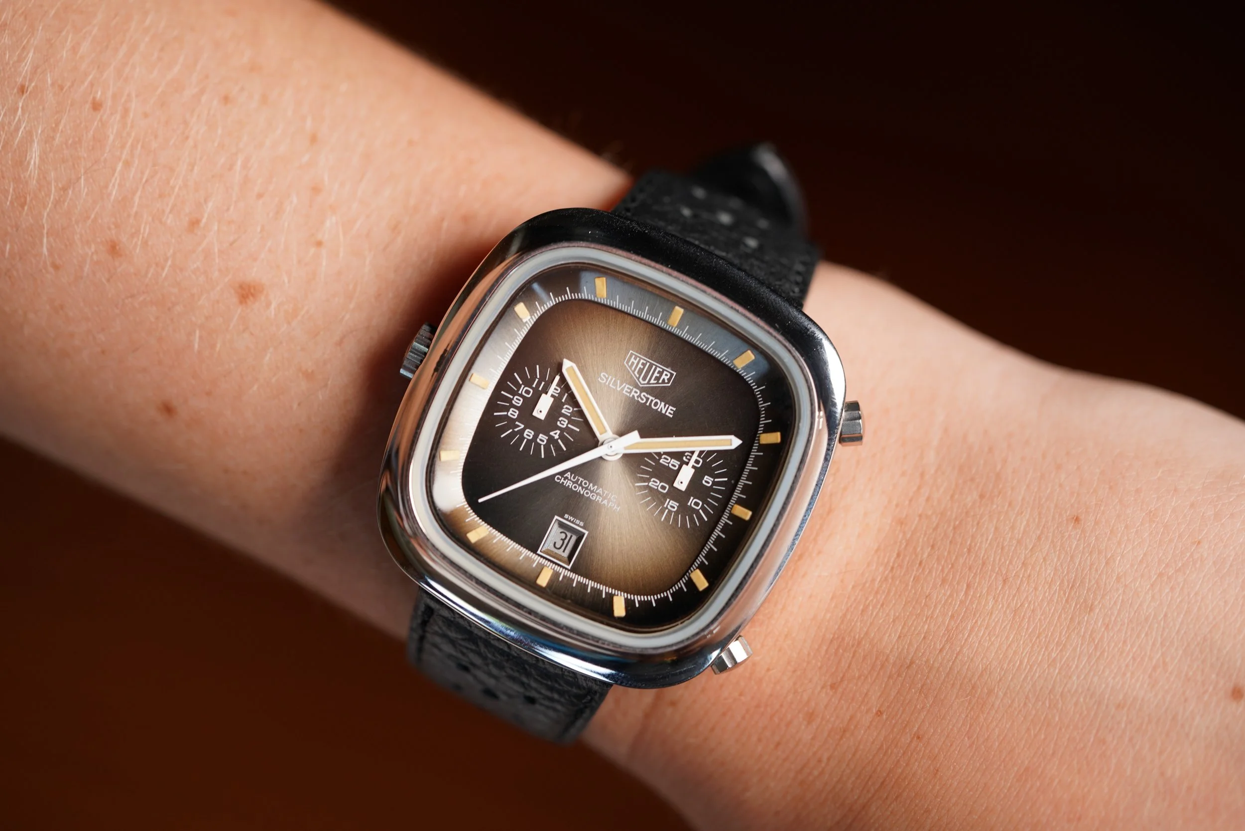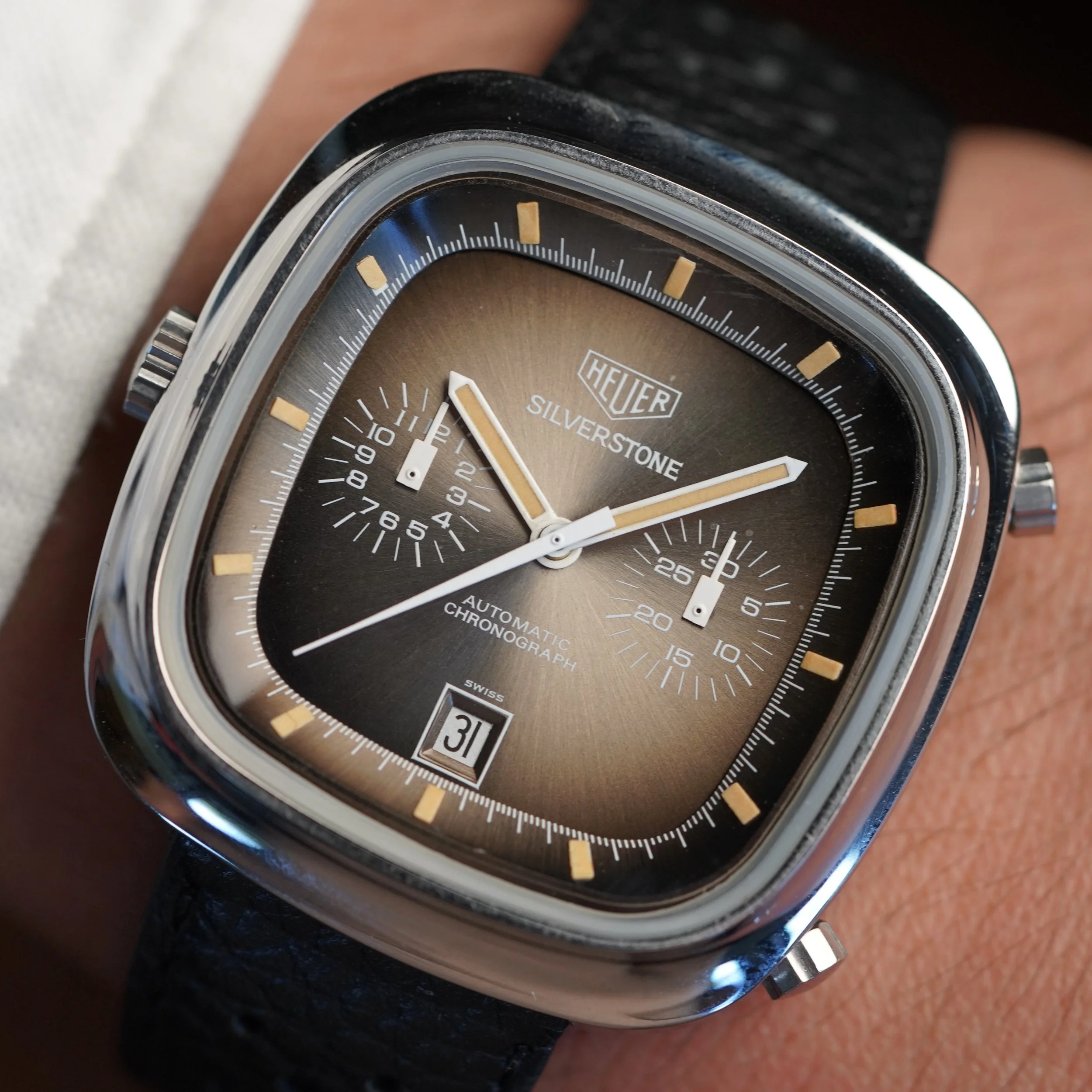 The Heuer Silverstone is one of the coolest and funkiest chronographs of the era. It features the calibre 12 movement. This reference 110.313F is in outstanding condition. The case appears to be unpolished. It has super attractive lume.