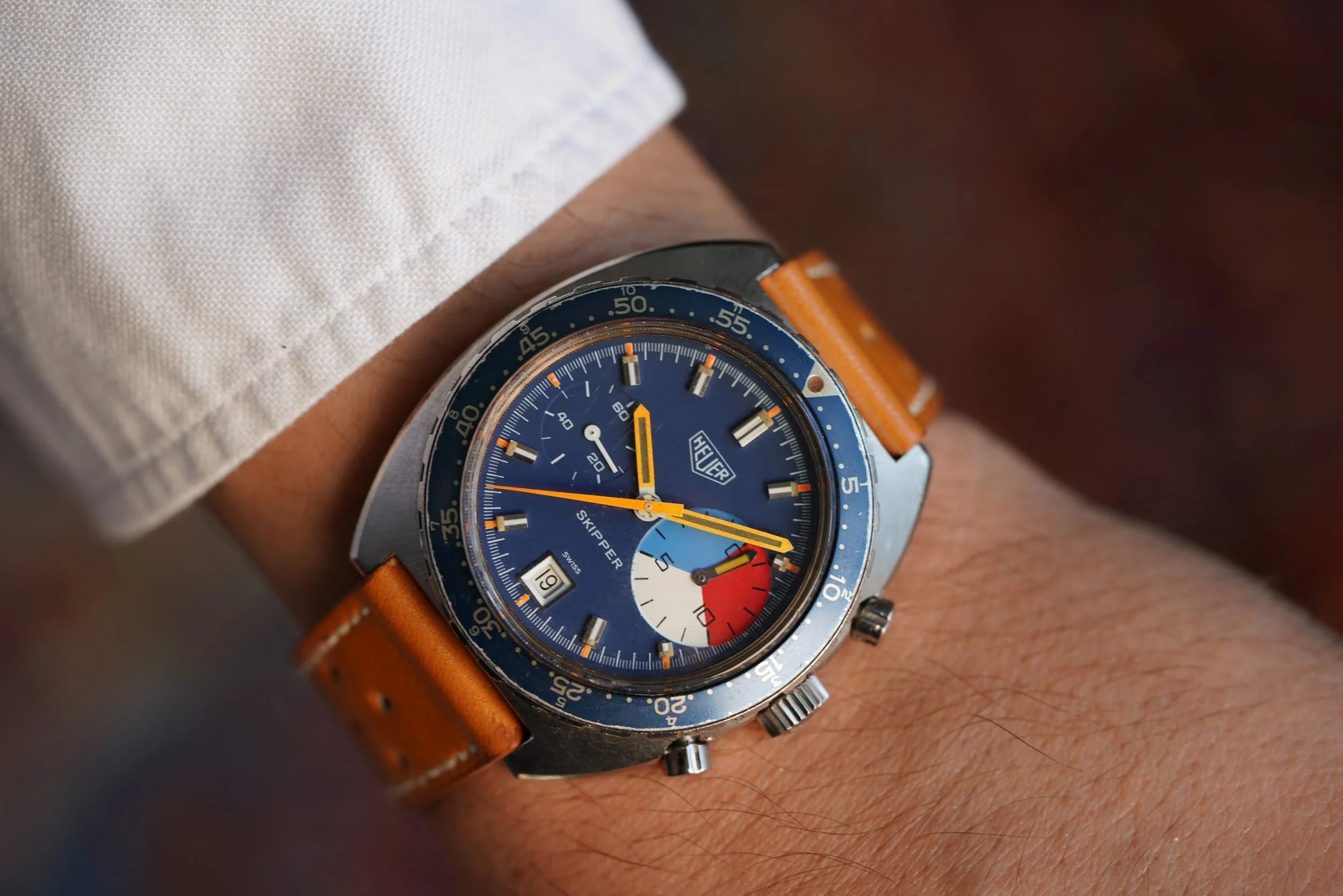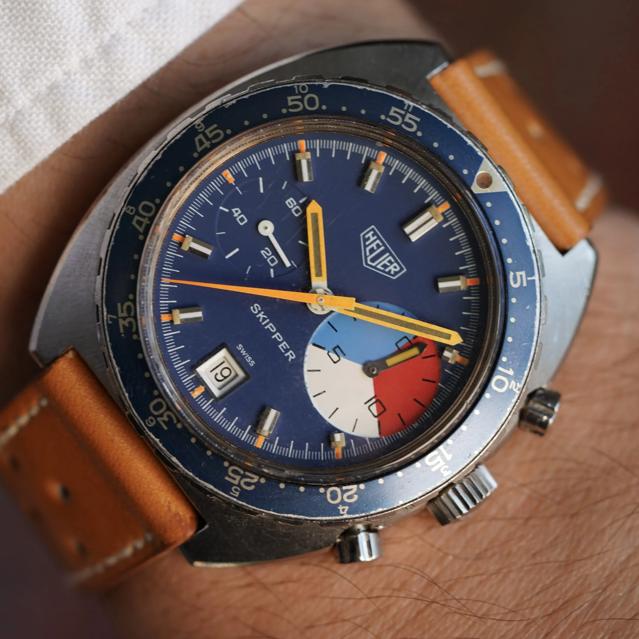 Heuer Autavias are some of the best buys in vintage watches. Particularly exciting are models such as this “Skipper” reference 73463 example with a vibrant dial design. The case is lightly polished, but very strong overall. The model is very bold on the wrist and has great proportions. For those looking for a stylish wristwatch that can also fly under the radar, I certainly recommend models such as these.