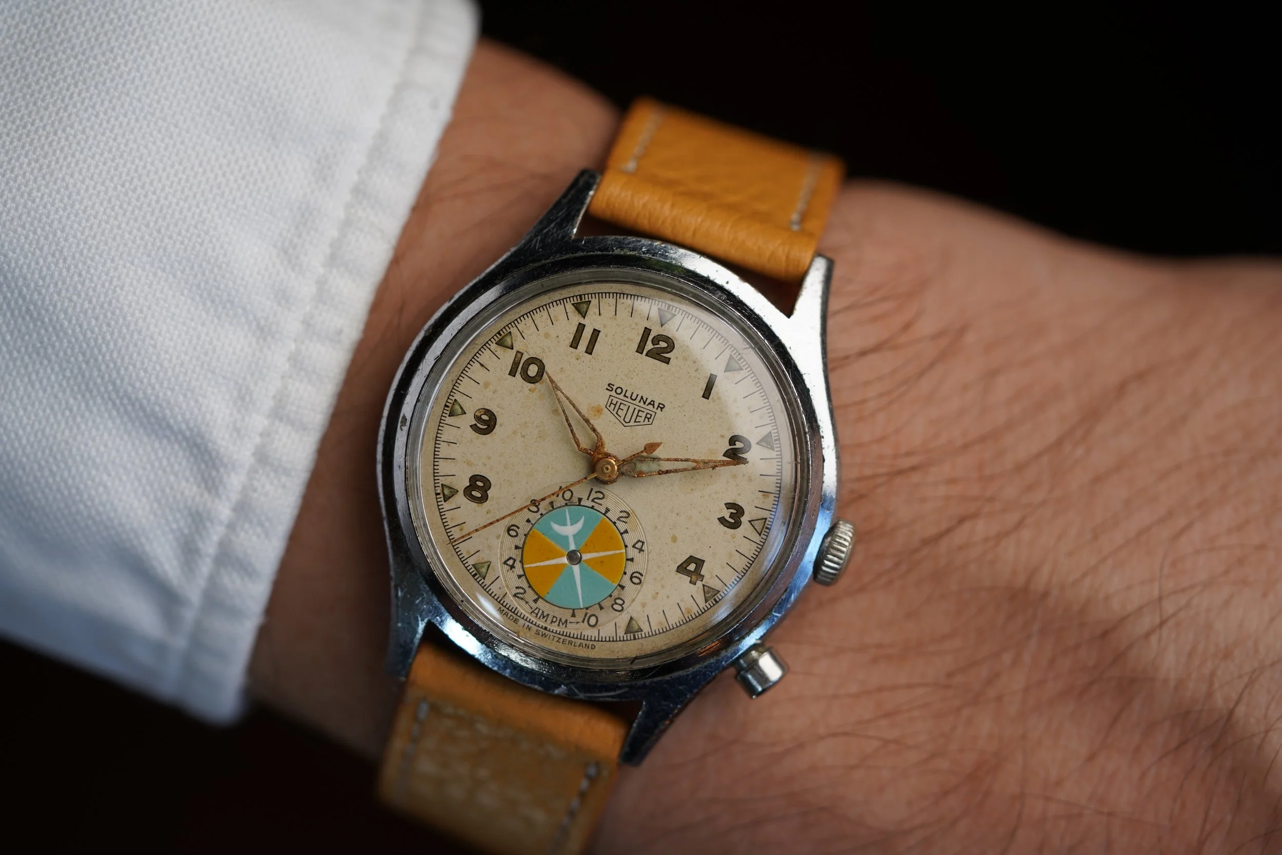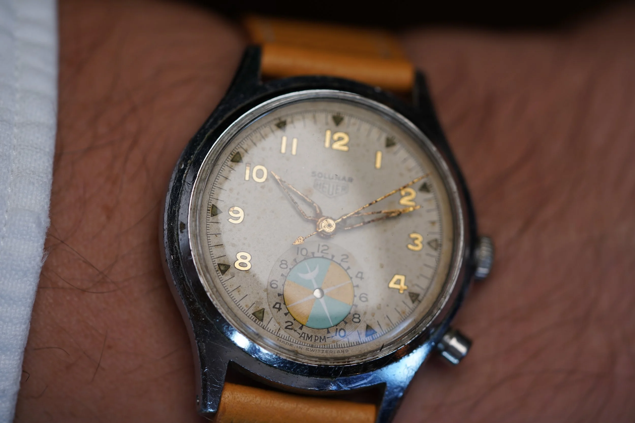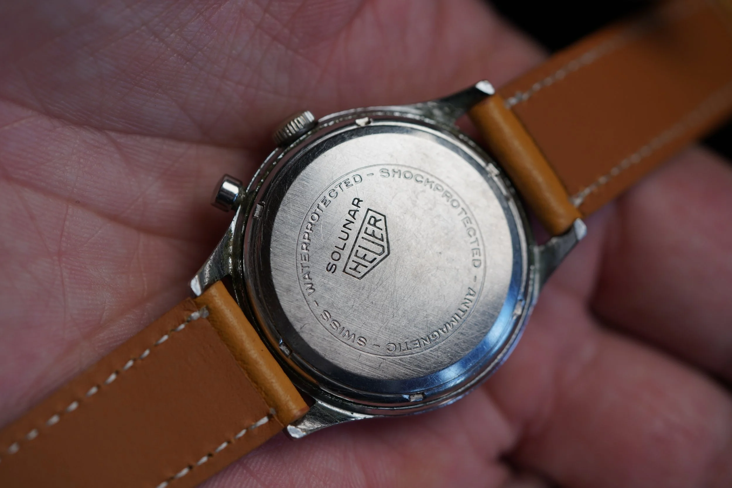 This Heuer Solunar is a super cool watch. The minute register is designated for tide changes. The chrome plated case is unpolished and measures roughly 36mm in diameter. The watch dates to the early 1950s.z the hands have lume loss.
