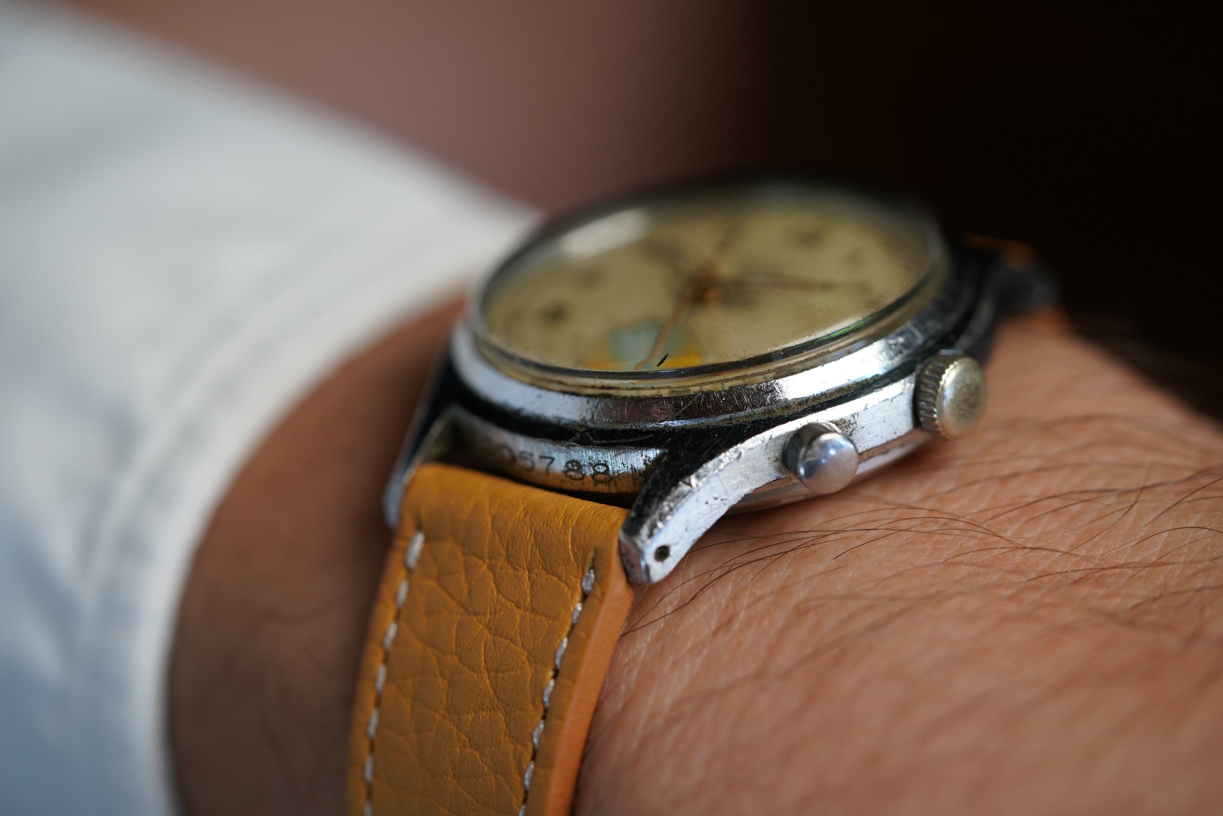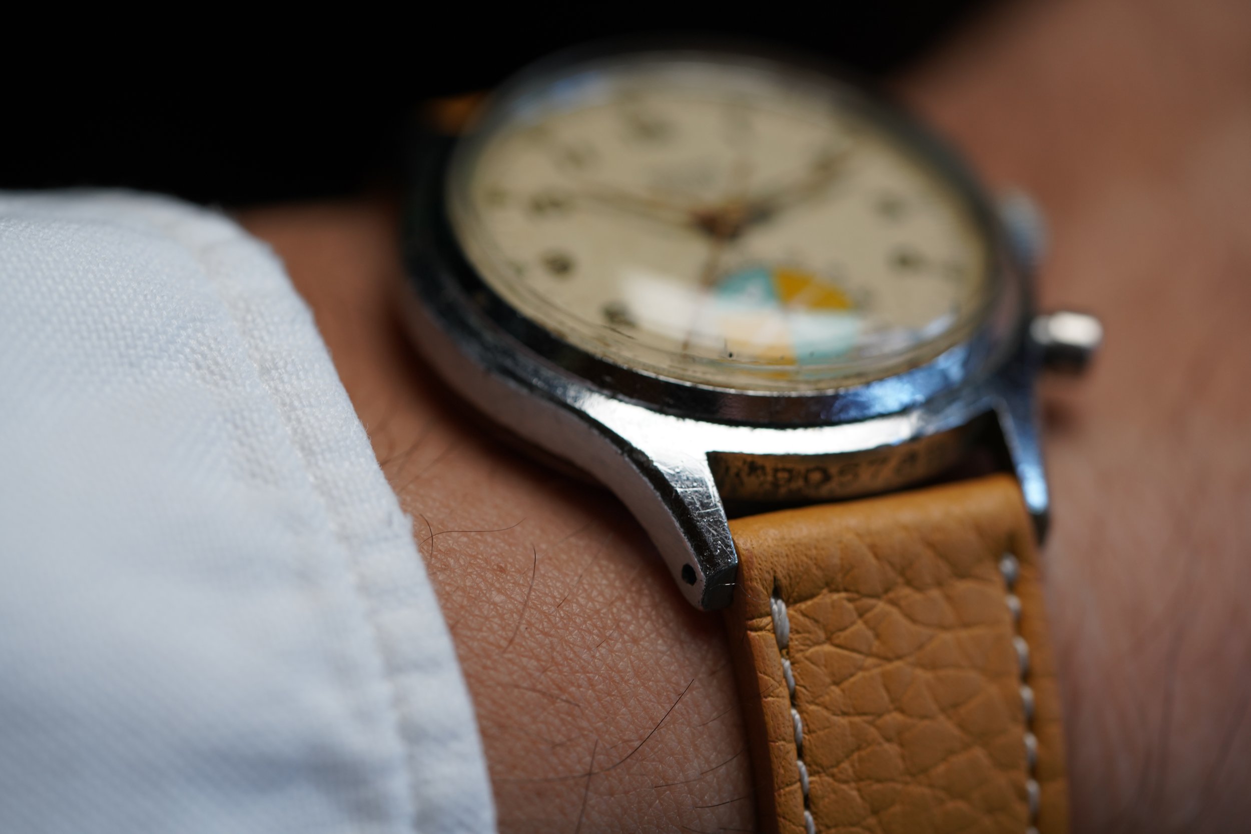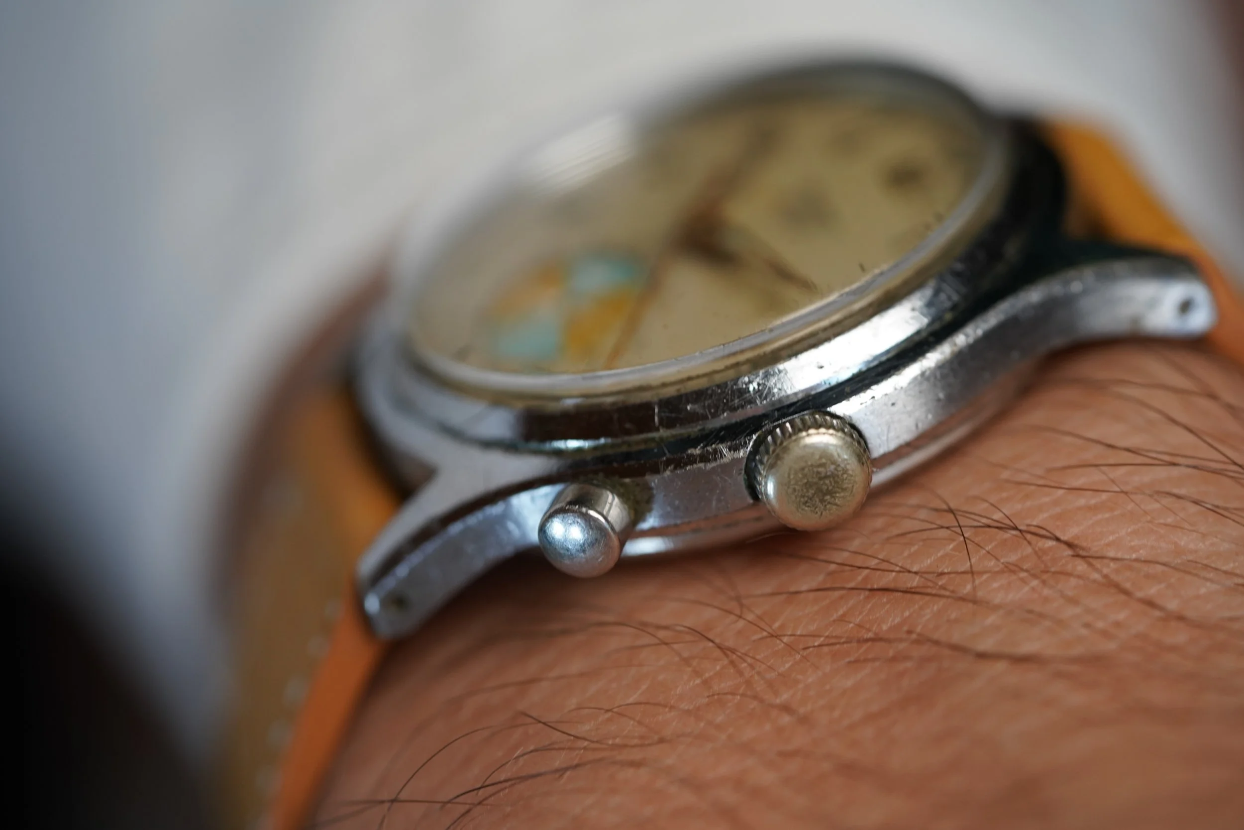 This Heuer Solunar is a super cool watch. The minute register is designated for tide changes. The chrome plated case is unpolished and measures roughly 36mm in diameter. The watch dates to the early 1950s.z the hands have lume loss.