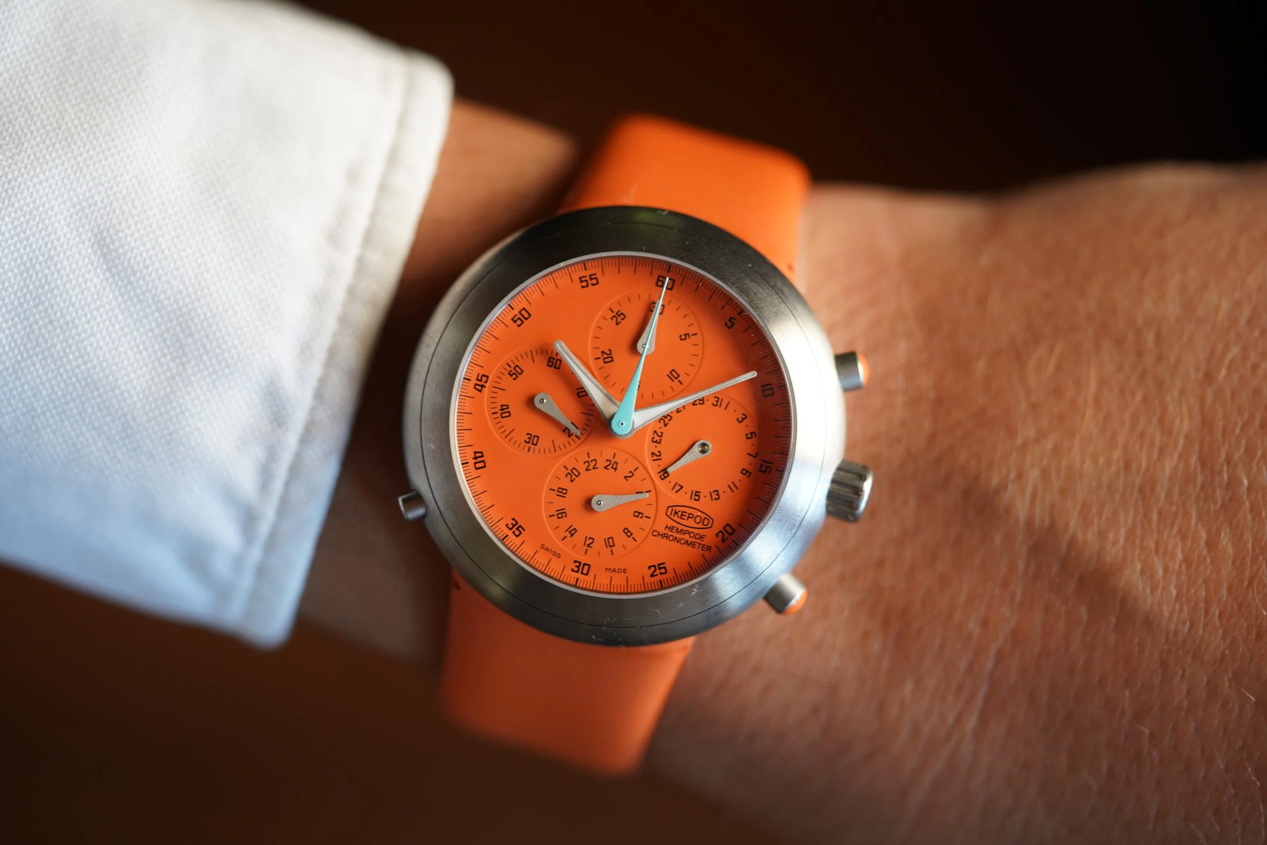 This Ikepod Hemipode GMT is an exceptional and rare model, featuring a vibrant orange dial and strap. It is in fantastic condition and unpolished. The movement is a calibre 2892 (based on an ETA 7750). It measures 43mm in diameter.