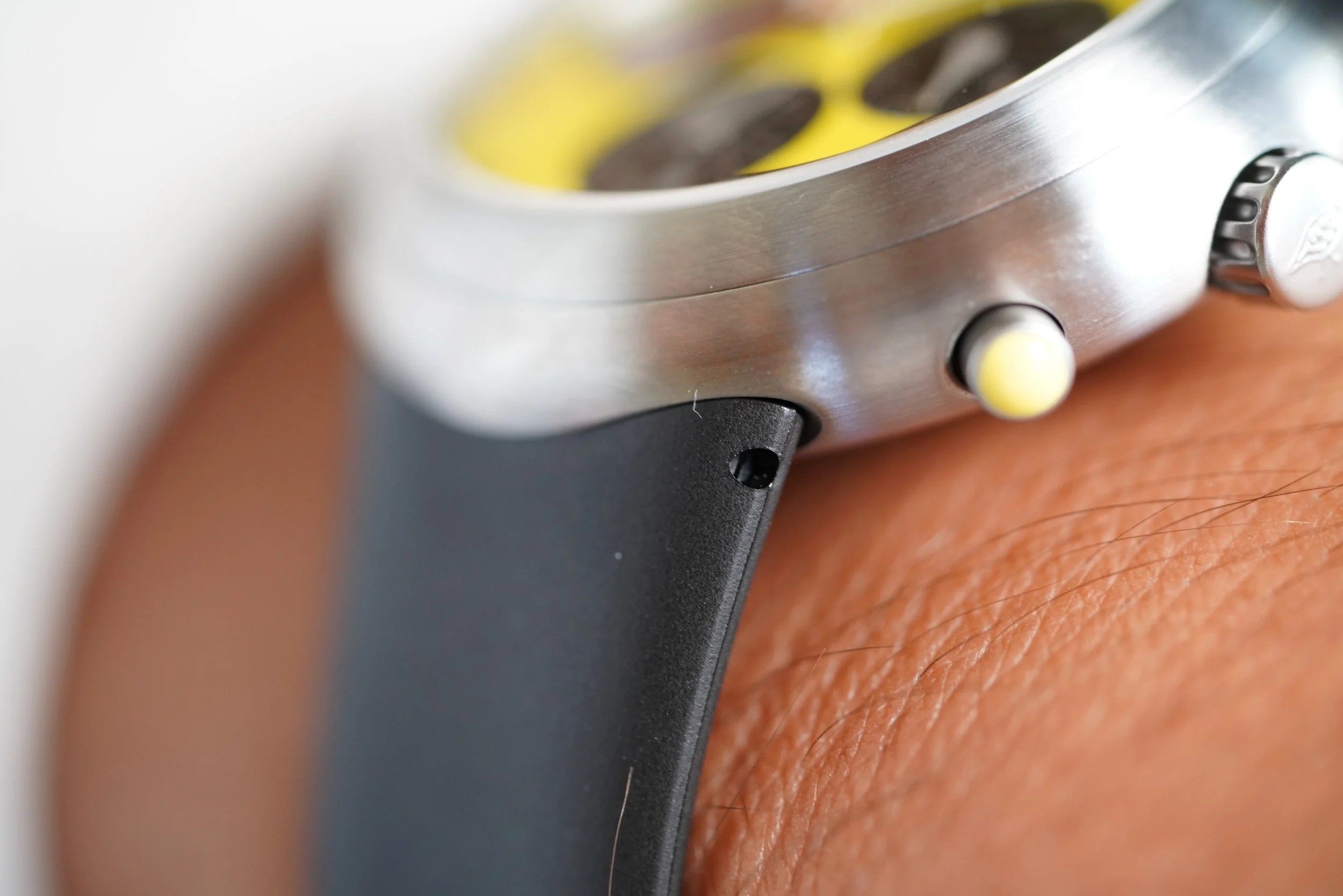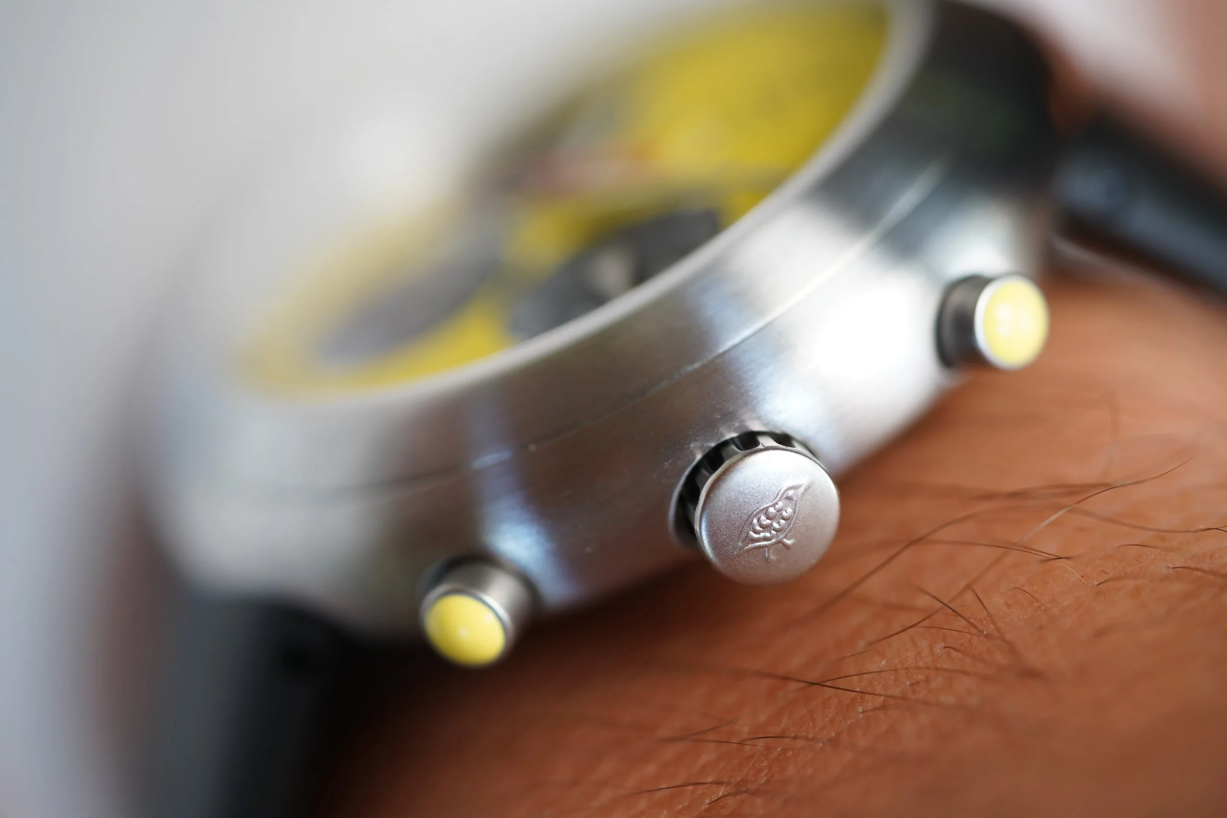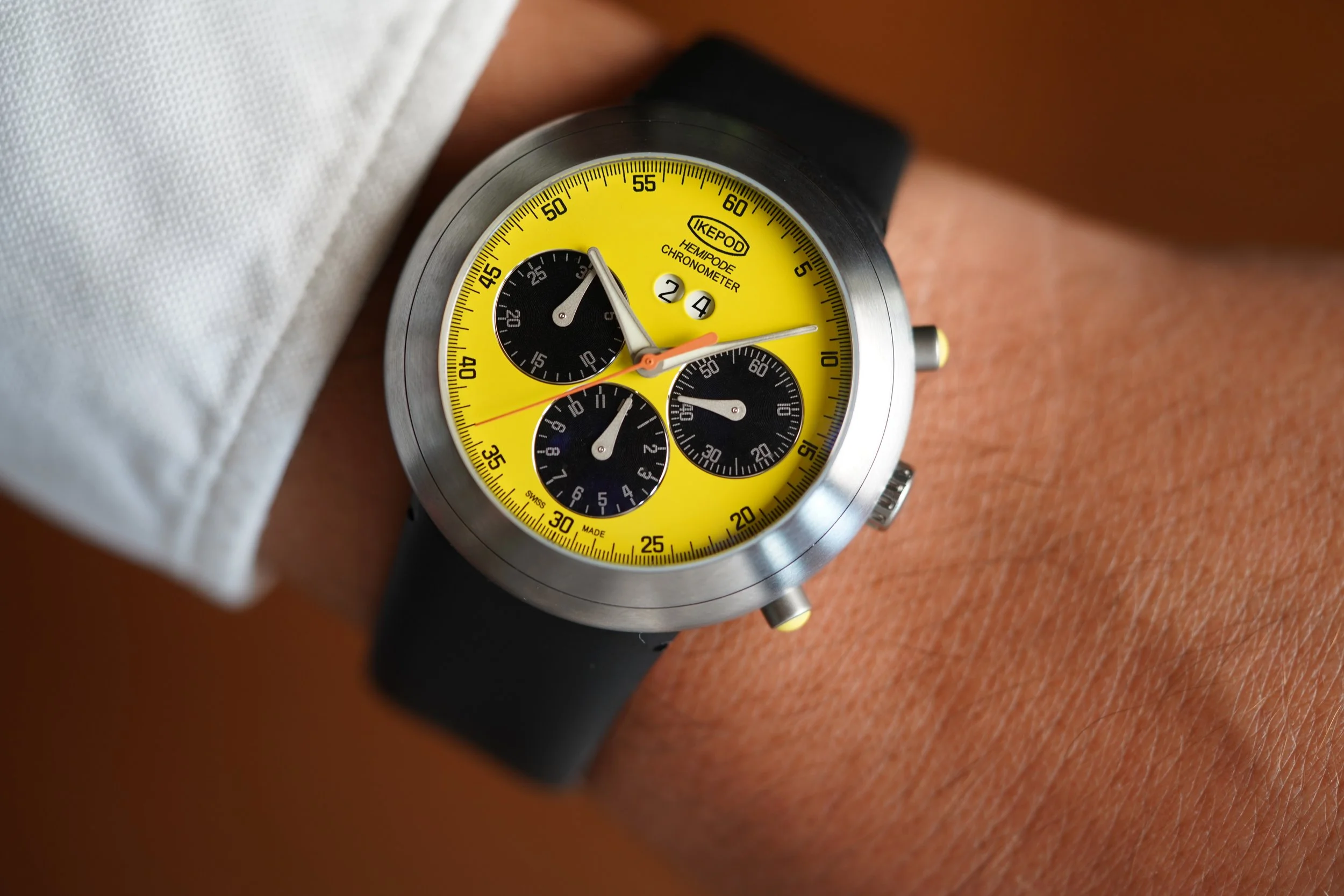 This Ikepod Hemipode Grande Date is in new old stock condition and is COSC certified. The watch features a 43mm stainless steel case and a 4500 Dubois Depraz movement with a chronograph function. The watch features a Yellow dial, with black subsidiary dials and an orange chronograph hand. It is a special edition piece in like-new condition.