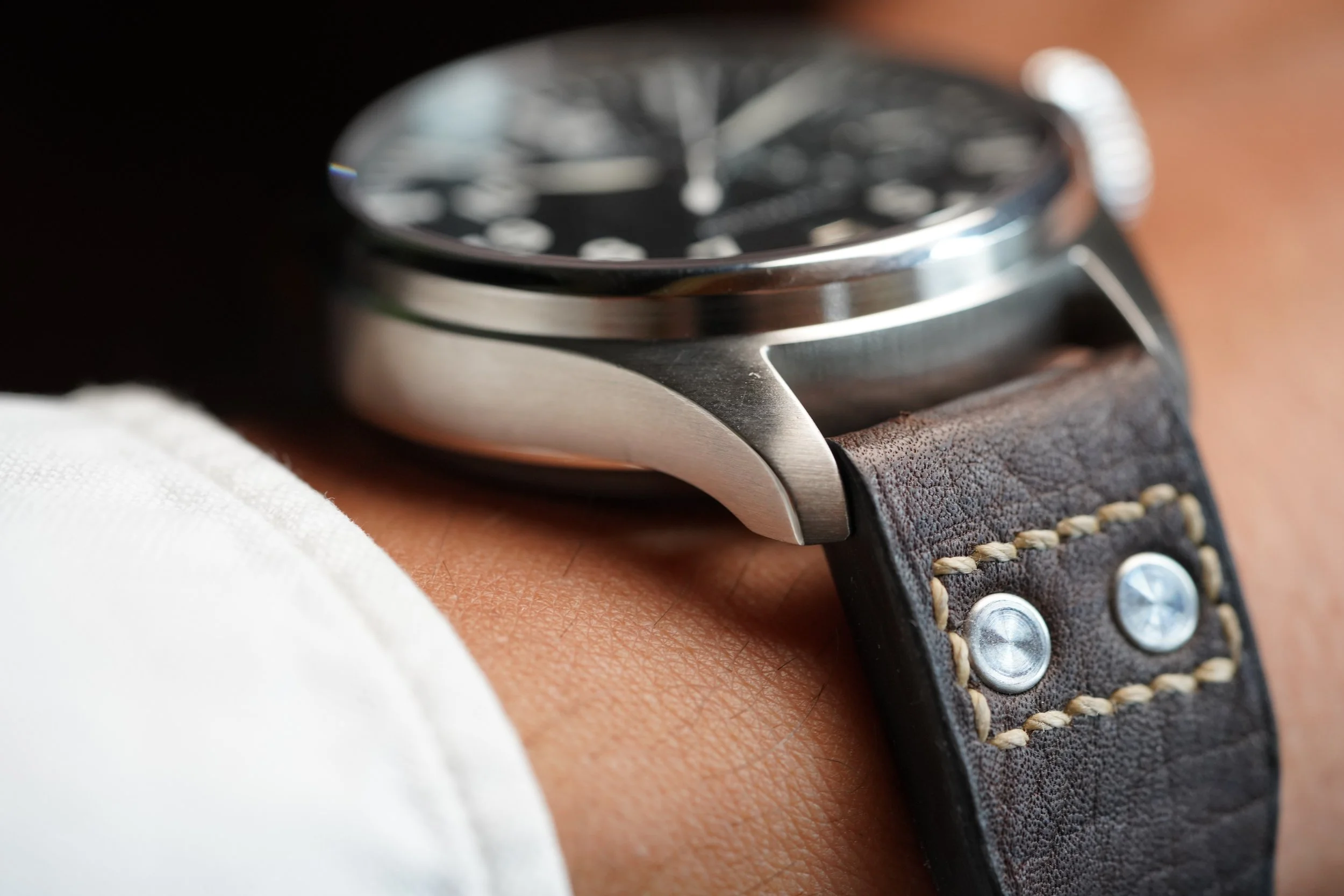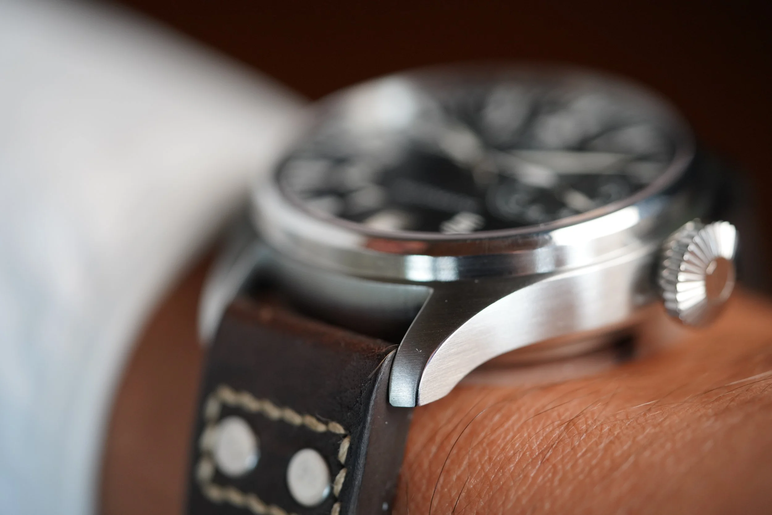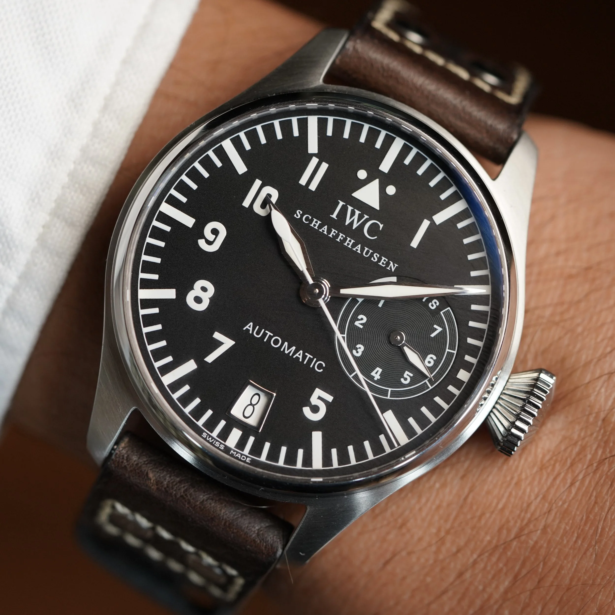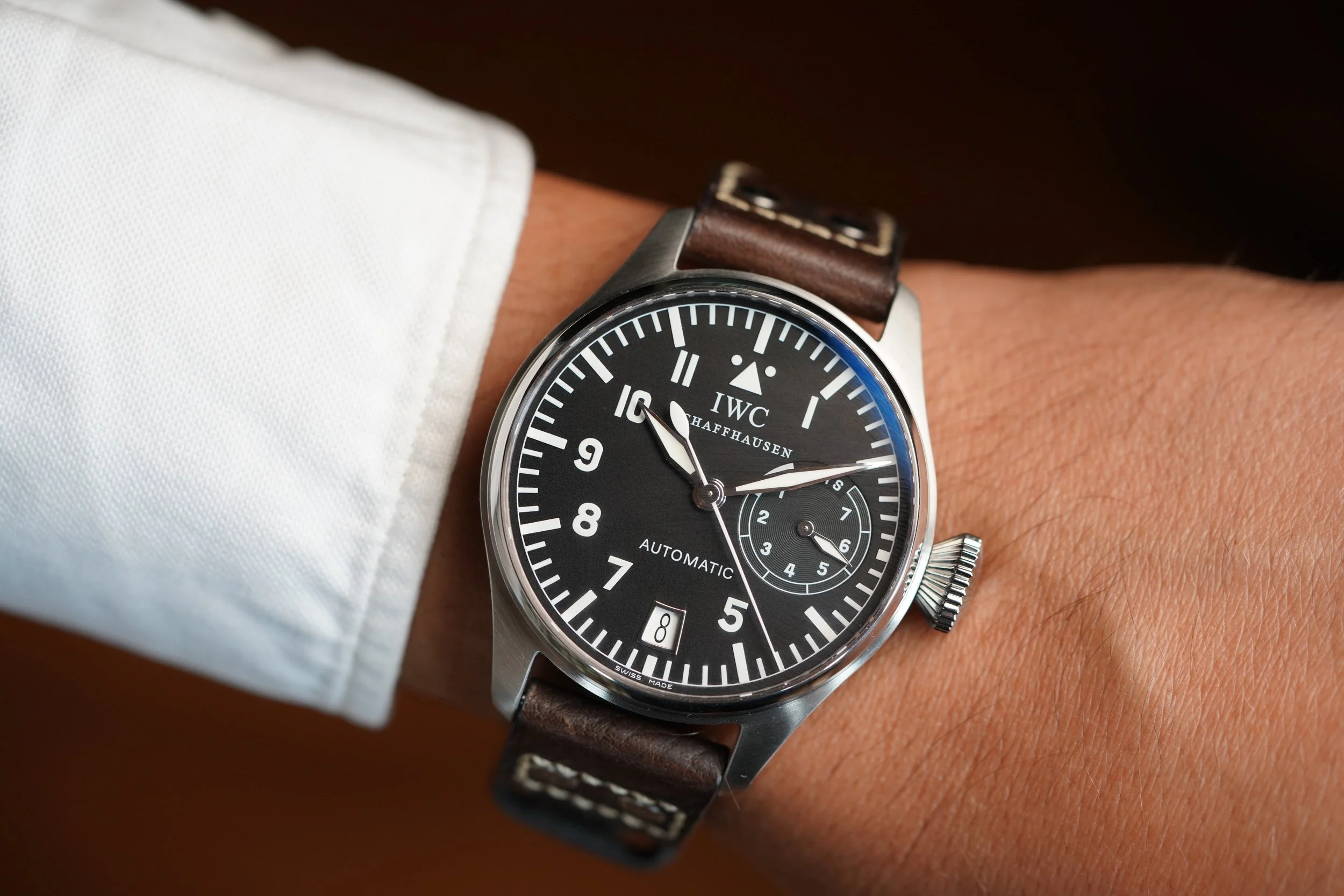 I am not going to lie to you, I like the IWC Big Pilot. It is a watch that tells everyone “I know about the Submariner and Patek Philippe watches, but I am going full IWC”. Your enemies will be forded to bow down and in deference. The case has been polished. It measures 46mm in diameter. Big Sucker! The watch dates to circa 2003.