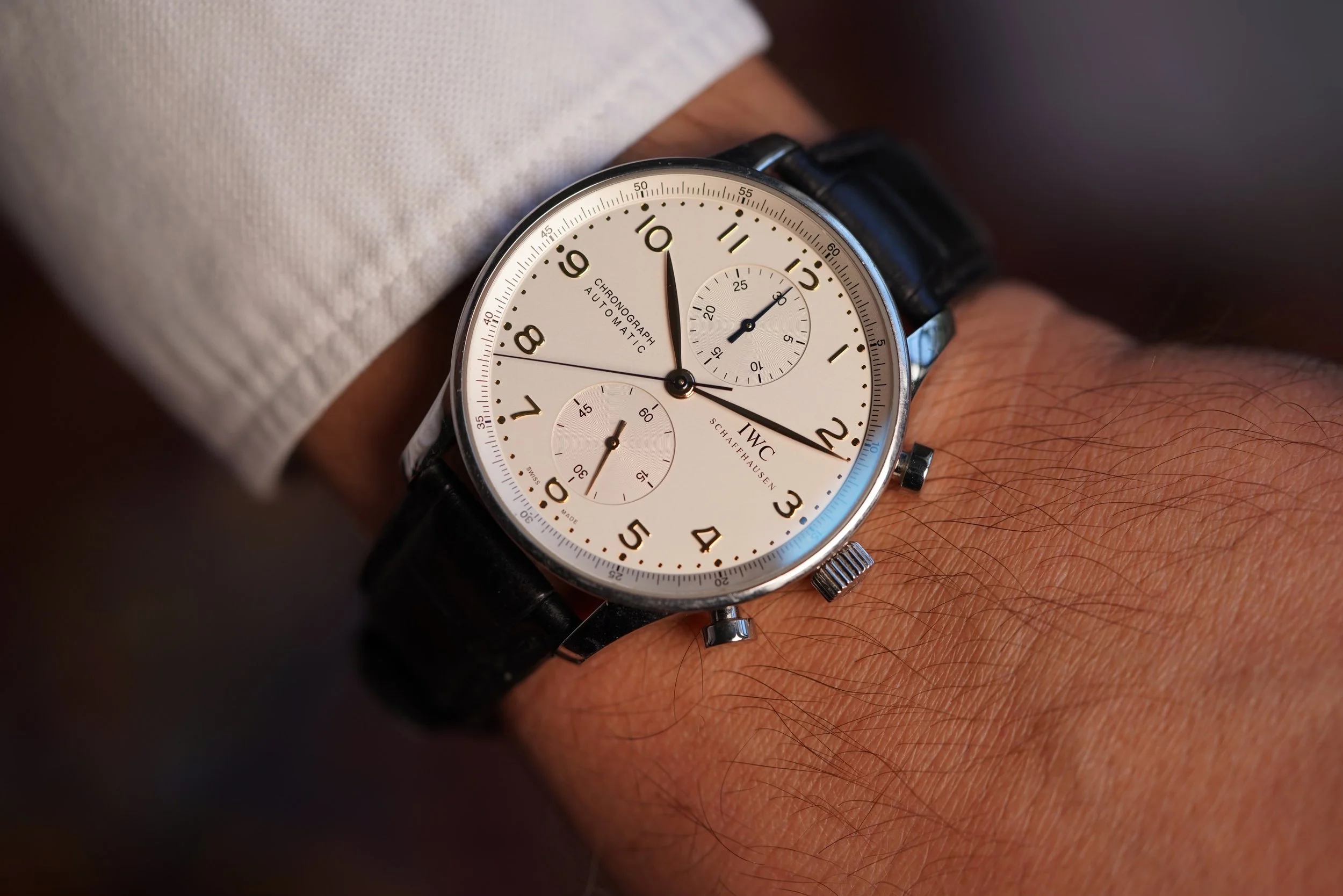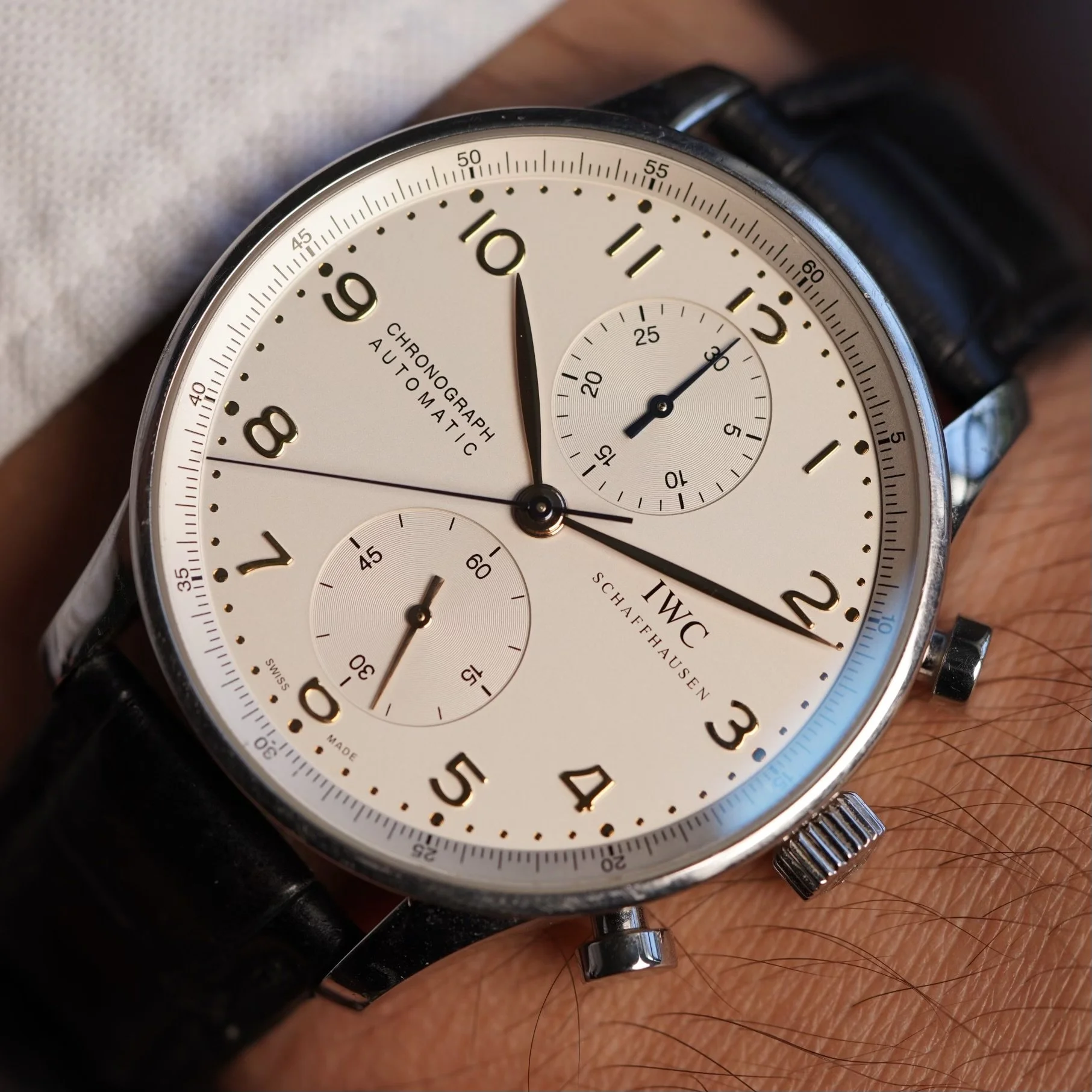 This IWC Portuguese chronograph reference IW371401 is a great modern timepiece. The watch could certainly be worn in a more casual or dressed up manner. The stainless steel case is unpolished and measures 41mm in diameter.